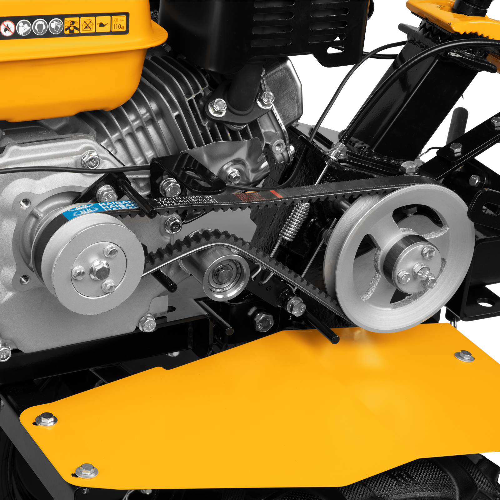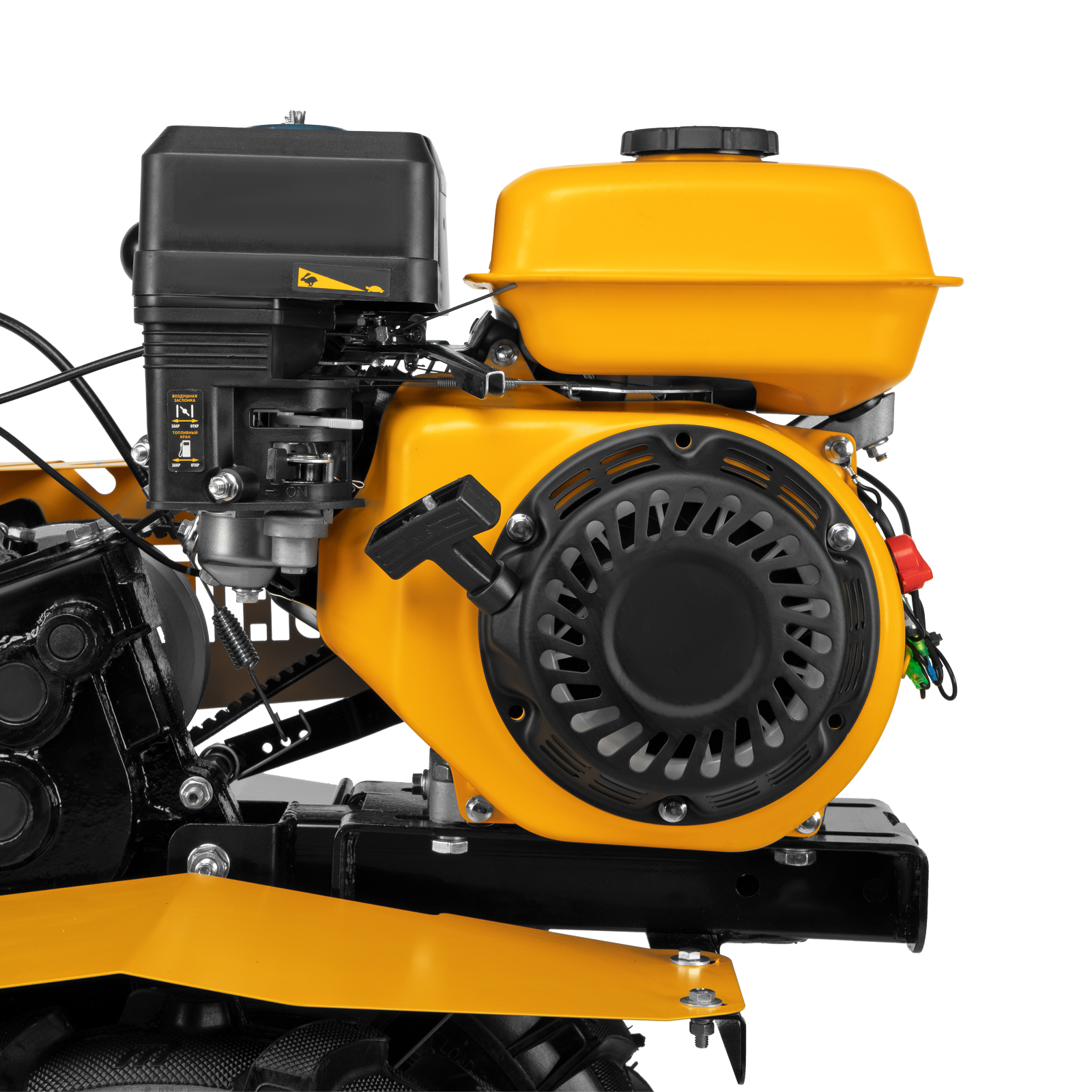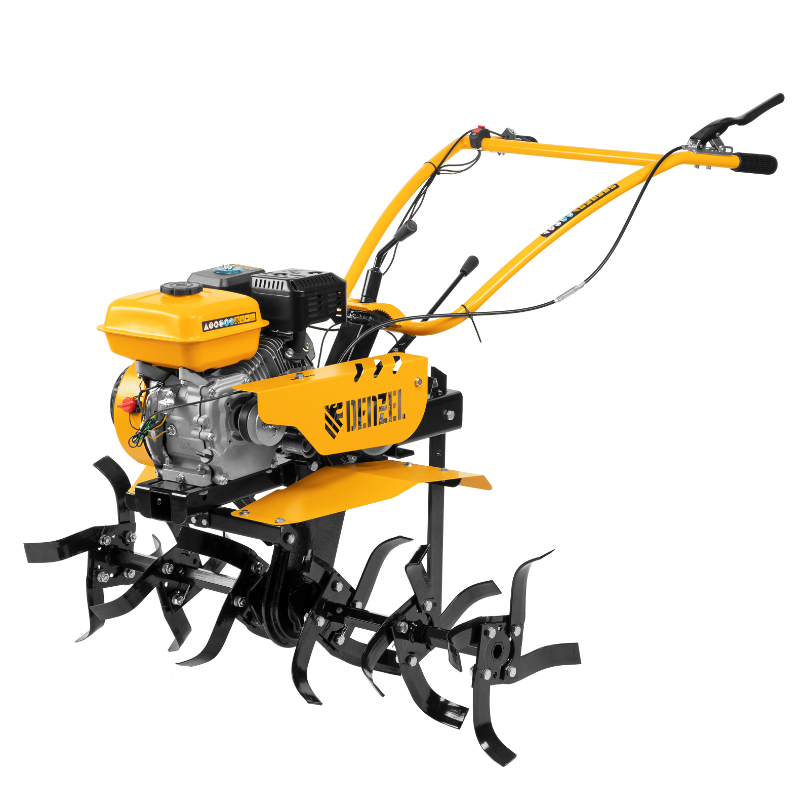 Мотоблок Denzel DPT-270S 56442 с двигателем объемом 212 см3 и мощностью 7 л. с., ременным механизмом сцепления, фрезами 3 х 4, шкивом отбора мощности (ШОМ) и коробкой передач 2В/1Н предназначен для проведения сельскохозяйственных работ. Максимальная ширина обработки составляет 1000 мм. Фрезы собираются из двух двойных и двух одинарных секций, что позволяет регулировать ширину вспашки. Шкив отбора мощности и универсальный кронштейн диаметром 30 мм позволяют установить различное навесное оборудование: плуг, окучник, картофелевыкапыватель, а также грунтозацепы и удлинители осей. Совместимые артикулы: Denzel 59901, 59902, 59903, 59904, 59905, 59906, 59907, 59908. Такое решение значительно расширяет возможности мотоблока и позволяет минимизировать расходы на закупку сельскохозяйственной техники.Преимущества Надежность — мощный 4-тактный двигатель серии Long Life обеспечивает длительную стабильную работу мотоблока. Долговечность — система защиты не позволит запустить двигатель при низком уровне масла. Эффективная работа — благодаря усиленному шестеренчато-цепному редуктору с чугунным корпусом мотоблок успешно справляется даже с плотным, глинистым грунтом. Безопасность — защитные крылья предотвращают вылет из-под колес комьев земли и твердых предметов. Настраиваемая глубина вспашки — степень погружения фрез в почву можно задать, отрегулировав сошник по высоте. Защита двигателя от поломки — воздушный фильтр препятствует попаданию в цилиндр твердых частиц. Удобная работа — основные элементы управления расположены на рукоятках, для включения сцепления и регулировки оборотов двигателя не нужно наклоняться. Маневренность — две скорости вперед и одна назад, а также пневматические колеса обеспечивают повышенную проходимость. Комфорт пользователя — руль регулируется в 2-х плоскостях, что позволяет установить его в наиболее удобное положение. Гарантия 3 года — надежность техники подтверждена производителем.