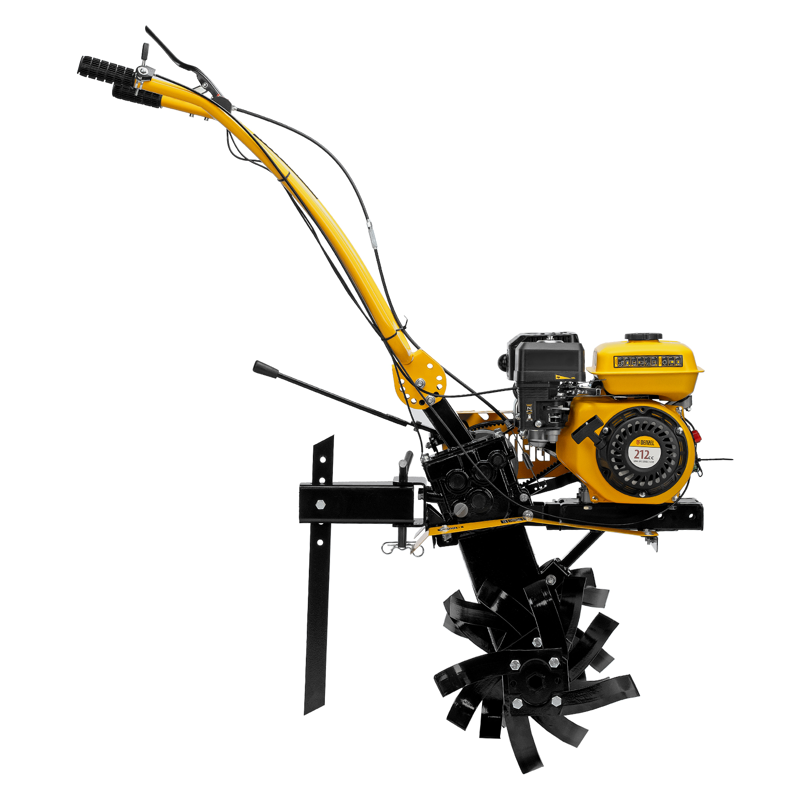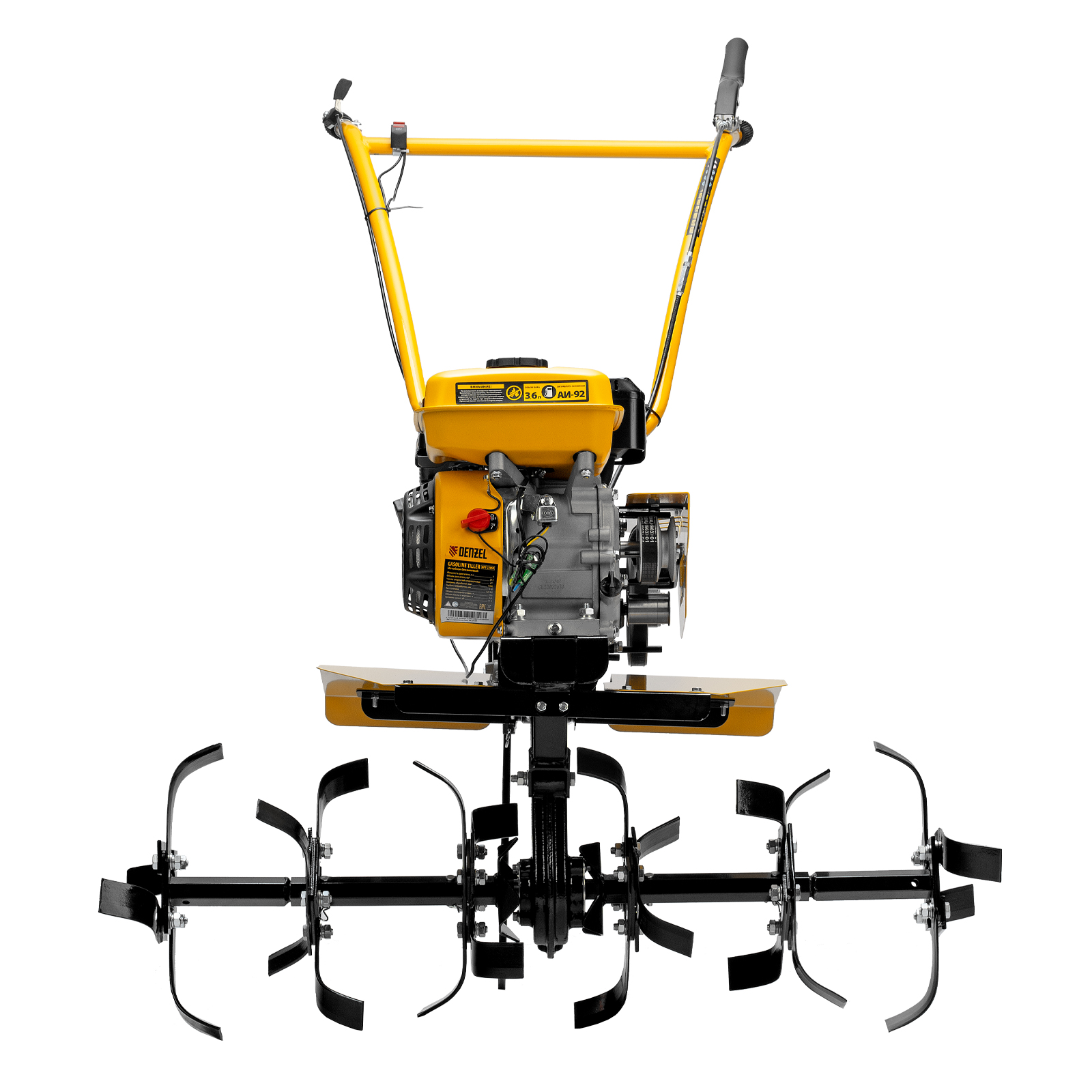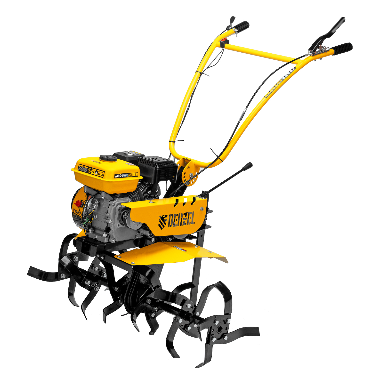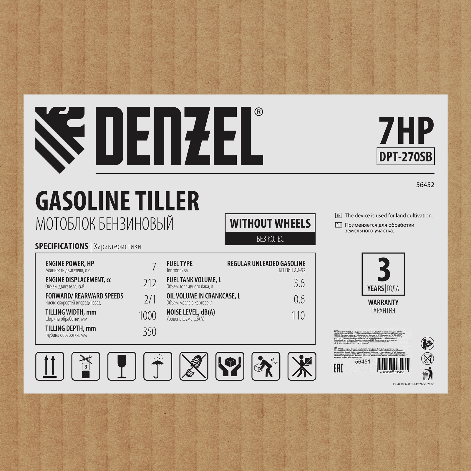 Мотоблок Denzel DPT-270SB 56452 мощностью 7 л.с., с ременным механизмом сцепления, оснащен фрезами 3 х 4, шкивом отбора мощности (ШОМ) и коробкой передач 2В/1Н. Предназначен для выполнения земляных работ: рыхления, вспахивания, прополки и т. д. Успешно справляется даже с плотной, глинистой почвой. Разборные фрезы с дополнительными секциями позволяют регулировать ширину обработки до 1 м.Чугунный шестеренчато-цепной редуктор позволяет работать длительное время с большими нагрузками, шкив отбора мощности и кронштейн диаметром 30 мм позволяют подключать активное навесное оборудование. При помощи универсальной сцепки мотоблок агрегатируется с различным навесным оборудованием Denzel: плугом, окучником, картофелевыкапывателем (совместимые артикулы 59905, 59911, 59906, 59907, 59912, 59908, 59913). Тем самым можно сократить расходы на приобретение сельскохозяйственной техники. Повысить проходимость можно при помощи грунтозацепов 59901, 59914, 59915, 59916, 59917. Установка прицепа Denzel 59950 позволяет использовать мотоблок для перемещения по участку и транспортировки грузов.ПреимуществаНадежность — мощный и экономичный 4-тактный двигатель серии Long Life с воздушным охлаждением обеспечивает стабильную работу на протяжении длительного времени.Высокая прочность — 6 рядов фрез из закаленной стали не деформируются при высоких нагрузках, подходят для обработки любого грунта и не требуют повторной заточки. Система защиты от поломки — двигатель не запустится при низком уровне масла. Маневренность — 2 скорости вперед и 1 назад обеспечивают уверенное передвижение по участку. Настраиваемая глубина вспахивания — отрегулировав сошник по высоте, можно задать степень погружения фрез до 350 мм. Безопасность пользователя — защитные крылья предотвращают вылет комьев земли и других предметов. Удобная эксплуатация — основные элементы управления вынесены на рукоятки. Комфортное использование — руль регулируется в вертикальной плоскости, что позволяет установить оптимальную высоту в зависимости от роста пользователя. Гарантия 3 года — надежность техники подтверждена производителем.