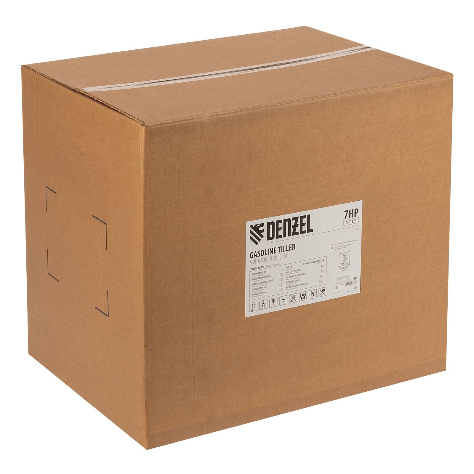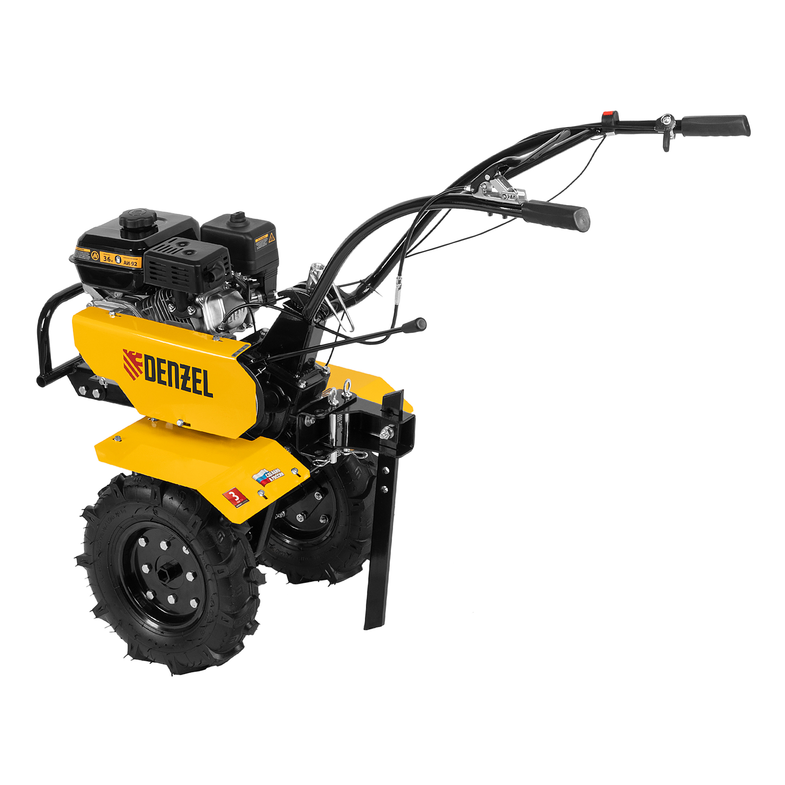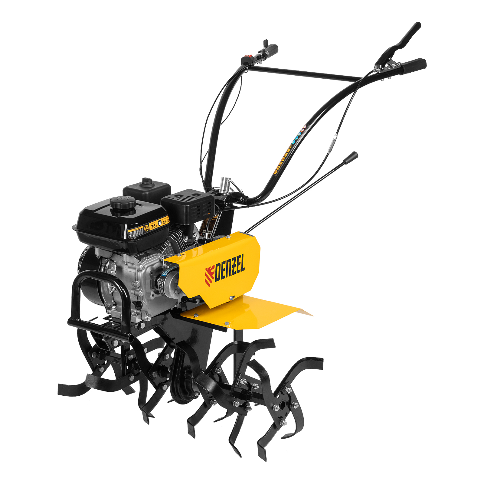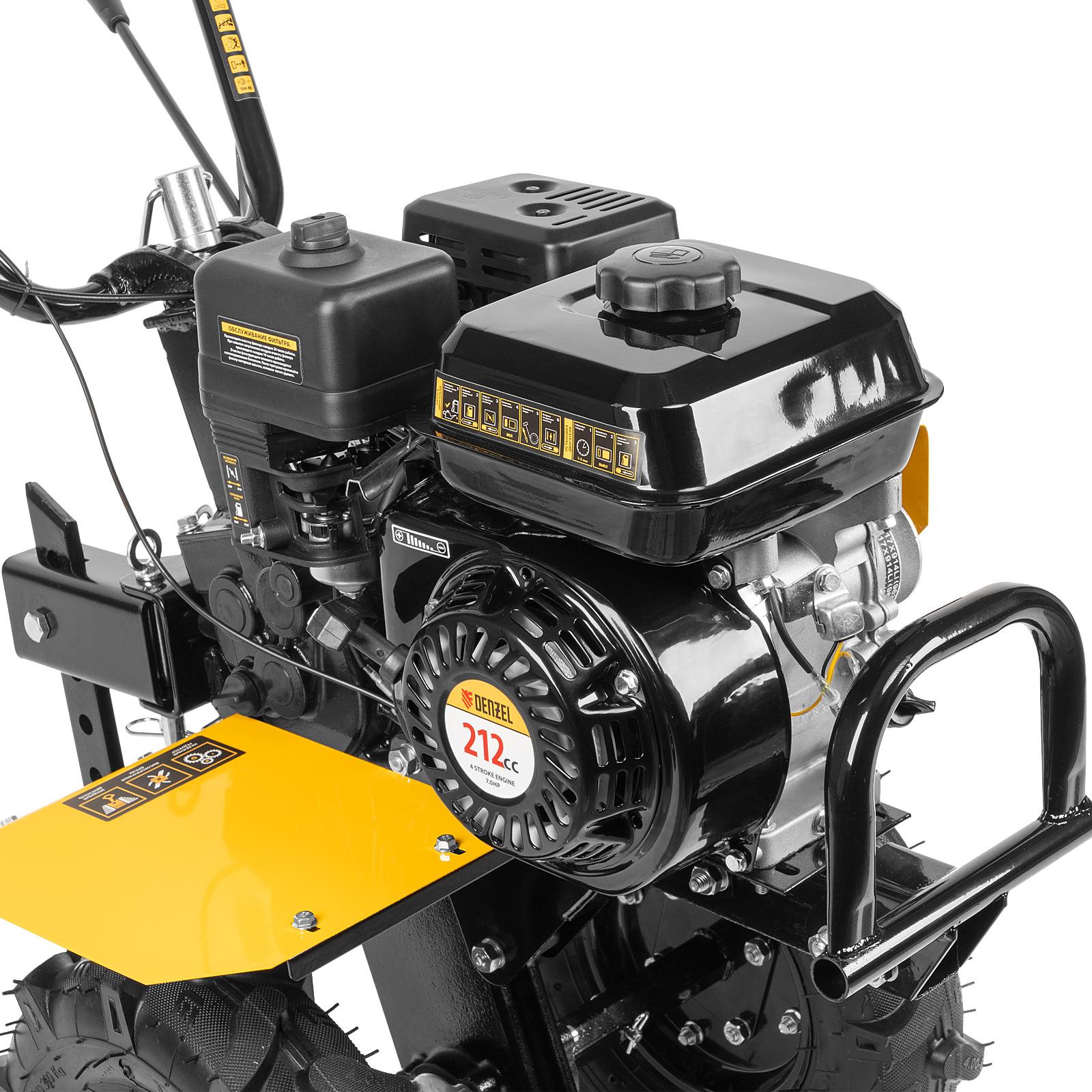 Мотоблок Denzel DPT-170 56431 с двигателем объемом 212 см3 и мощностью 7 л.с., ременным сцеплением, шкивом отбора мощности (ШОМ) и коробкой передач 2В/1Н используется для проведения различных сельскохозяйственных работ. Удобен для обработки участков большой площади: в комплект поставки входит 18 высокопрочных фрез, обеспечивающих ширину вспахивания 85 см и глубину 35 см.,Возможность установки различного навесного оборудования, в том числе активного, значительно расширяет возможности мотоблока и позволяет снизить расходы на приобретение сельскохозяйственной техники. Техника совместима со всеми моделями навесного оборудования, представленного в ассортименте Denzel (приобретается отдельно). Установив прицеп Denzel 59950, мотоблок можно использовать в качестве транспортного средства.ПреимуществаУверенное передвижение по участку — 2 скорости вперед и 1 назад позволяют работать на разном грунте, а также быстро и легко извлекать фрезы.Долговечность — мощный и экономичный двигатель серии Long Life обеспечивает стабильную работу, алюминиевый редуктор выдерживает высокие нагрузки.Защита двигателя от поломки — мотоблок не запустится при низком уровне масла в картере.Удобное использование — основные элементы управления вынесены на руль.Мобильность — производитель предусмотрел колеса повышенной проходимости.Комфортная транспортировка — усиленная рукоятка-бампер упрощает перемещение мотоблока по участку.Гарантия 3 года — надежность техники подтверждена производителем.