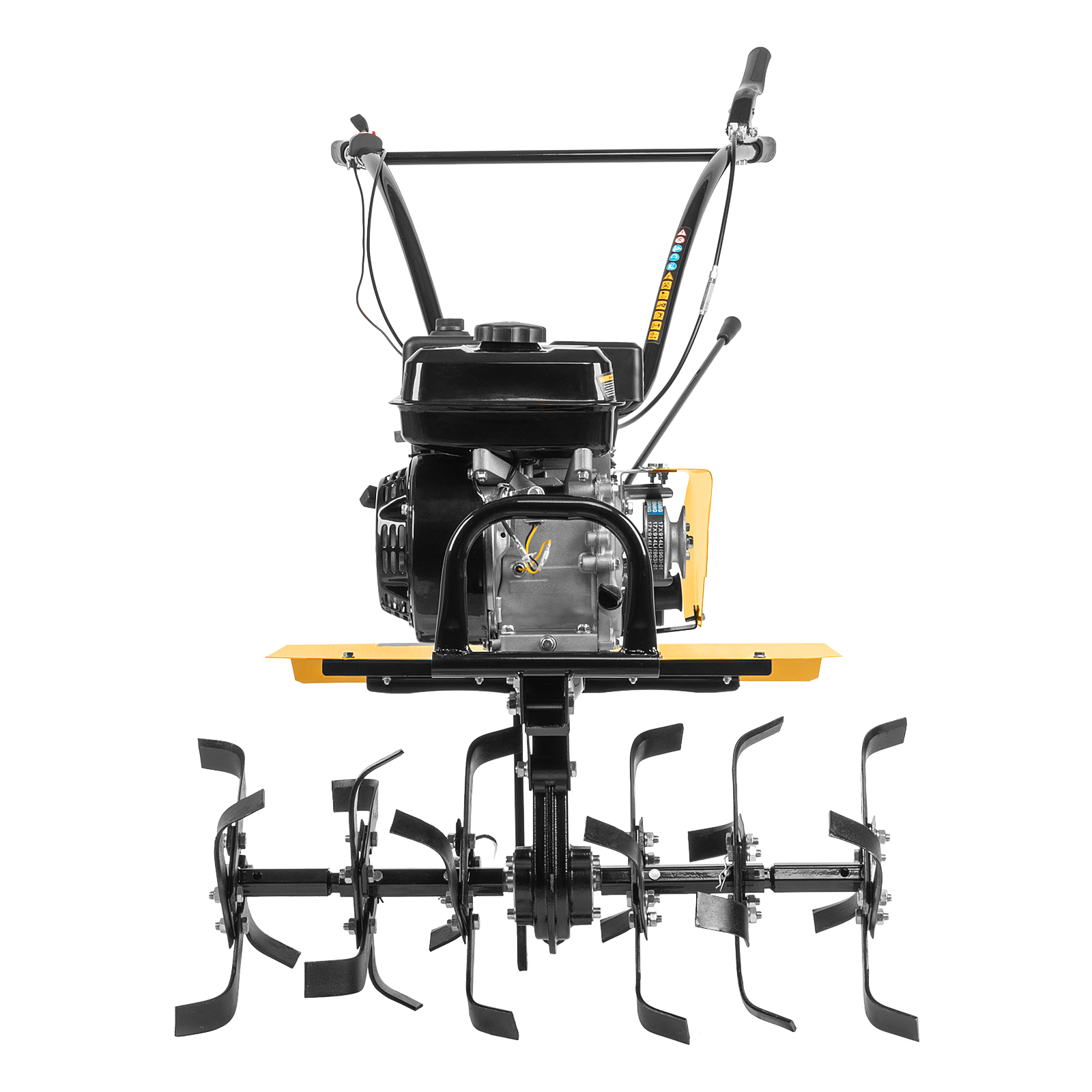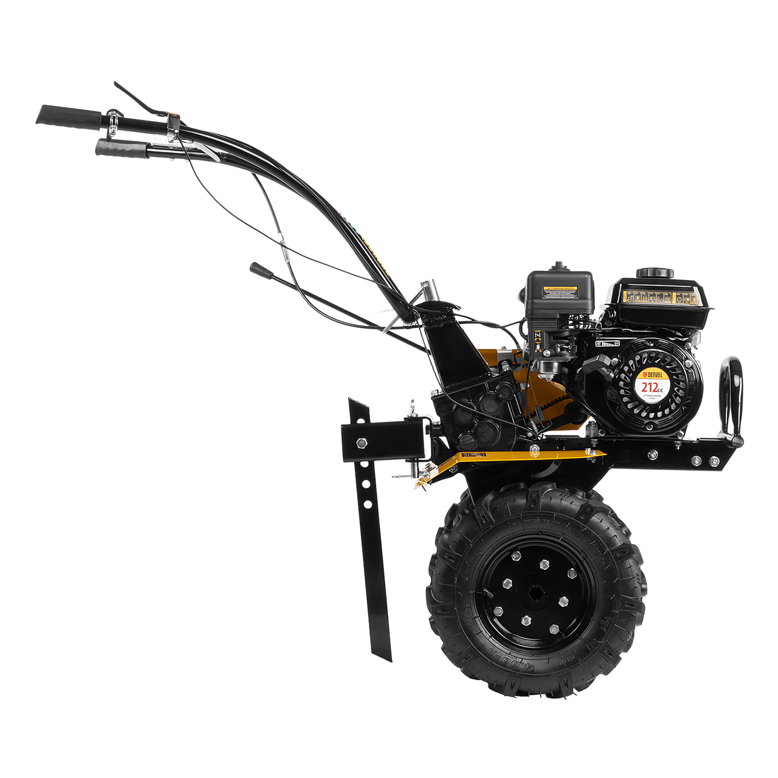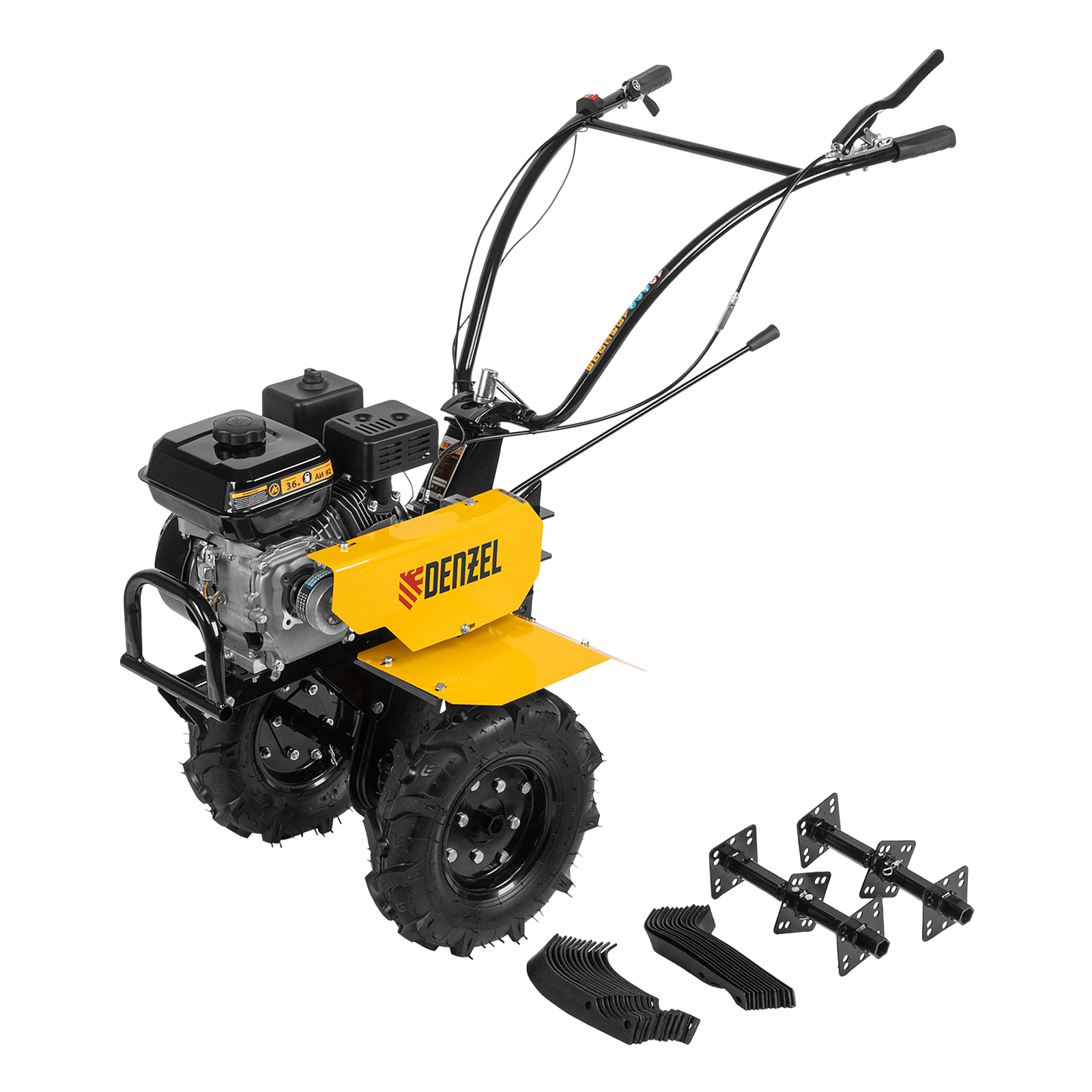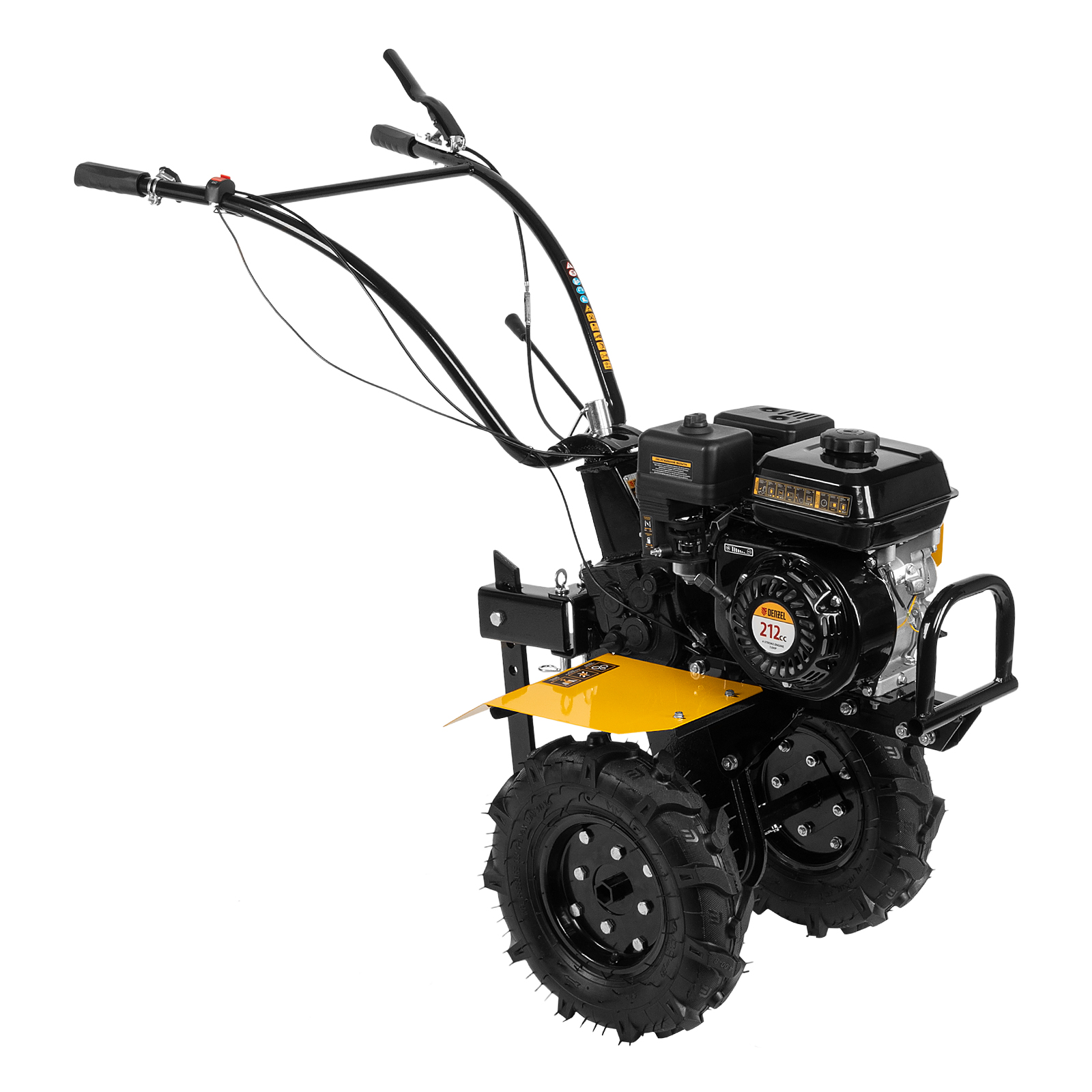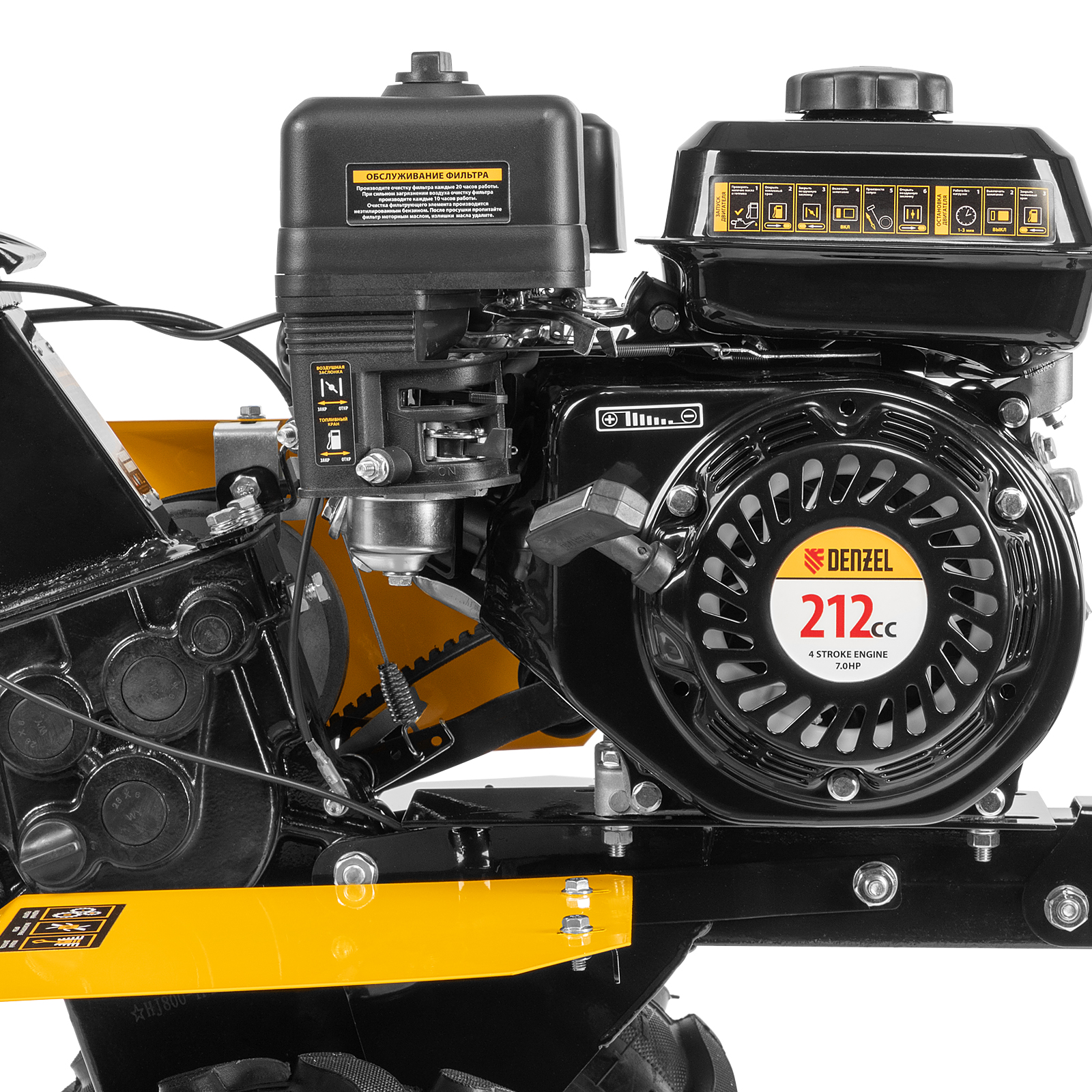 Мотоблок Denzel DPT-170 56431 с двигателем объемом 212 см3 и мощностью 7 л.с., ременным сцеплением, шкивом отбора мощности (ШОМ) и коробкой передач 2В/1Н используется для проведения различных сельскохозяйственных работ. Удобен для обработки участков большой площади: в комплект поставки входит 18 высокопрочных фрез, обеспечивающих ширину вспахивания 85 см и глубину 35 см.,Возможность установки различного навесного оборудования, в том числе активного, значительно расширяет возможности мотоблока и позволяет снизить расходы на приобретение сельскохозяйственной техники. Техника совместима со всеми моделями навесного оборудования, представленного в ассортименте Denzel (приобретается отдельно). Установив прицеп Denzel 59950, мотоблок можно использовать в качестве транспортного средства.ПреимуществаУверенное передвижение по участку — 2 скорости вперед и 1 назад позволяют работать на разном грунте, а также быстро и легко извлекать фрезы.Долговечность — мощный и экономичный двигатель серии Long Life обеспечивает стабильную работу, алюминиевый редуктор выдерживает высокие нагрузки.Защита двигателя от поломки — мотоблок не запустится при низком уровне масла в картере.Удобное использование — основные элементы управления вынесены на руль.Мобильность — производитель предусмотрел колеса повышенной проходимости.Комфортная транспортировка — усиленная рукоятка-бампер упрощает перемещение мотоблока по участку.Гарантия 3 года — надежность техники подтверждена производителем.