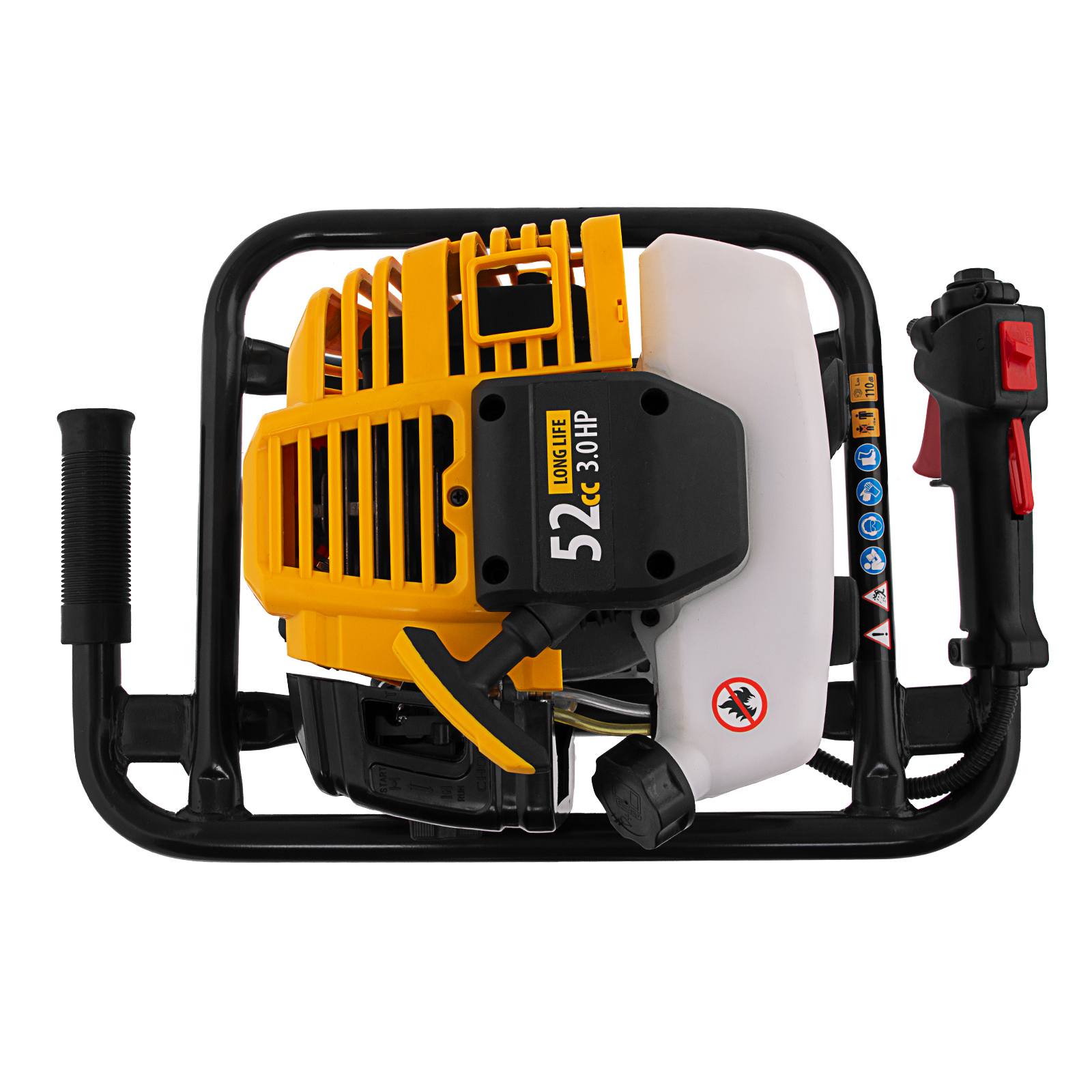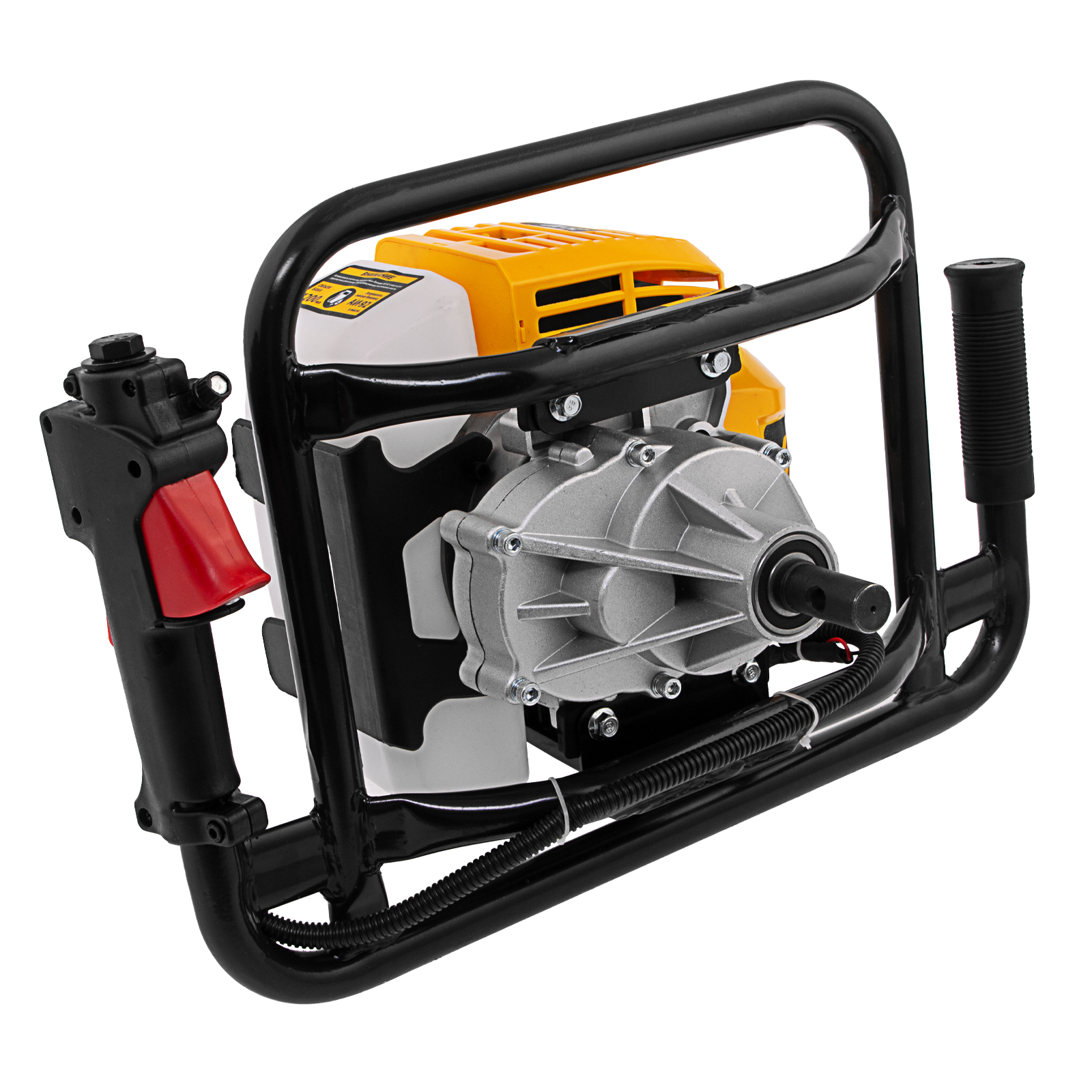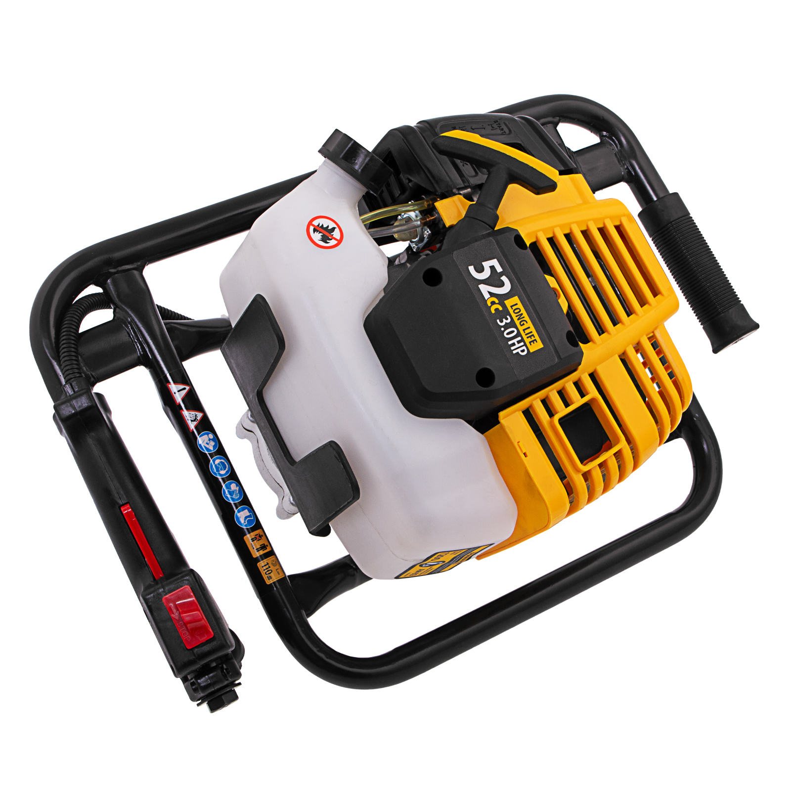 Мотобур Denzel DX-52 56001 с объемом двигателя 52 см3 и диаметром соединения 20 мм предназначен для получения отверстий и углублений во льду или в грунте максимальным диаметром 300 мм. Мощный и экономичный двигатель мощностью 3 л. с. позволяет эффективно решать поставленные задачи. Для бурения отверстий диаметром более 150 мм и глубиной более 1 м предусмотрена возможность управления мотобуром двумя пользователями. Устройство будет полезно на строительной площадке, загородном участке, пригодится также во время зимней рыбалки.ПреимуществаНадежная конструкция — корпус из высококачественного ударопрочного пластика и рама устойчивы к механическим воздействиям, усиленный редуктор рассчитан на интенсивное использование.Мощный и экономичный двигатель — техника обеспечивает высокую эффективность работы и низкий расход топлива.Удобное управление — выключатель зажигания и курок газа расположены на правой рукоятке.Безопасность пользователя — блокиратор курка газа препятствует случайному запуску шнека.Праймер подкачки топлива — двигатель легко запустится в холодную погоду или после долгого простоя.Легкая установка оснастки — благодаря быстросъемному соединению шнек фиксируется на выходному валу за несколько секунд.Быстрая подготовка к работе — мотобур поставляется в сборе, достаточно добавить смазку при необходимости, установить шнек и залить топливо в бак (шнек в комплект не входит).Удобное приготовление топливной смеси — специальный дозатор входит в комплект поставки.Решение широкого спектра задач — выходной вал диаметром 20 мм совместим со шнеками для грунта и льда, а также с удлинителями соответствующего присоединительного размера.Простое обслуживание — конструкцией предусмотрен легкий доступ к воздушному фильтру для его осмотра и очистки.Комфортная работа — оптимизированная антивибрационная система снижает нагрузку на руки.Гарантия 3 года — надежность мотобура подтверждена производителем.