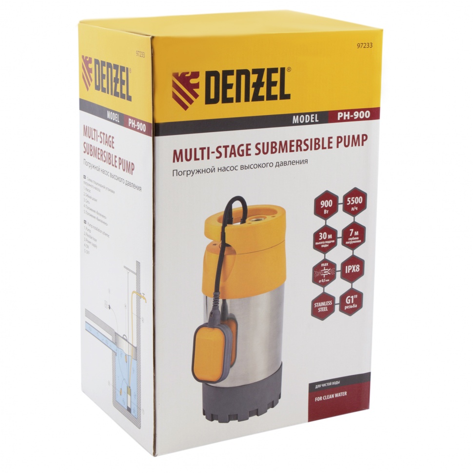 Погружной насос высокого давления Denzel PH900 97233 мощностью 900 Вт и производительностью 5500 л/ч обеспечивает напор до 30 м и используется для подъема чистой воды из колодцев, резервуаров и водоемов с глубины до 7 м. Скорости работы до 91 л/мин достаточно для организации системы орошения и водоснабжения в частном доме с несколькими точками разбора воды. Высота напора до 30 м позволяет использовать насос в местах, где источник воды находится далеко, или для повышения давления в водопроводной системе.ПреимуществаНадежность — корпус из нержавеющей стали, торцевое уплотнение из карбида кремния, импеллеры из стеклонаполненного пластика и медная обмотка двигателя рассчитаны на длительное использование.Автономная работа — конструкцией предусмотрен поплавковый выключатель, обеспечивающий защиту от сухого хода.Термозащита — двигатель автоматически отключается при перегреве, что предотвращает его поломку.Безопасность — сетевой кабель с проводом заземления предохраняет пользователя от поражения электрическим током.Герметичность — насосу присвоена степень защиты IPX8, а значит, внутренние компоненты надежно защищены от попадания воды.Быстрая подготовка к работе — достаточно прикрепить трос к ручке и опустить насос в колодец вертикально до полного погружения в воду.Компактность — устройство удобно для использования в узких колодцах.Длина кабеля 10 м — насос можно погружать даже в глубокие резервуары и колодцы.Удобная транспортировка и погружение — устройство весит 8 кг и снабжено удобной ручкой.Гарантия 3 года — высококачественное исполнение подтверждено производителем.