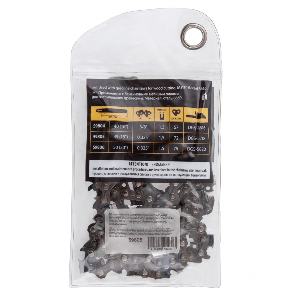 Цепь Denzel 59805 состоит из 72 звеньев с шагом 0,325", под паз 1,5 мм, и предназначена для бензопилы Denzel DGS-5218 с шиной длиной 45 см (18"). Конструкция звеньев обеспечивает снижение вибраций во время работы и комфортное пиление. Цепь устанавливается на шину бензопилы, использующейся для проведения ремонтных, строительных работ, валки деревьев, ухода за насаждениями в саду.ПреимуществаНадежность — цепь изготовлена из высокопрочной легированной стали.Долговечность — режущее звено имеет серпообразную форму, что препятствует быстрому износу и загрязнению цепи.Лазерная заточка зубьев — пильная гарнитура обеспечивает неизменно высокую производительность инструмента и предотвращает перегрев двигателя.Эффективная смазка — технология автоматической подачи масла к цепи замедляет ее износ.Безопасность — цепь поставляется в защитной упаковке, предотвращающей случайные травмы.