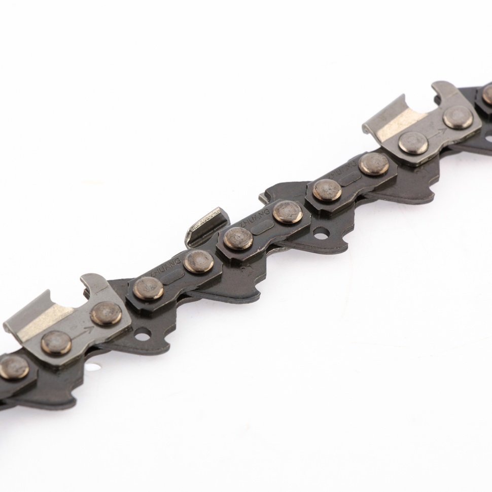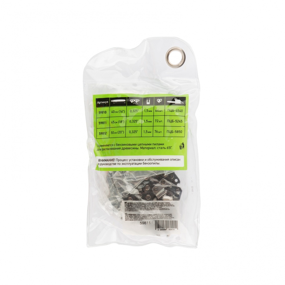 Цепь Сибртех 59811 используется в качестве сменного режущего элемента для бензопилы Сибртех ПЦБ-5245. Состоит из 72 звеньев с шагом 0,325" и шириной паза 1,5 мм, поэтому идеально подходит для частного применения в бытовых условиях, на небольших стройках, в лесу, на рыбалке и в походах. Совместима с шинами длиной 45 см (18"). Пилу с такой цепью удобно удерживать в руках благодаря низкому уровню вибраций.ПреимуществаПрочность и устойчивость к ударным нагрузкам — цепь произведена из высококачественной стали 65Г.Защита от влаги — антикоррозионное напыление предотвращает разрушение цепи и позволяет использовать ее для распиловки льда.Простое обслуживание — серпообразный профиль звеньев облегчает заточку и делает фурнитуру более устойчивой к загрязнениям.Высокая эффективность — благодаря лазерной заточке цепь долго сохраняет остроту и позволяет добиться идеально ровного распила.Высокий рабочий ресурс — в процессе работы цепь автоматически смазывается маслом.Безопасная транспортировка и хранение — цепь поставляется в плотном пакете, защищающем пользователя от травм и препятствующем загрязнению.Продуманная упаковка — можно приобрести сразу несколько пакетов с цепями и хранить их удобным способом, например, подвесив за металлические кольца.