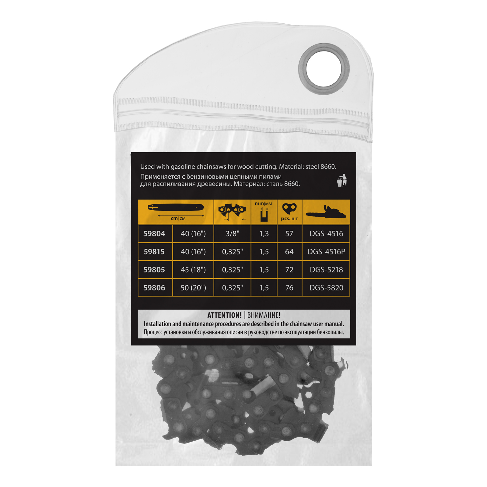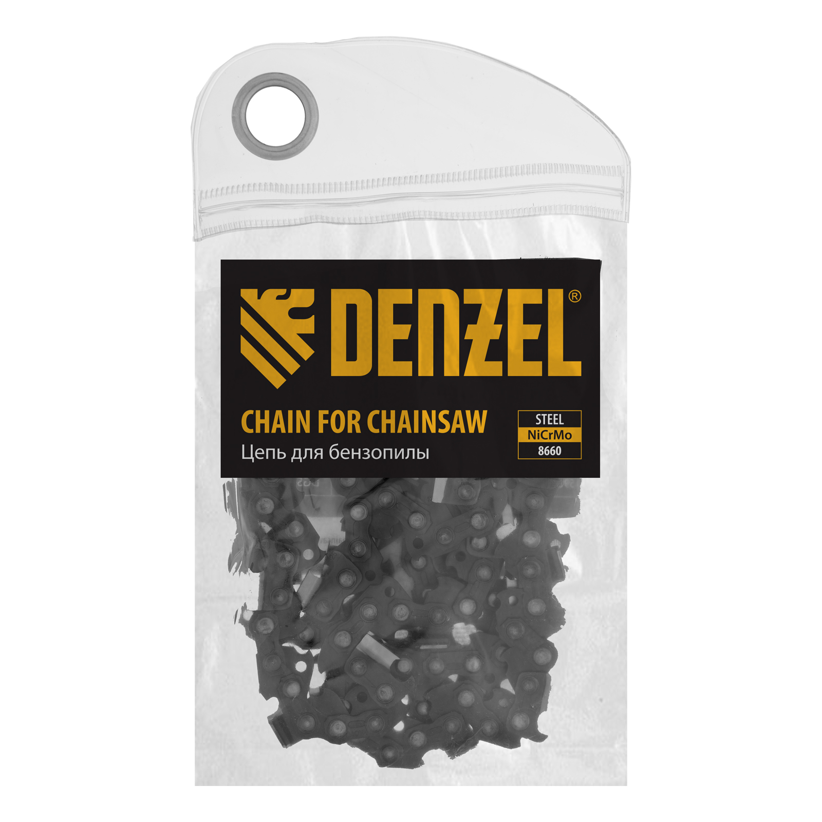 Цепь Denzel 59815 DGS-4516P состоит из 64 звеньев с шагом 0,325"", надевается на пильную шину длиной 40 см (16"") с шириной паза 1,5 мм. Оптимальна для обработки деревянных заготовок в частной мастерской, распиловки бревен, срезания сучьев и веток в саду, пригодится также на охоте и рыбалке.ПреимуществаВысокая прочность и долговечность — цепь из легированной стали выдерживает ударные нагрузки, устойчива к коррозии и может применяться даже для распиловки льда.Простое обслуживание — режущие звенья чипперного (серпообразного) типа легко затачиваются и практически не загрязняются.Длительная эффективная работа — цепь с лазерной заточкой обеспечивает ровный спил и снижает нагрузку на двигатель.Безопасное хранение и транспортировка — защитная упаковка предотвращает случайный контакт с острыми звеньями цепи.