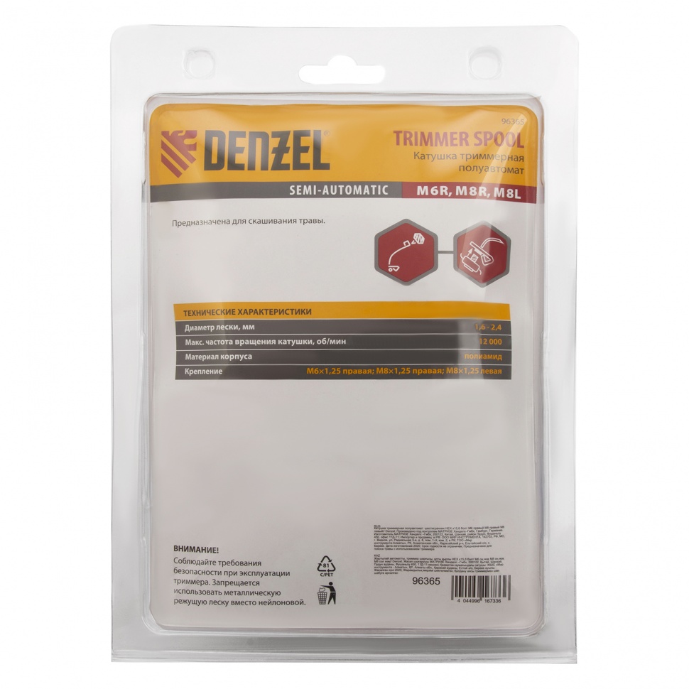 Полуавтоматическая катушка для триммера Denzel 96365 устанавливается на любые марки электрических и бензиновых кос с креплением на оси НЕХ х 15/6. Режущая леска сечением до 2 мм обеспечивает комфортное скашивание молодой травы на приусадебном участке. Преимущества:Комплект поставки включает в себя сразу 3 дополнительных болта для крепежа — М6 х 1,25 и М8 х 1,25 с правой резьбой и М8 х 1,25 с левой.Ударопрочный корпус сделан из полиамида PA6-GF30, поэтому не подвержен разрушениям, а после утилизации может быть отправлен на повторную переработку.Обновление лески происходит автоматически при легком ударе шпулей о землю, поэтому отключать триммер не придется.