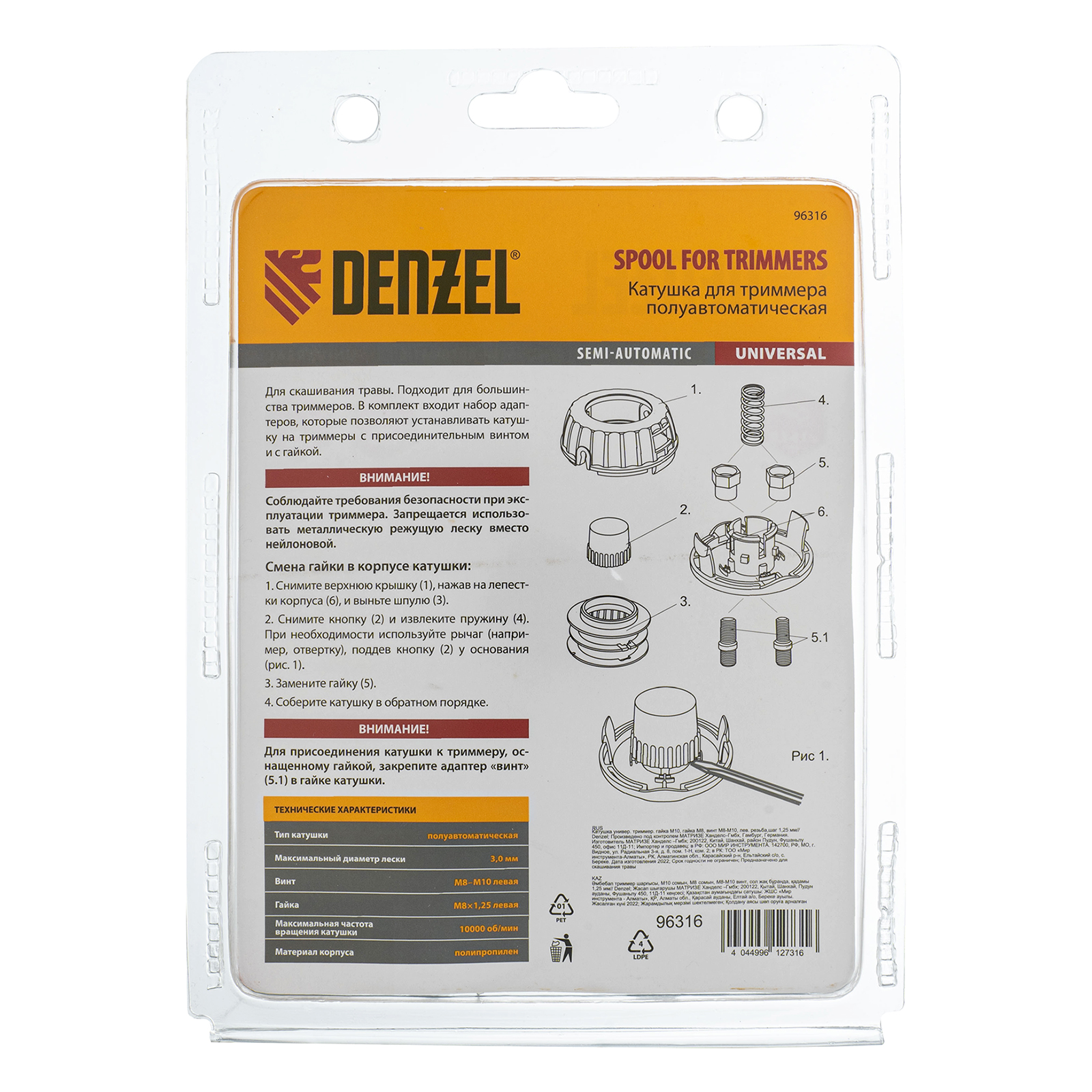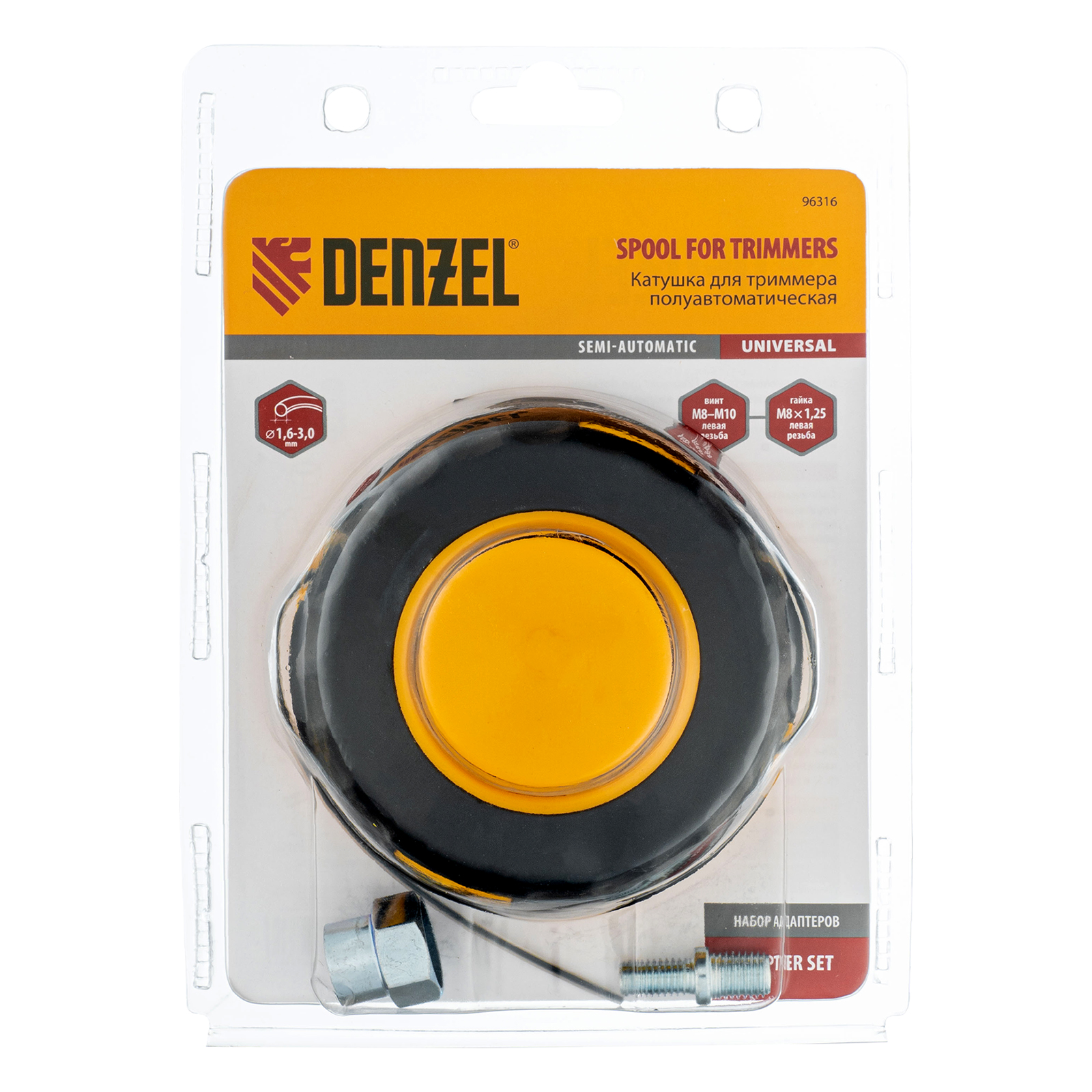 Универсальная триммерная катушка Denzel 96316 комплектуется адаптерами (гайка М10 х 1,25, гайка М8, винт М8-М10, левая резьба), поэтому совместима практически с любым электрическим и бензиновым триммером Denzel, оснащенным присоединительным винтом или гайкой. Также подходит к электро- и бензокосам от других производителей. Заправляется леской диаметром до 2,4 мм и позволяет решать большое количество задач: уход за газоном, скашивание сорняков, молодой поросли малины, старой и слежавшейся травы. Преимущества:Универсальность — катушку можно заправлять кордом с разными типами сечения, например, круглым, квадратным, треугольным, в виде звезды, клевера, витого овала.Быстрая подготовка к работе — установка и замена адаптеров осуществляется без использования дополнительного инструмента.Простая заправка — леска легко меняется на новую благодаря прорезям в крышке.Прочность — корпус из противоударного полиамида PA6-GF30 позволяет использовать триммер в овражках, ямках и участках со сложным рельефом.Полуавтоматическая подача — леска обновляется при легком ударе кнопкой на катушке о землю, поэтому отключать триммер не придется.Длина 15 м — леску не придется менять часто.