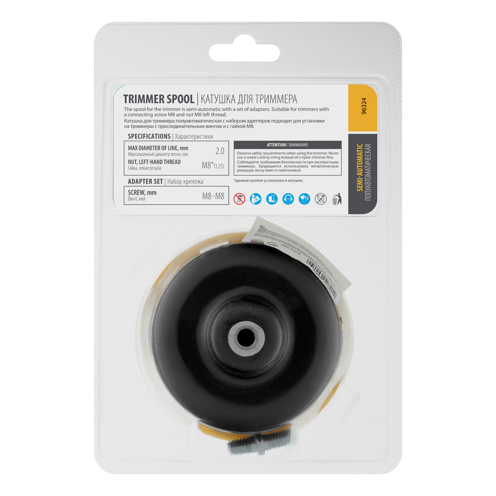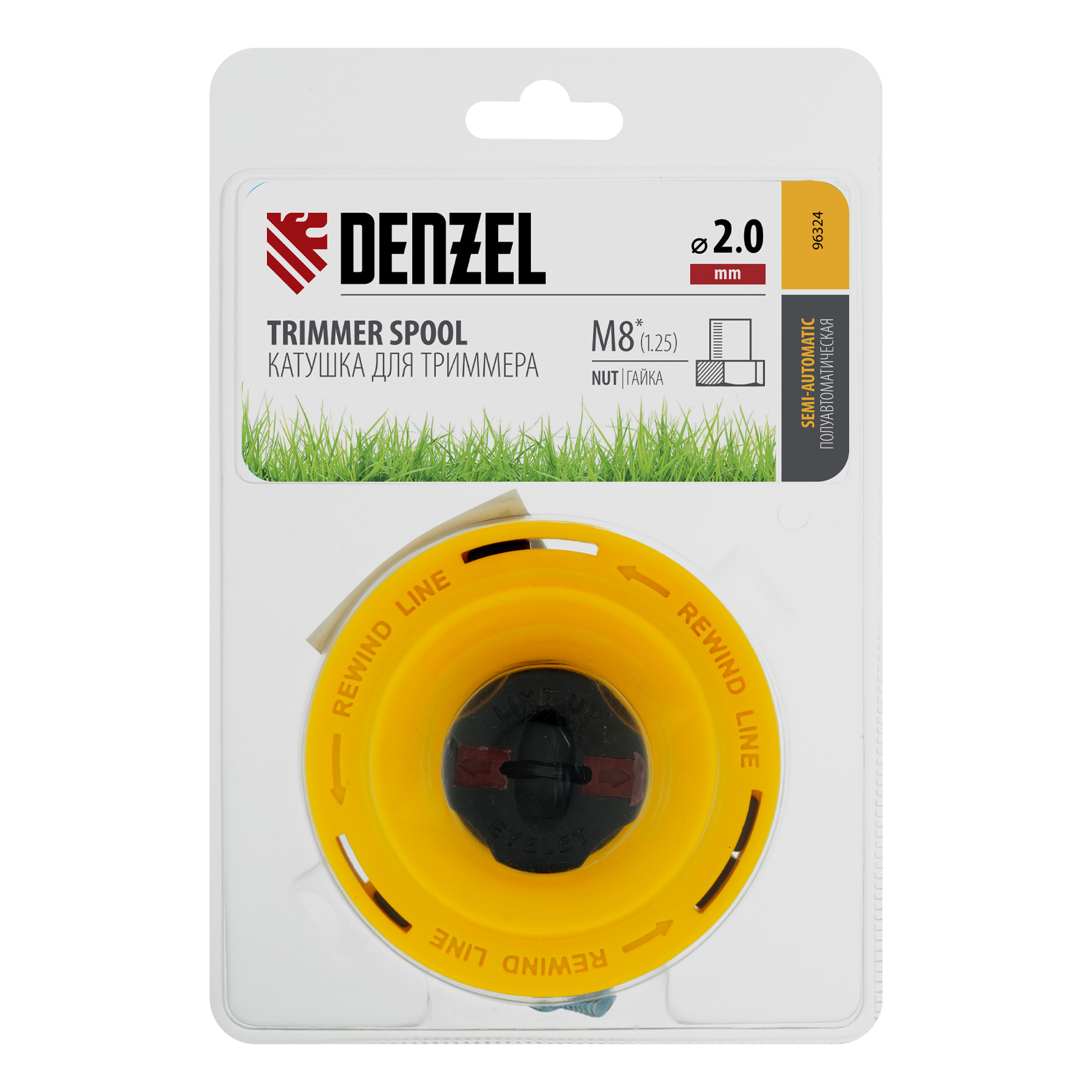 Полуавтоматическая катушка для триммера Denzel 96324 устанавливается на электрические и бензиновые косы Denzel, EFCO, Makita и модели других торговых марок с креплением М8х1,25 LH. Она комплектуется адаптером, поэтому подходит для триммеров и с присоединительным винтом, и с гайкой. Прочная леска с диаметром 2 мм обеспечивает эффективное скашивание газонной травы и удаление бурьяна. Из типов сечения лески можно выбрать: круг, квадрат, треугольник, овал и др. Преимущества:Противоударный корпус из полиамида PA6-GF30 обеспечивает защиту от появления сколов и преждевременного износа катушки.Срок эксплуатации увеличен за счет высокопрочной металлической кнопки, на которую приходятся удары о землю.Полуавтоматическая система обновления лески позволяет быстро увеличить ее длину, не останавливая двигатель.Леска легко заправляется в катушку и не требует снятия крышки.Адаптеры устанавливаются быстро, без использования дополнительного инструмента.Технология Easy Line — леска быстро заправляется, снимать катушку с триммера и разбирать ее не придется.Катушка вмещает до 15 м лески, поэтому ее хватит на 1 сезон при нечастом использовании.Благодаря малому весу 245 г катушка не утяжеляет триммер.