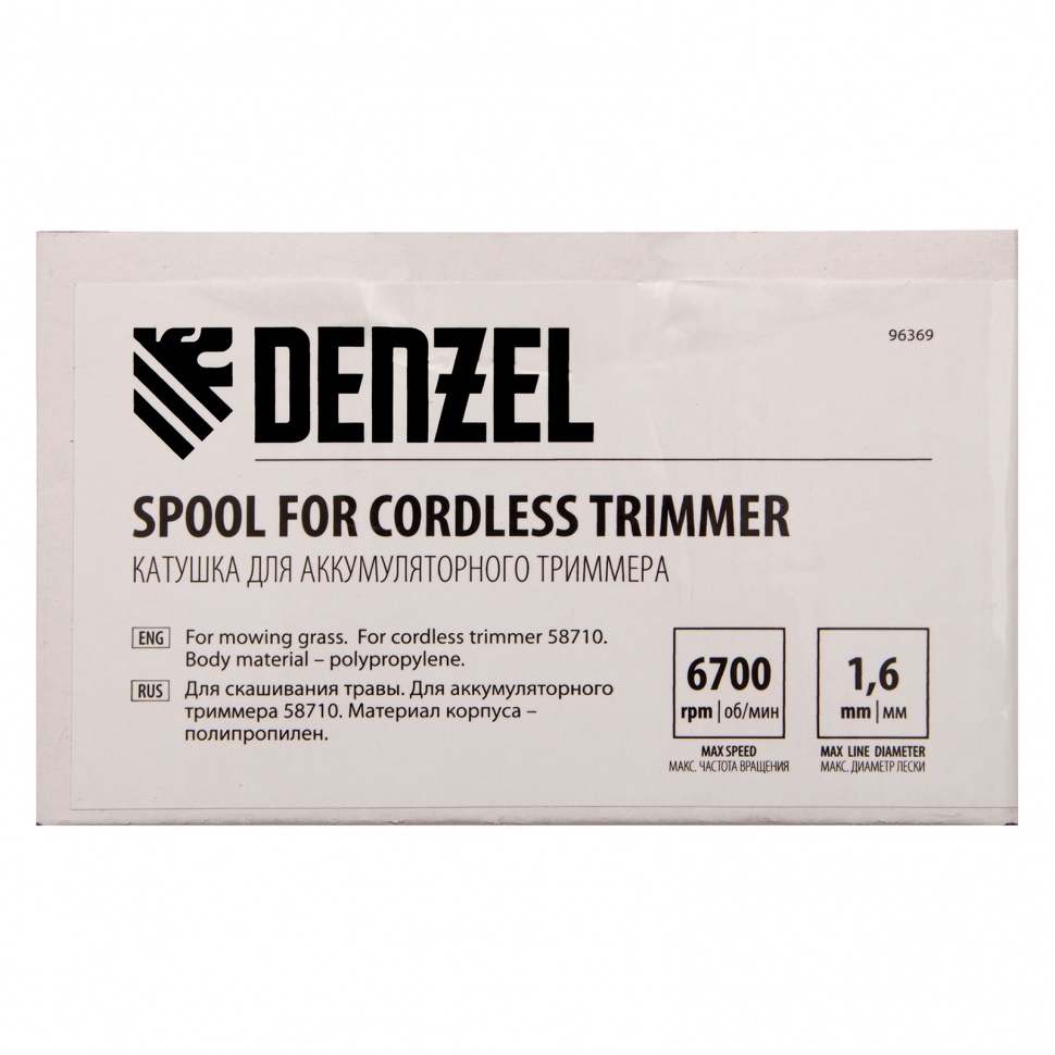Катушка Denzel 96369 предназначена для аккумуляторного триммера Denzel RT300-36 (арт. 58710). Модель RT300-36 заправляется леской толщиной до 1,6 мм и шириной скашивания 30 см, и совмещает в себе функции не только триммера, но и кромкореза. Преимущества:Полуавтоматическое обновление лески экономит время оператора — достаточно слегка ударить шпулей о землю и длина режущего элемента увеличится.Корпус из отличается ударопрочностью, поэтому рассчитан на долгую эксплуатацию и работу на сложном рельефе.В комплект поставки входит режущая леска диаметром 1,6 мм.Катушка весит всего 175 г, поэтому не утяжеляет триммер.