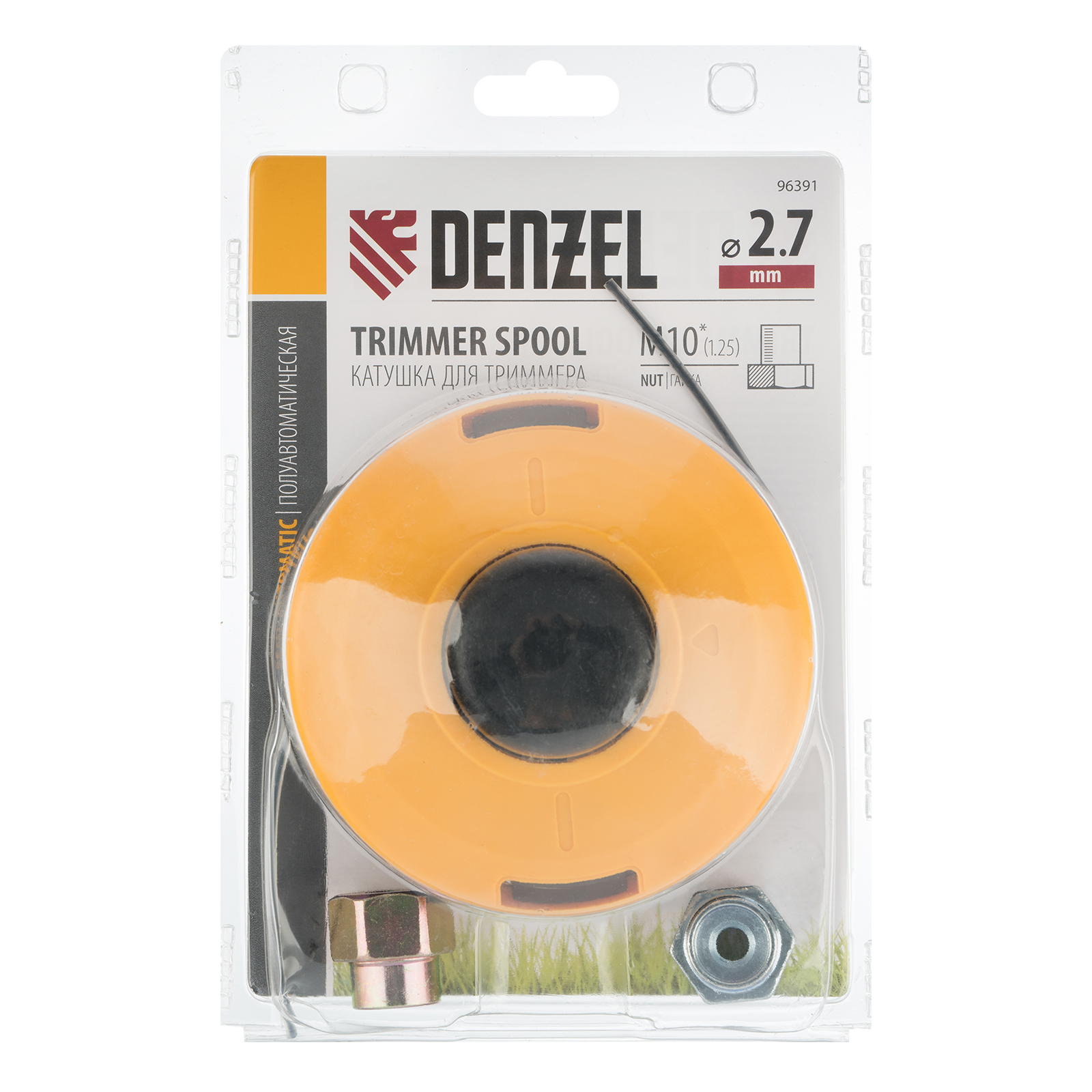 Полуавтоматическая триммерная катушка Denzel 96391 имеет посадочный размер M10 с левой резьбой 1,25 мм, а также комплектуется адаптерами M10 и M8 с шагом резьбы 1,0 и 1,25 соответственно. Устанавливается на вал электрического или бензинового триммера и используется для ухода за озелененной территорией. В катушку можно заправлять леску диаметром до 2,7 мм, что позволяет как подравнивать газонную траву, так и скашивать крупностеблевые растения и сорняки.ПреимуществаБыстрое обновление лески — для удлинения корда достаточно слегка ударить катушкой по земле, не выключая триммер.Универсальность — в комплект поставки входят гайки разных типоразмеров для установки катушки на триммеры с различными типами крепления.Простая подготовка к работе — для замены адаптера не требуются дополнительные инструменты.