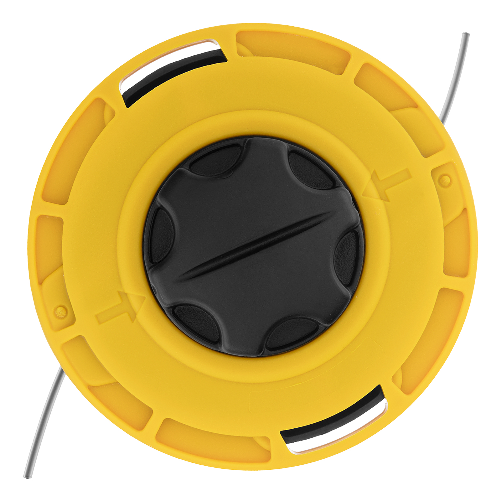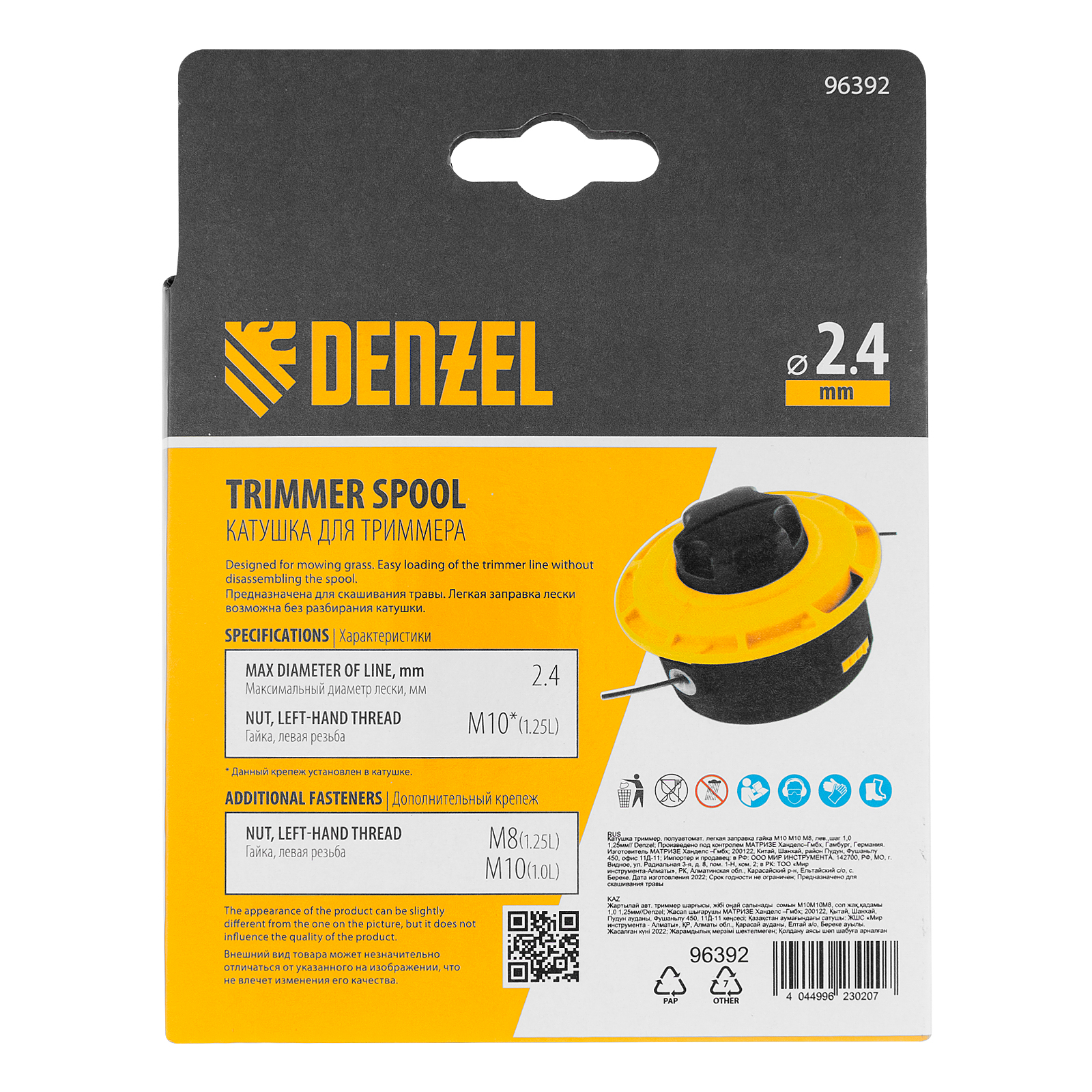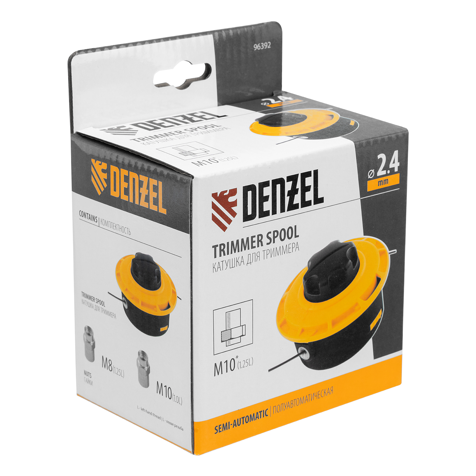 Полуавтоматическая триммерная катушка Denzel 96390 с легкой заправкой лески крепится на вал триммера при помощи гайки М10 с левой резьбой и шагом 1,25 мм, дополнительно комплектуется гайками М8 и М10 с шагом 1,25 и 1,0 мм. Заправляется леской диаметром до 2,7 мм, устанавливается на вал бензо- или электротриммера и используется для скашивания газонной травы, а также для удаления сорняков.ПреимуществаБыстрое обновление лески — для удлинения корда достаточно слегка ударить катушкой по земле, не выключая триммер.Универсальность — в комплект поставки входят гайки разных типоразмеров для установки катушки на триммеры с различными типами крепления.Легкая заправка лески — разбирать катушку не требуется, это значительно экономит время пользователя.