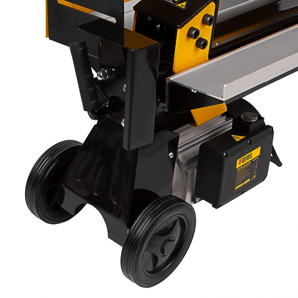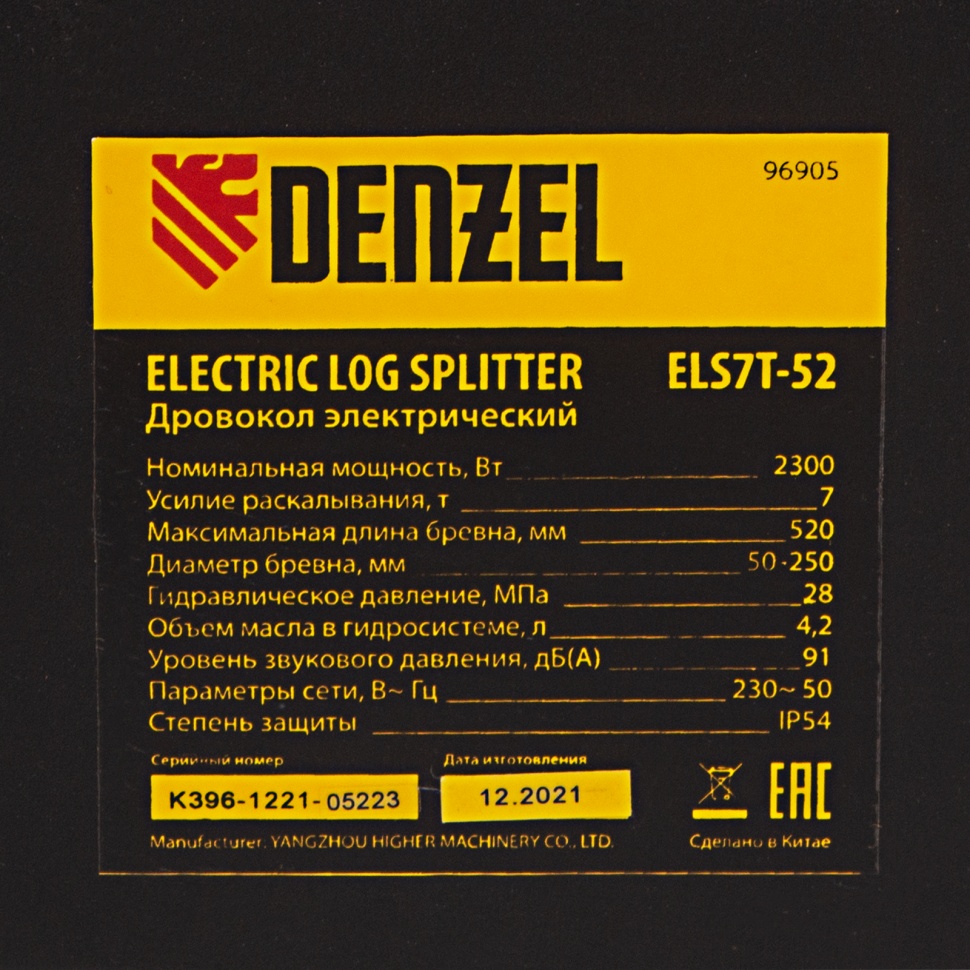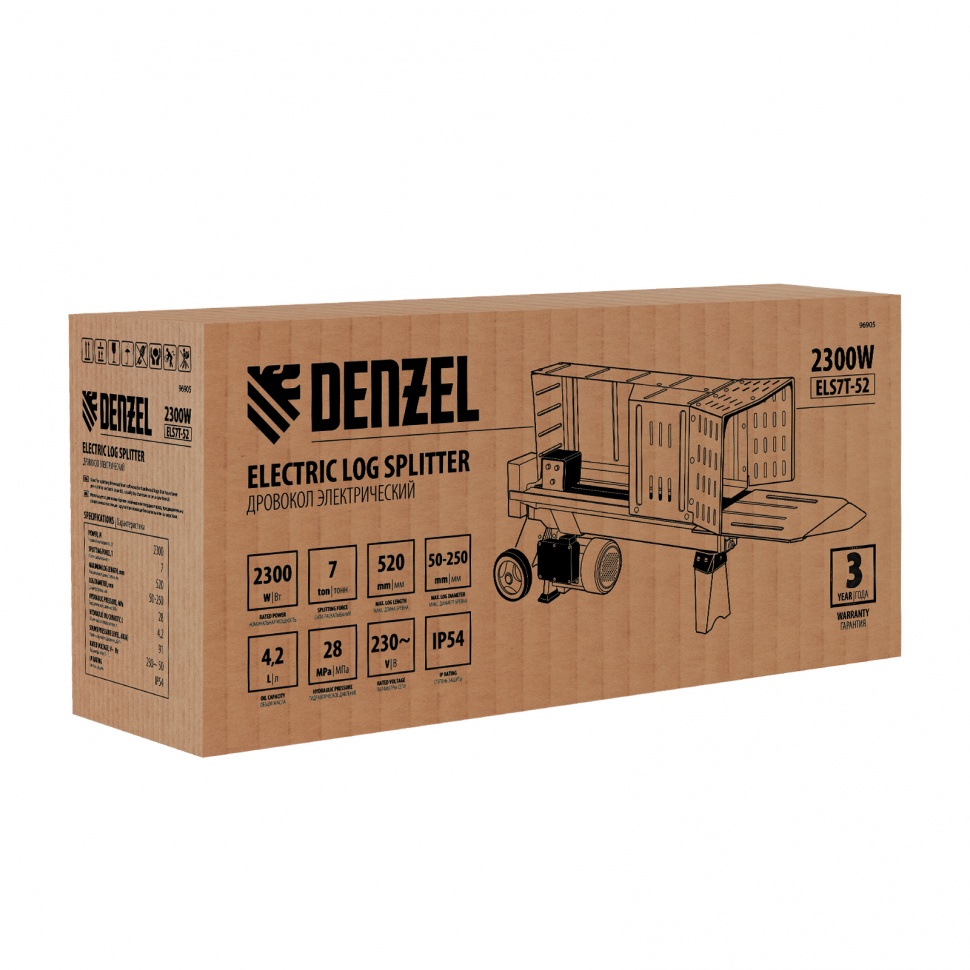 Электрический дровокол Denzel 96905 мощностью 2300 Вт значительно упрощает процесс раскалывания поленьев диаметром 50-250 мм и длиной до 520 мм. Заготовка дров производится быстро и не требует практически никаких усилий от мастера. Дровокол будет полезен владельцам бань и домов с печным отоплением/камином, любителям отдыха на природе, рыбакам и охотникам. Благодаря значительному усилию раскола 7 тонн устройство подходит для полупрофессионального применения, поэтому пригодится работникам коммунальных служб и дровяных котельных.Асинхронный электрический двигатель отличается высоким ресурсом и надежностью. Дровокол подключается к бытовой сети и не требует сложного технического обслуживания — достаточно включить его в розетку, и можно приступать к работе. Колоть дрова можно даже в закрытом помещении, ведь устройство не производит вредных выхлопов.ПреимуществаБезопасность — защитный кожух не допускает случайного контакта с распорным клином и предотвращает попадание на пользователя щепок.Двухрычажная система блокировки — для раскалывания дров нужно удерживать рычаг гидравлики и кнопку двумя руками, иначе устройство остановится — такое решение делает рабочий процесс нетравмоопасным.Горизонтальная загрузка — укладывать поленья в желоб дровокола удобно, также такой способ делает работу более безопасной, ведь руки мастера находятся вдали от ножа.Аккуратность — для расколотых дров в конструкции предусмотрена специальная подставка.Эффективная колка — клин выполнен из высококачественной стали, закален до необходимой твердости и остро заточен, поэтому легко справится с древесиной твердых пород.Долговечность — корпус изготовлен из прочной стали и покрыт порошковой краской для защиты от коррозии.Устойчивая конструкция — благодаря весу 56кг и опорам дровокол надежно фиксируется на ровной поверхности и не смещается в процессе работы.Мобильность — для удобного перемещения дровокола предусмотрены прочные колеса.
