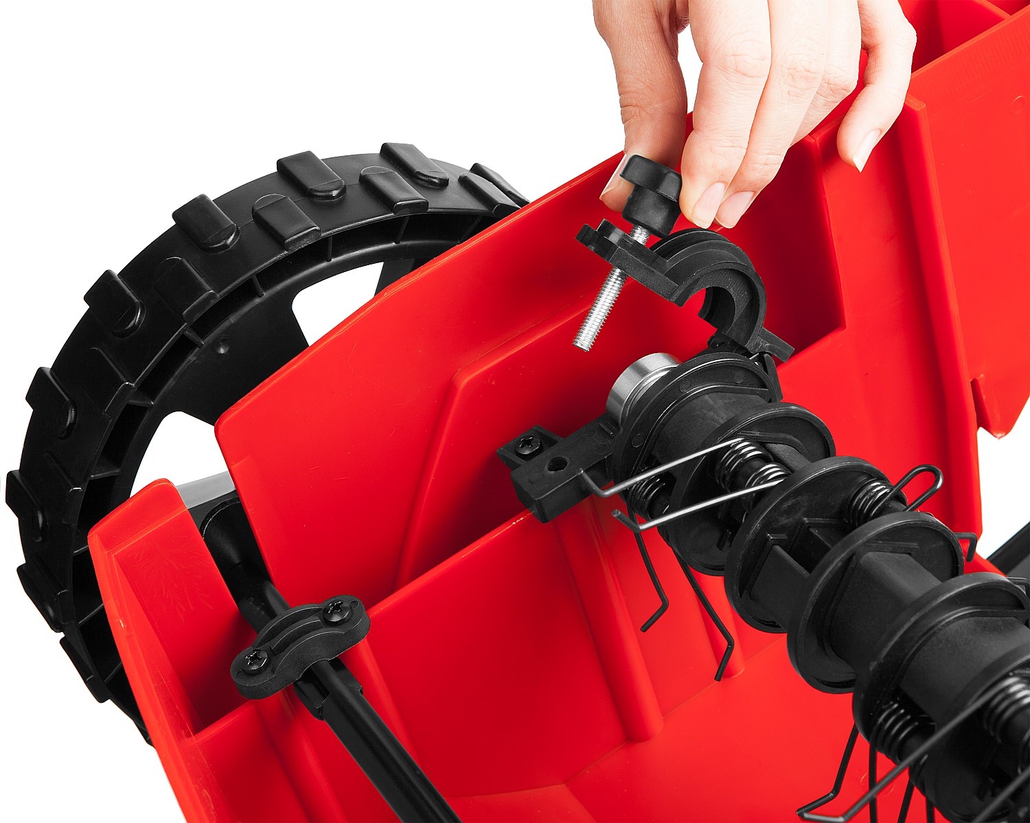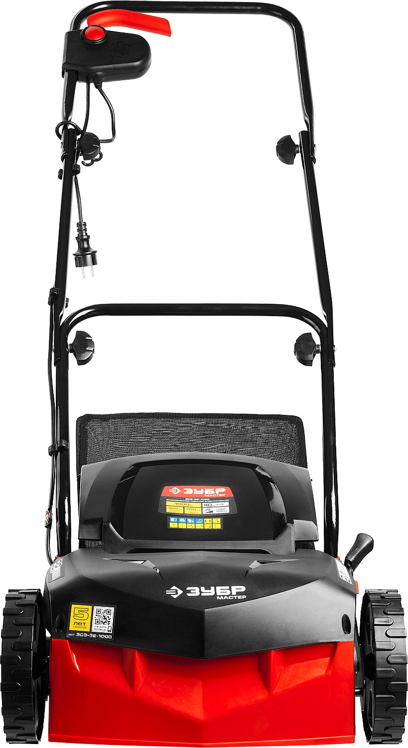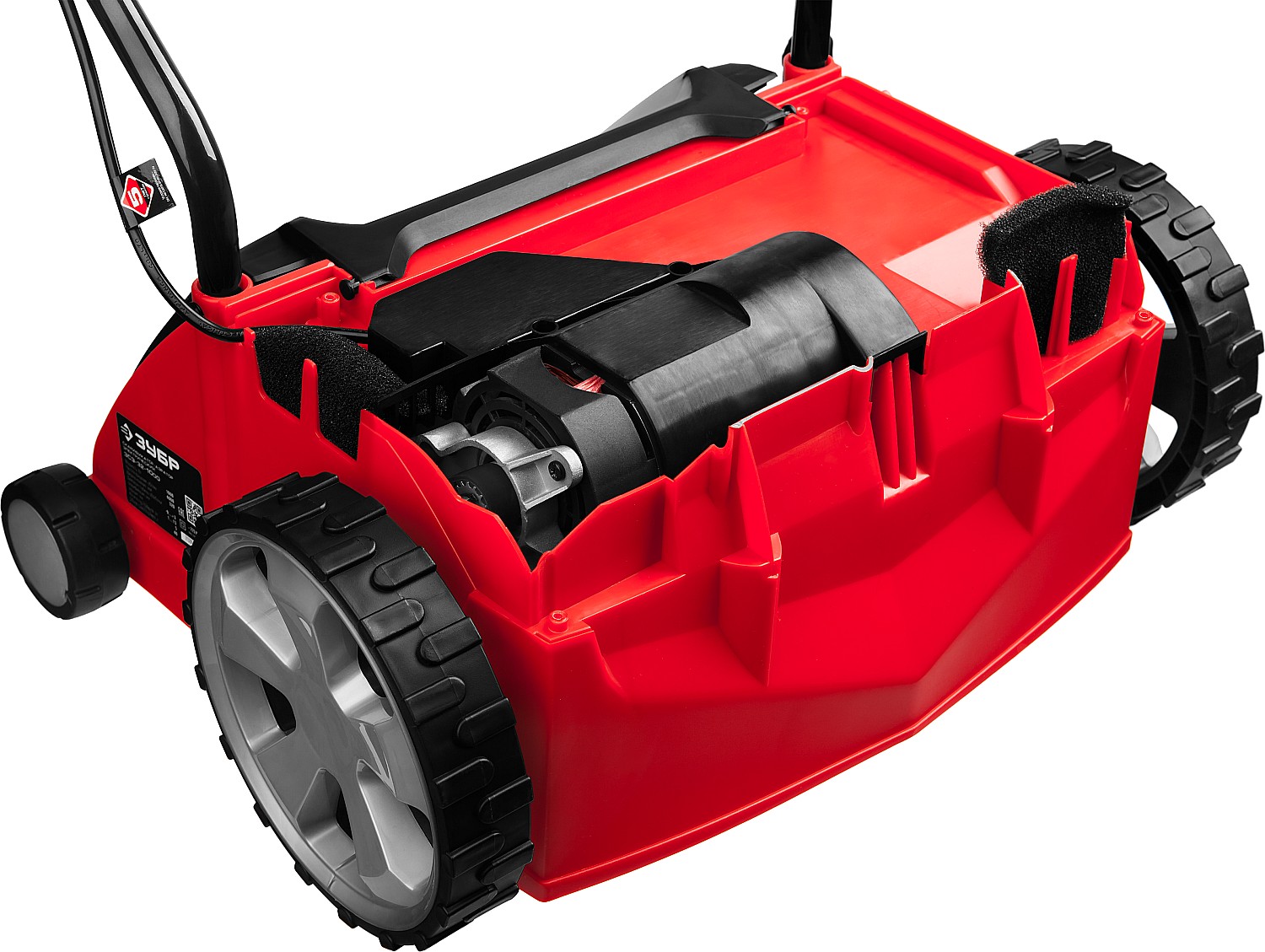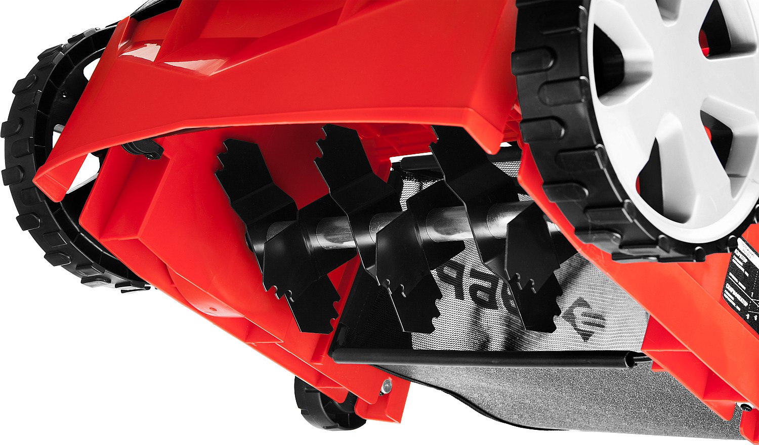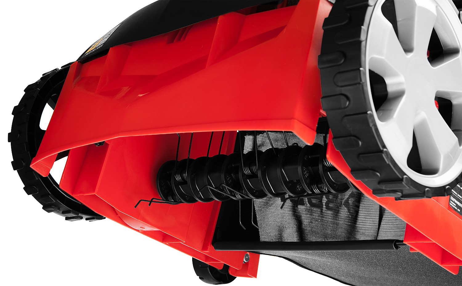 - Облегченные колеса большого диаметра и эргономичная рукоятка облегчают перемещение изделия по газону