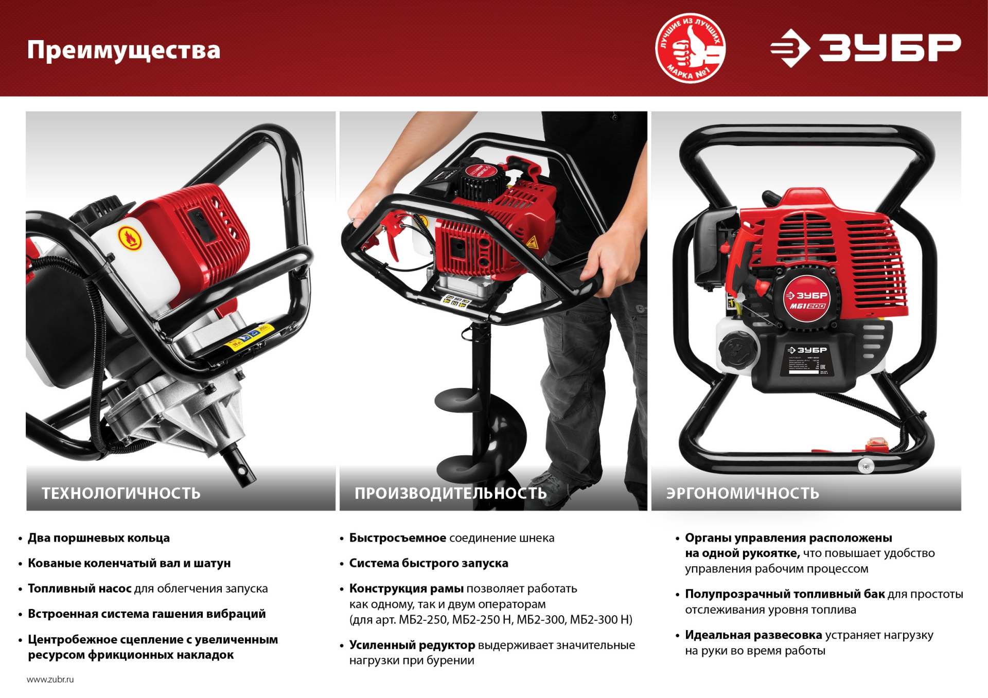 Универсальный мотобур оптимален к применению при монтаже столбов, заборов, ограждений и других целей связанных с бурением грунта. Конструкция рукоятки позволяет работать как одному оператору, так и двум одновременно, что повышает эффективность бурения и обеспечивает дополнительную сохранность двигателя при работе и транспортировке.