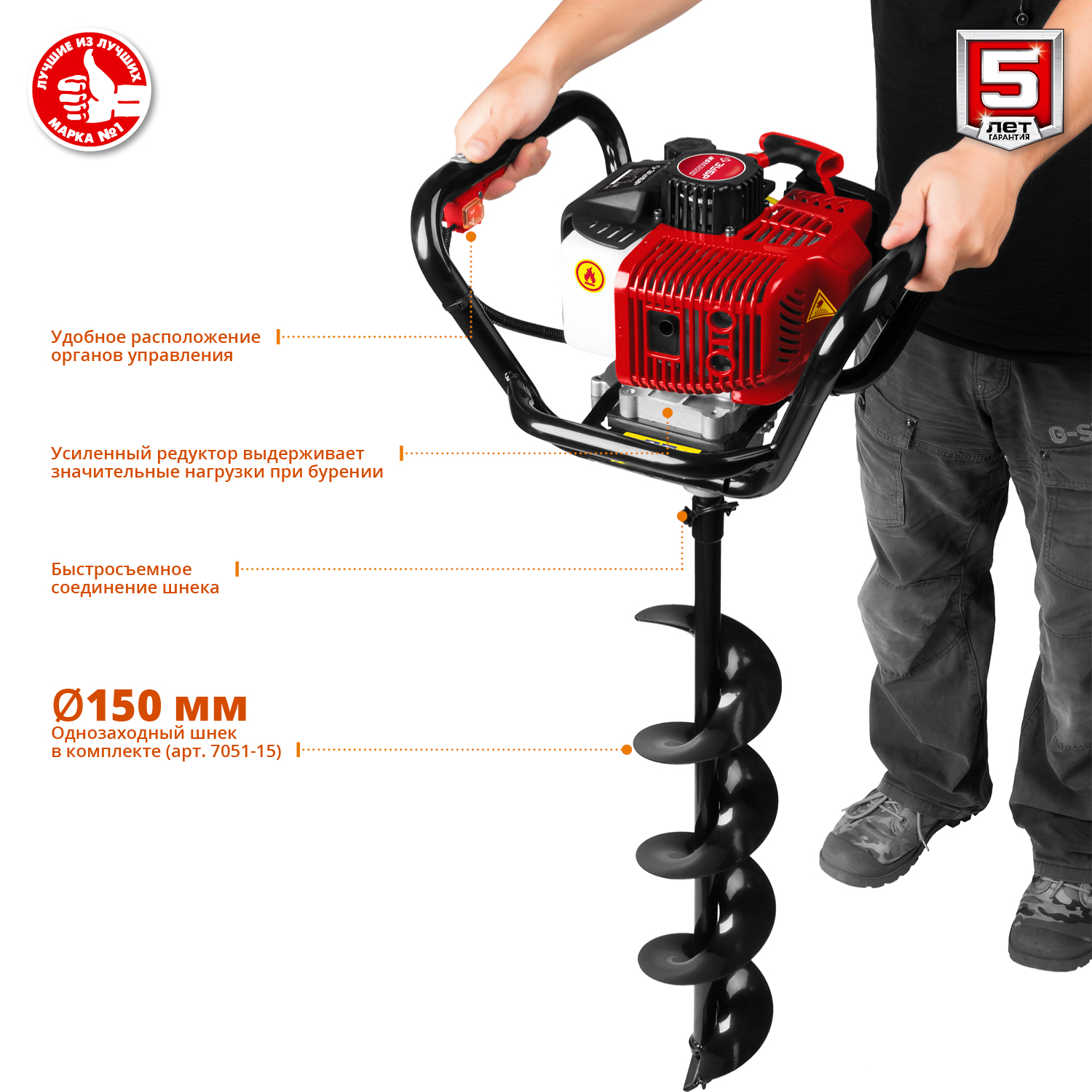 Простой и надежный мотобур для бурения различных грунтов и льда. Активно применяется в строительной и хозяйственной деятельности и позволяет сделать скважину качественно и в короткие сроки. Оснащен мощным 2-х тактным мотором и системой легкого запуска. Оперативная замена шнека позволяет легко адаптировать мотобур под решение разного вида задач. Прочная сварная рама, удобная для работы, обеспечивает дополнительную сохранность двигателя при работе.