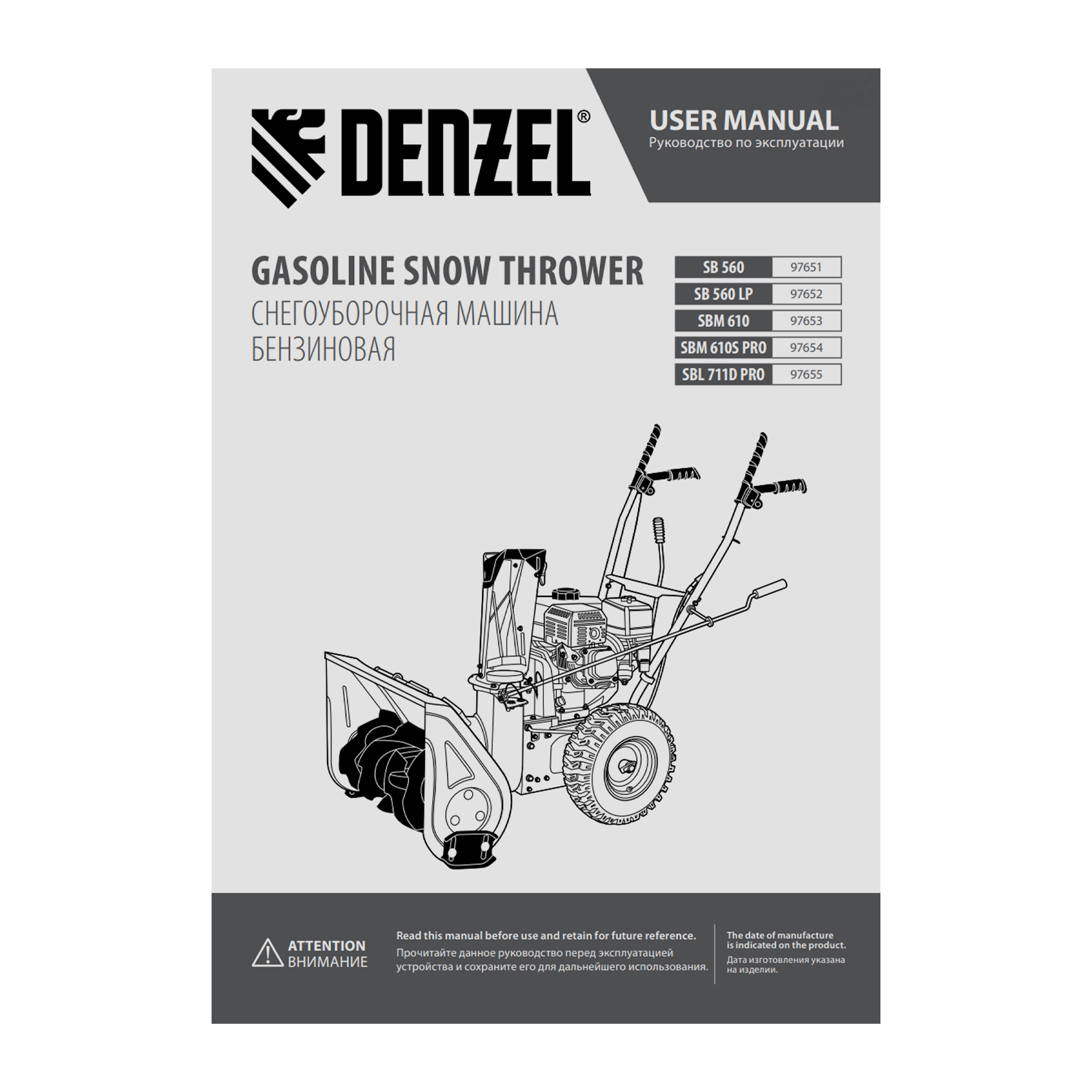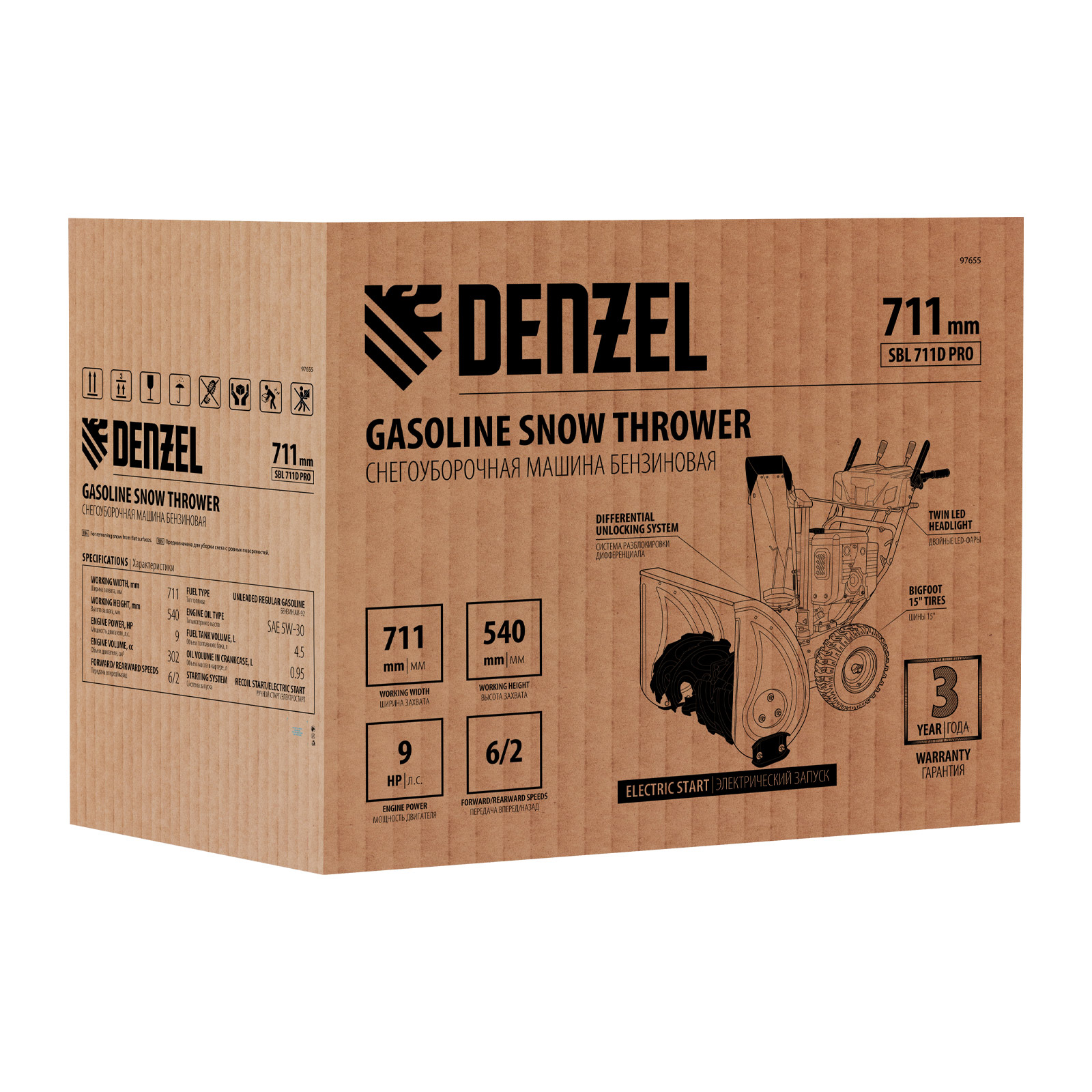 Бензиновая снегоуборочная машина Denzel SBL 711D PRO 97655 с двигателем объемом 302 cм3, электростартером, фарой, обогревом рукояткок и функцией разблокировки дифференциала, предназначена для уборки территорий загородных домов, коттеджей, подъездных дорог и улиц СНТ, парковок и городских дворовых территорий. Ресурсный зимний двигатель с увеличенным крутящим моментом и шнек с агрессивным профилем ледорубов обеспечивают эффективную уборку даже плотного слежавшегося снега с наледью. Ковш шириной 711 мм и высотой захвата 540 мм эффективно справляется с высокими сугробами.Denzel SBL 711D PRO — профессиональный выбор для коммунальных служб, организаций, а также людей, ценящих комфорт, функционал и эстетический внешний вид.ПреимуществаЭкономия сил и времени — снегоуборочная машина относится к самоходному типу, а значит, ее не придется толкать во время работы.Увеличенная производительность — двухступенчатая система удаления снега обеспечивает эффективное решение поставленных задач.Высокая маневренность — благодаря функции двусторонней разблокировки дифференциала машину легко разворачивать.Гибкая коробка передач 6/2 — можно установить оптимальную скорость движения.Высокая проходимость — большие колеса диаметром 15″ с зимним протектором облегчают движение по заснеженной территории.Выбор направления и дальности выброса снега — угол поворота и наклона желоба легко меняются на панели управления в зависимости от потребностей пользователя.Комфортная работа — ручки с подогревом не дадут замерзнуть в холодную погоду, а яркая двойная LED-фара позволит работать в условиях плохой видимости.Легкое управление — все основные рычаги вынесены на функциональную пластиковую панель, фиксация рычага включения шнека дает возможность направлять машину одной рукой.Надежность — двигатель Snow Series гарантированно запускается при температуре до -30 ℃.Удобный и быстрый запуск — электростартер, работающий от розетки 230 В, позволяет включить двигатель одним нажатием кнопки, а широкая рукоятка ручного стартера обеспечивает комфорт при пуске двигателя вручную.Долговечность — надежный редуктор шнека повышает ресурс оборудования.Простой уход — в комплект поставки входит лопатка для очистки ковша шнека и разгрузочного желоба от снега и льда.Гарантия 3 года — высокое качество и надежность снегоуборочной машины подтверждены производителем.