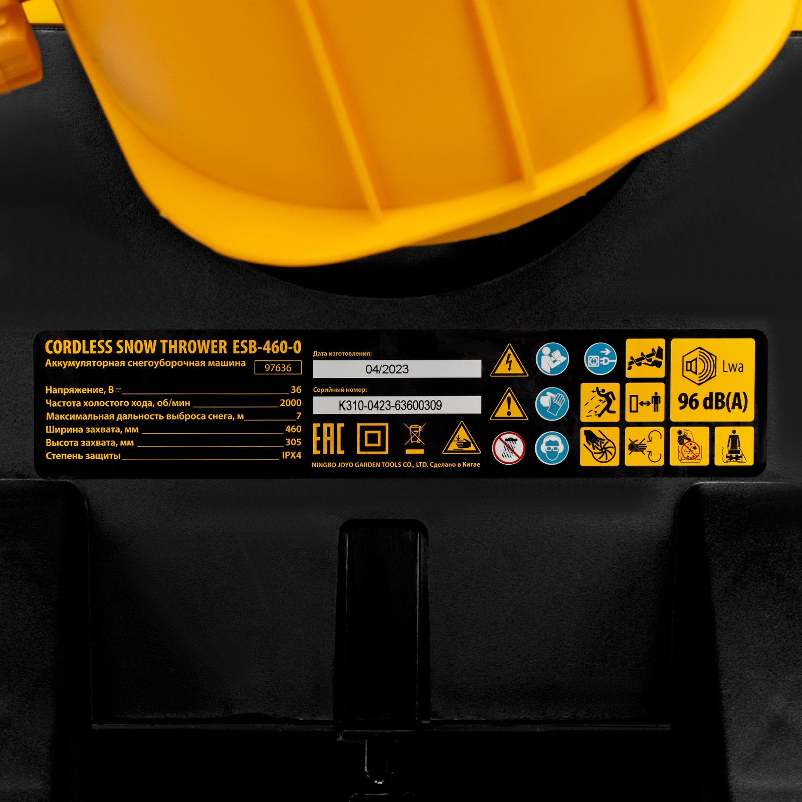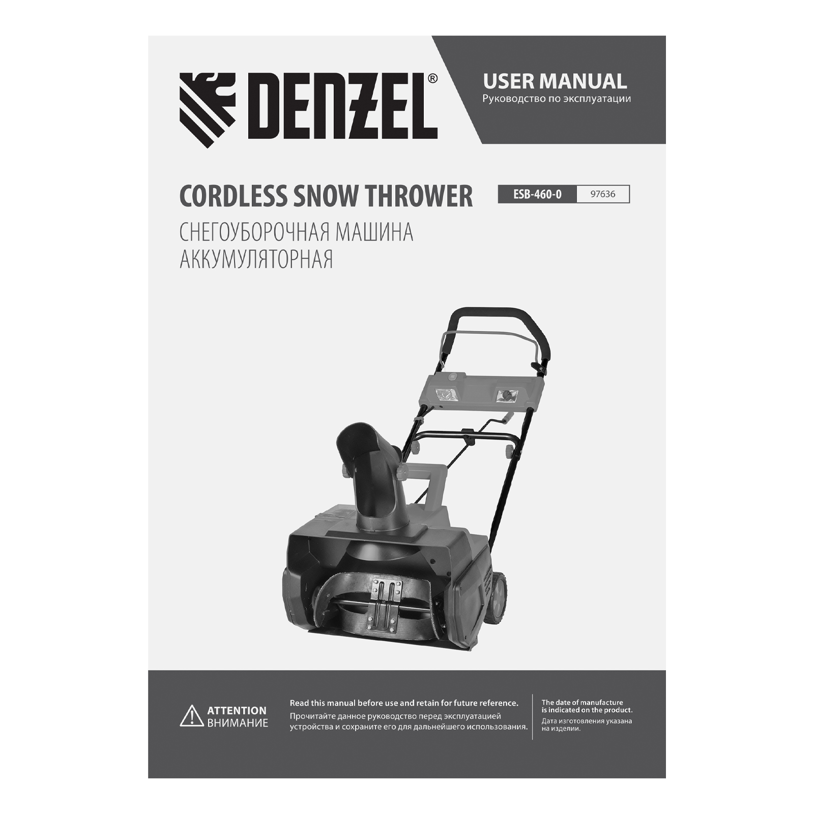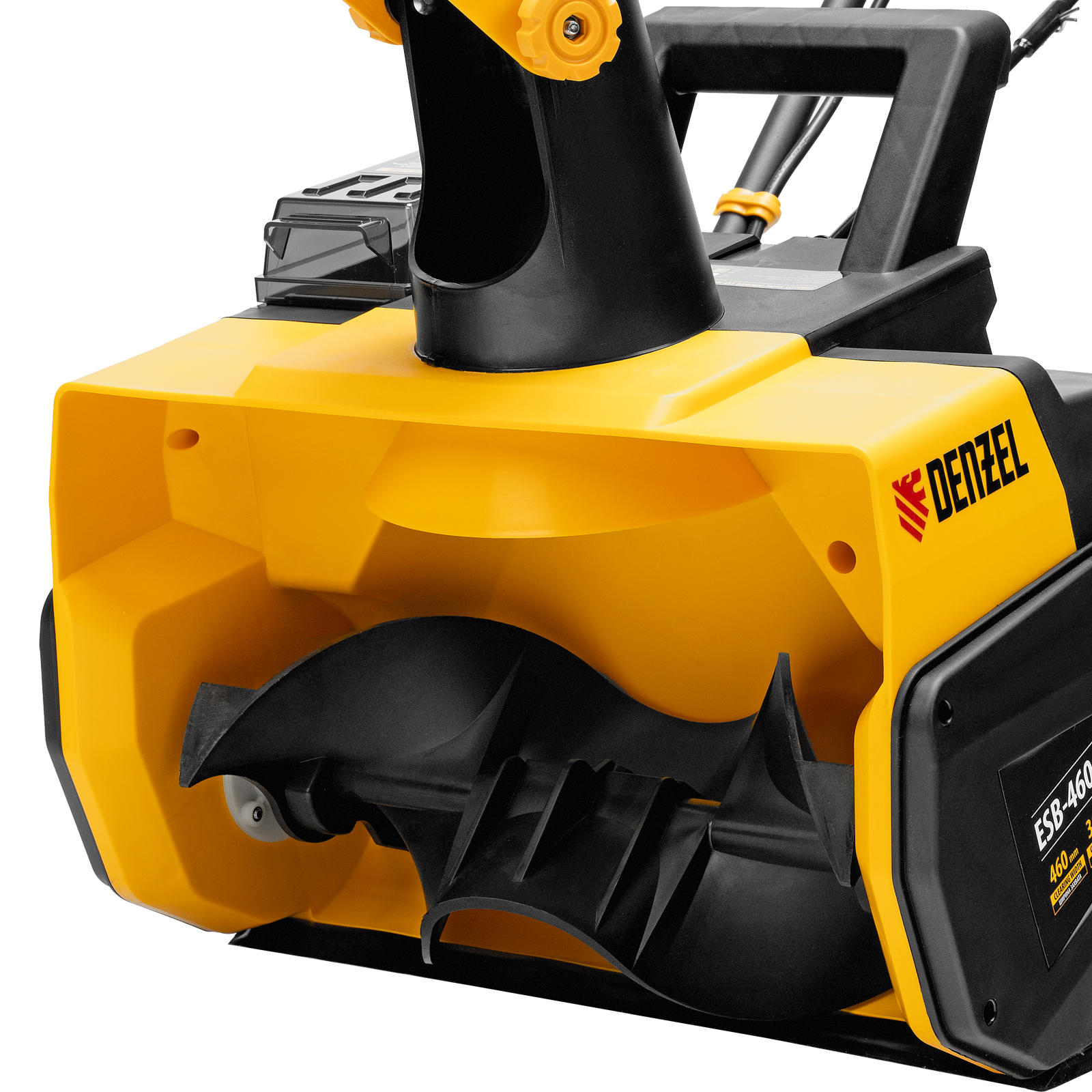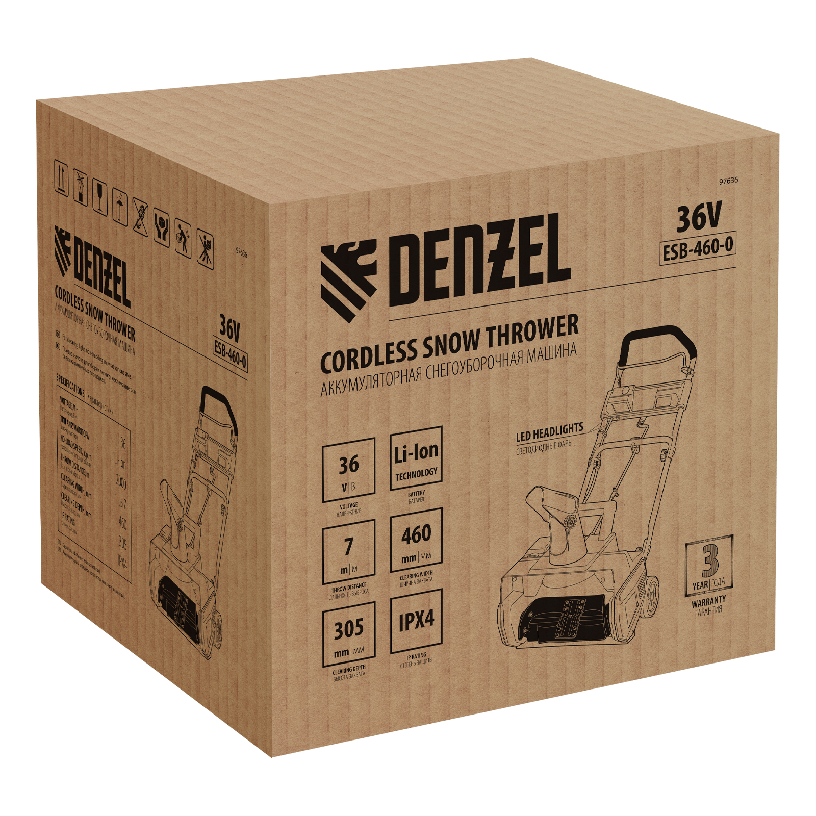Аккумуляторная снегоуборочная машина Denzel ESB-460-0 97636 работает от 2 аккумуляторов Li-Ion с рабочим напряжением 18 В каждый и предназначена для очищения ровных поверхностей от снега. Поможет расчистить дорожки, тротуары, придомовую территорию, парковку. Ширина захвата составляет 460 мм, что позволяет быстрее справляться с уборкой.,Машина не зависит от стационарного источника электропитания, благодаря чему вы можете с комфортом расчищать дорожки даже в самых удаленных частях участка. Во время ее работы отсутствуют вредные выхлопы и неприятный запах. Благодаря низкому уровню шума использование снегоуборщика не доставляет дискомфорт окружающим.ПреимуществаУниверсальность — к снегоуборщику подходят аккумуляторы емкостью 4 А*ч (не входят в комплект поставки), совместимые с любыми инструментами и техникой единой платформы 18 В Denzel battery system.Эффективность— мощный бесщеточный двигатель обеспечивает высокую производительность.Хорошая видимость при недостаточном освещении — машина оснащена двойной LED-фарой.Удобное перемещение — снегоуборочная машина весит всего 11 кг, благодаря чему обладает высокой маневренностью.Регулировка направления выброса снега — угол поворота желоба можно изменить при помощи удобной рукоятки.Комфортная работа в мороз — на рукоятке имеется микропористое покрытие, благодаря которому руки не мерзнут.Компактность — благодаря складной рукоятке машина не занимает много места во время хранения.Гарантия 3 года — высокое качество техники подтверждено производителем.