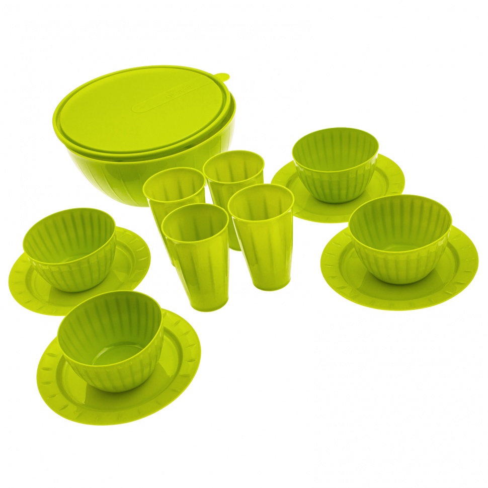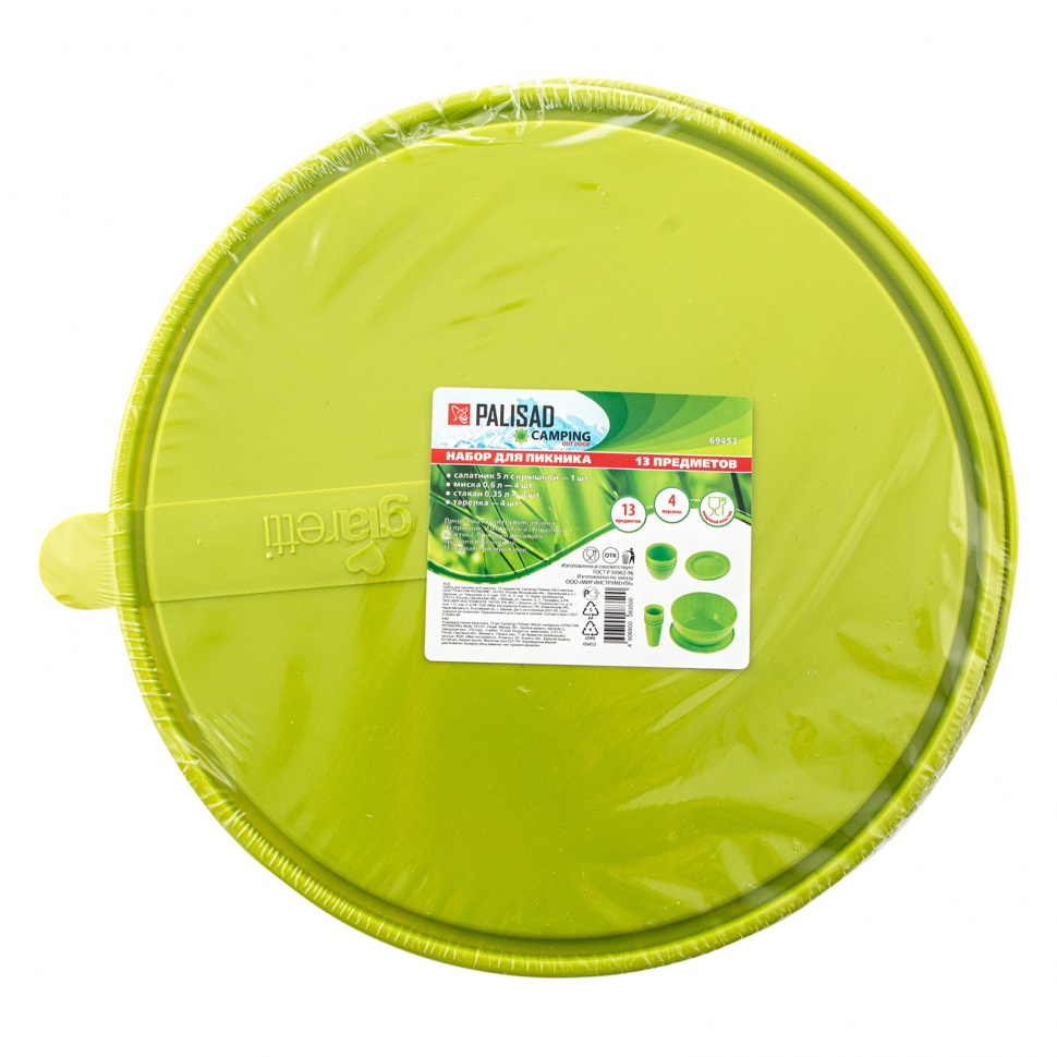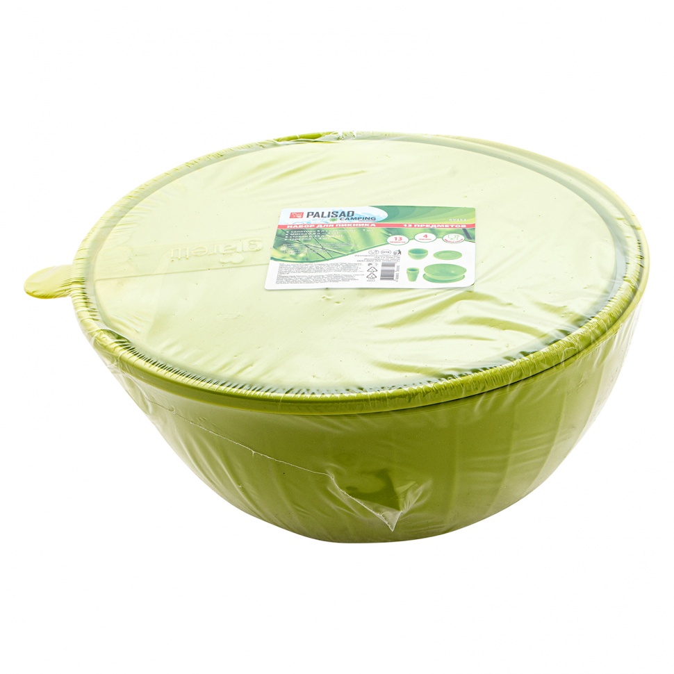 Набор для пикника на 4 персоны Camping Palisad 69453 включает 13 предметов. Небольшой туристический набор пригодится на даче, в кемпинге или походе. Пластиковая посуда подходит не только для холодной, но и для горячей пищи.ПреимуществаВся посуда выполнена из легкого и прочного пищевого пластика, безопасного для здоровья и окружающей среды.Универсальный комплект для пикника включает все необходимое для отдыха на природе: тарелки, стаканы, миски и большой салатник с крышкой.Набор весит 840 г, поэтому его удобно брать с собой даже в пеший поход.
