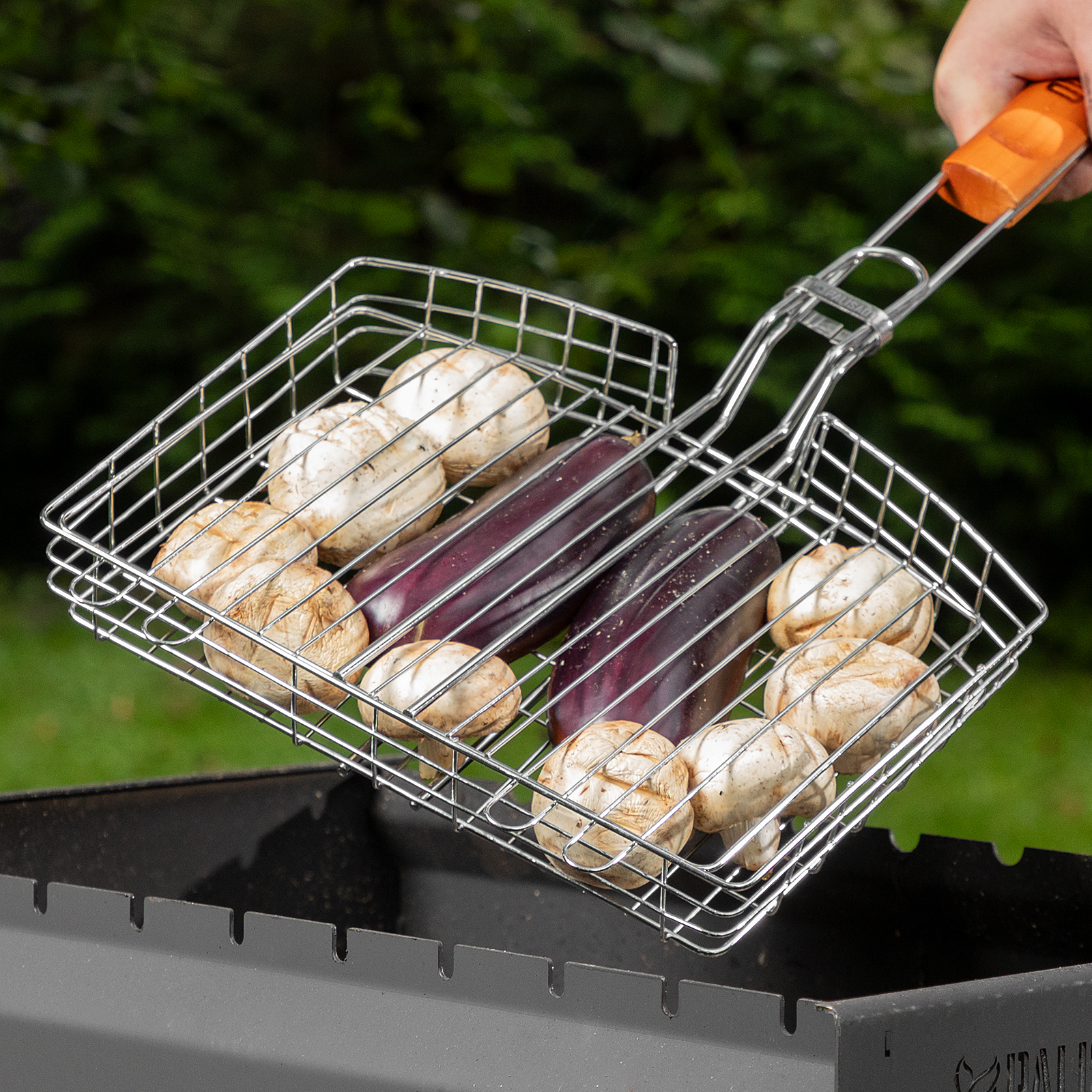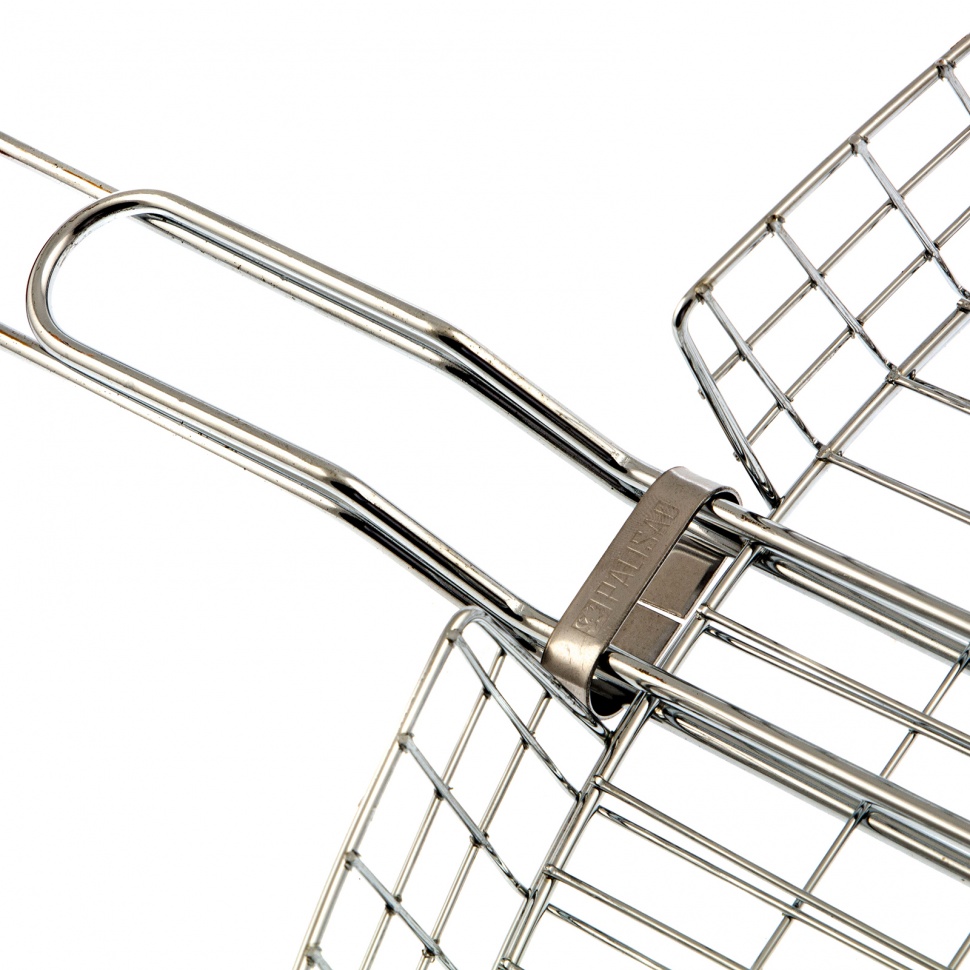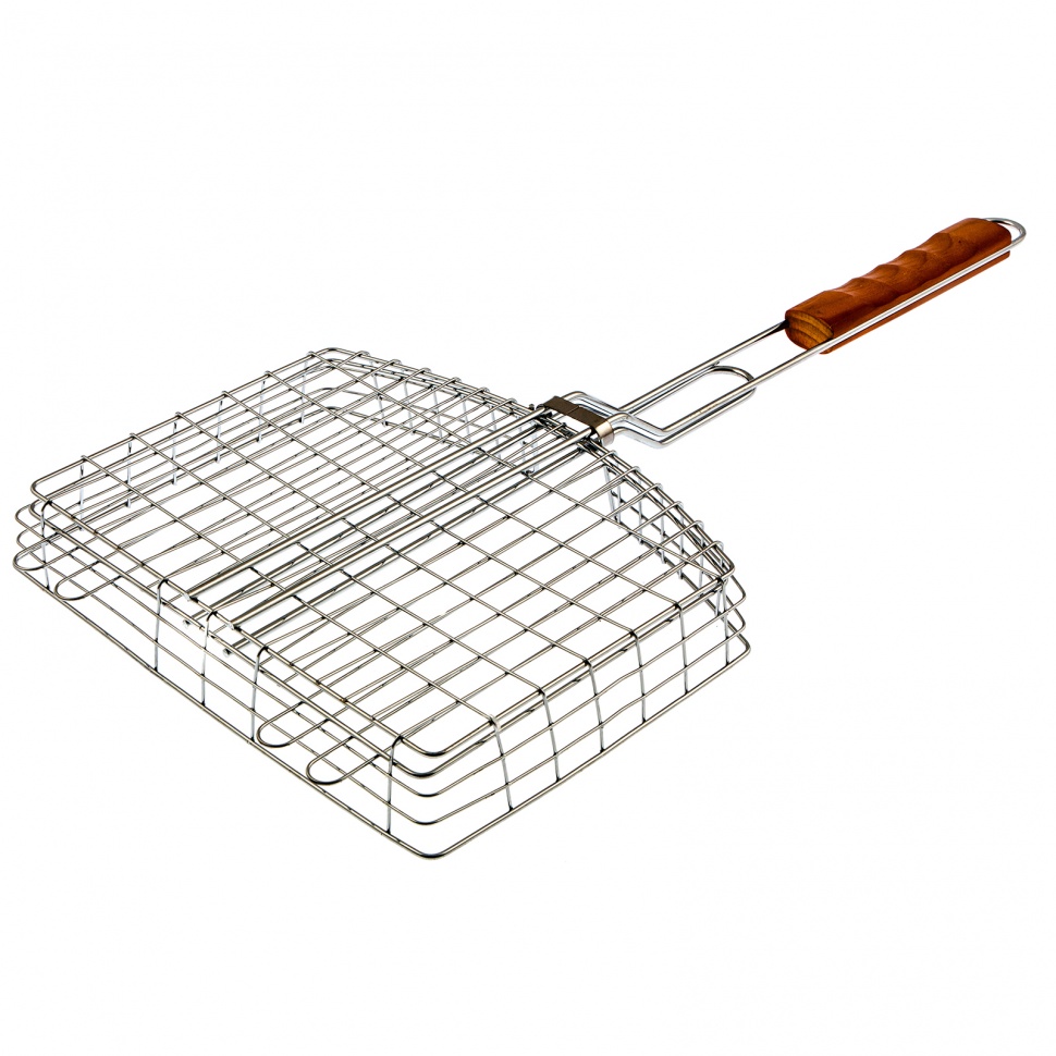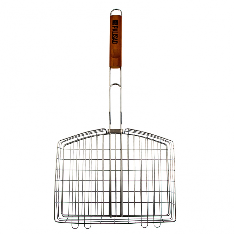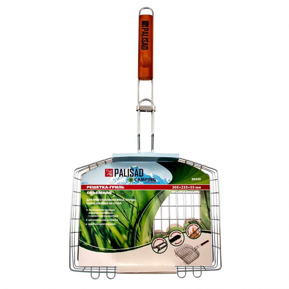 Объемная хромированная решетка гриль Palisad Camping 69559 размером 305 х 235 х 55 мм позволяет легко жарить пищу с двух сторон в мангале. Объемная конструкция решетки с возможностью регулировки высоты позволяет приготовить крупные куски мяса и куриную тушку без потери сочности.Преимущества Залогом надежности и долговечности решетки выступает высококачественная жаропрочная сталь, из которой она выполнена. Хромовое покрытие придает решетке износостойкость и устойчивость к коррозии. За счет увеличенных опорных стержней решетка надежно фиксируется на мангале, а для жарки используется вся рабочая площадь. Для предотвращения случайного раскрытия решетки во время переворачивания решетка оснащена широким кольцом-фиксатором. Рукоятка выполнена из древесины, поэтому ее приятно и удобно держать в руках.