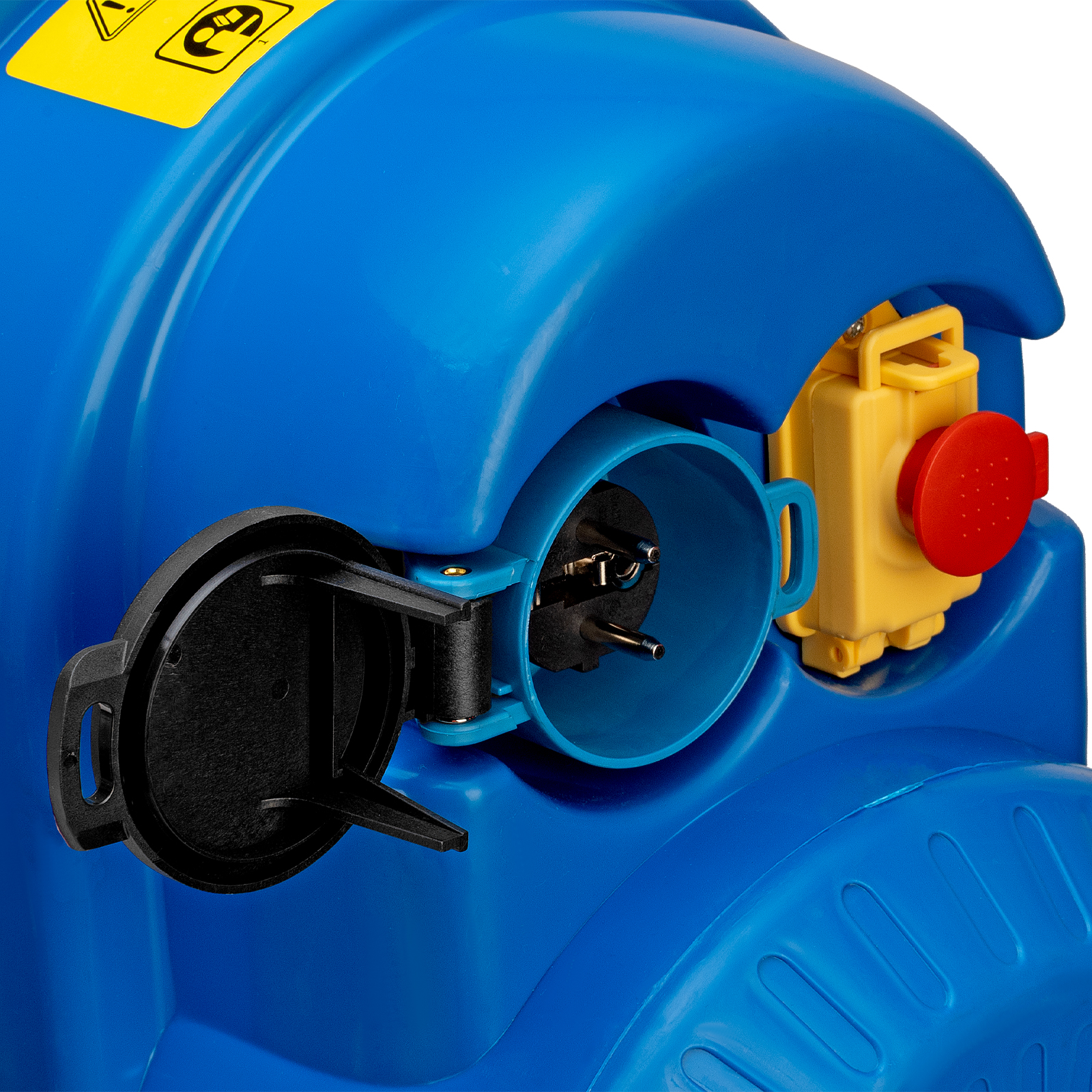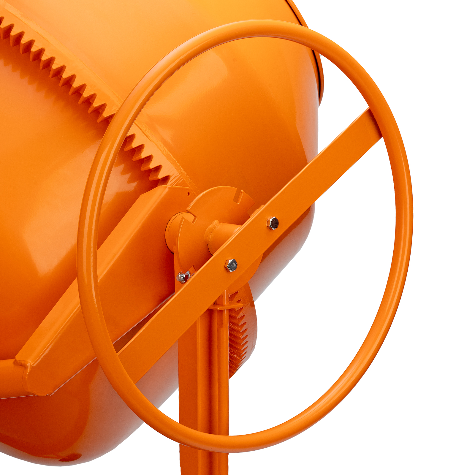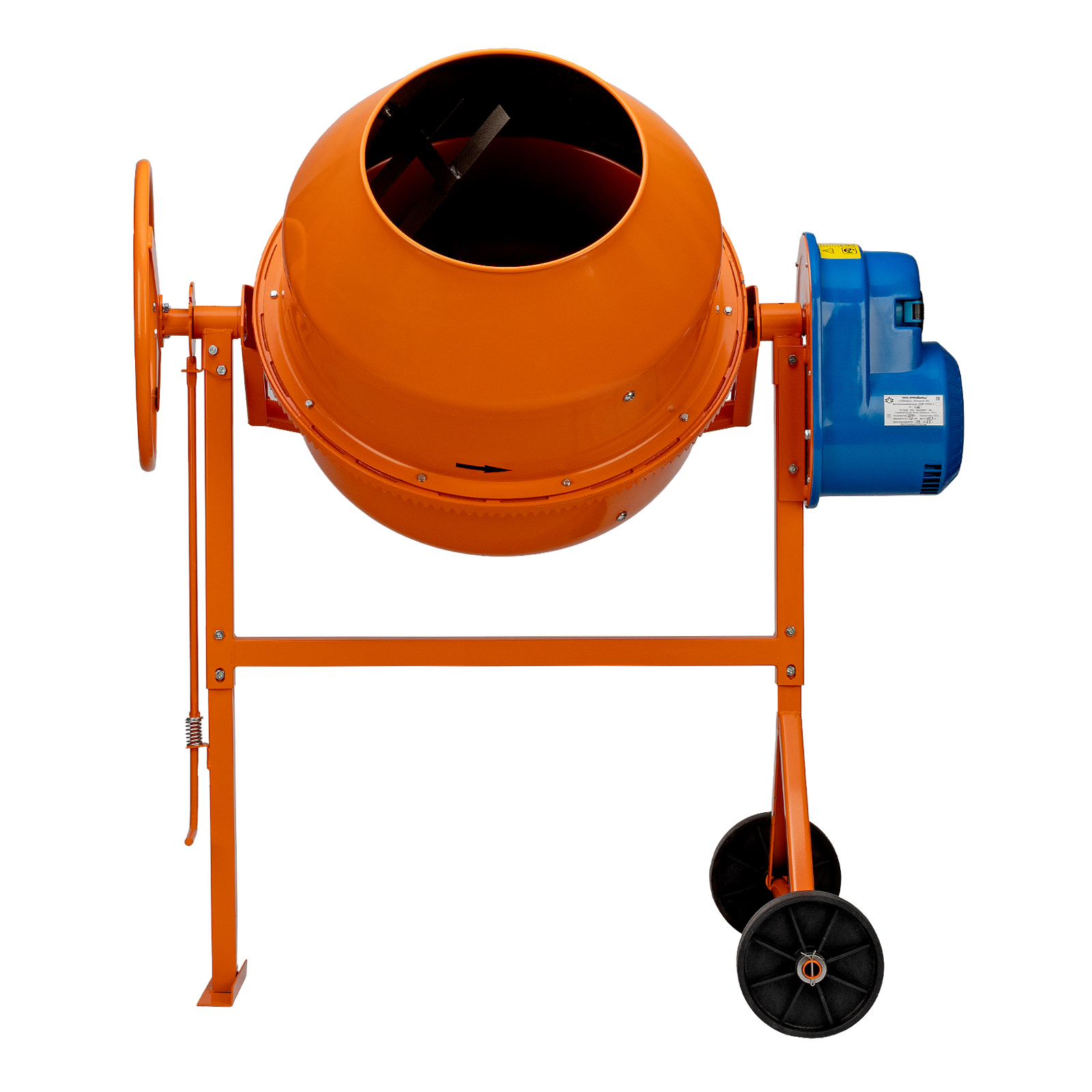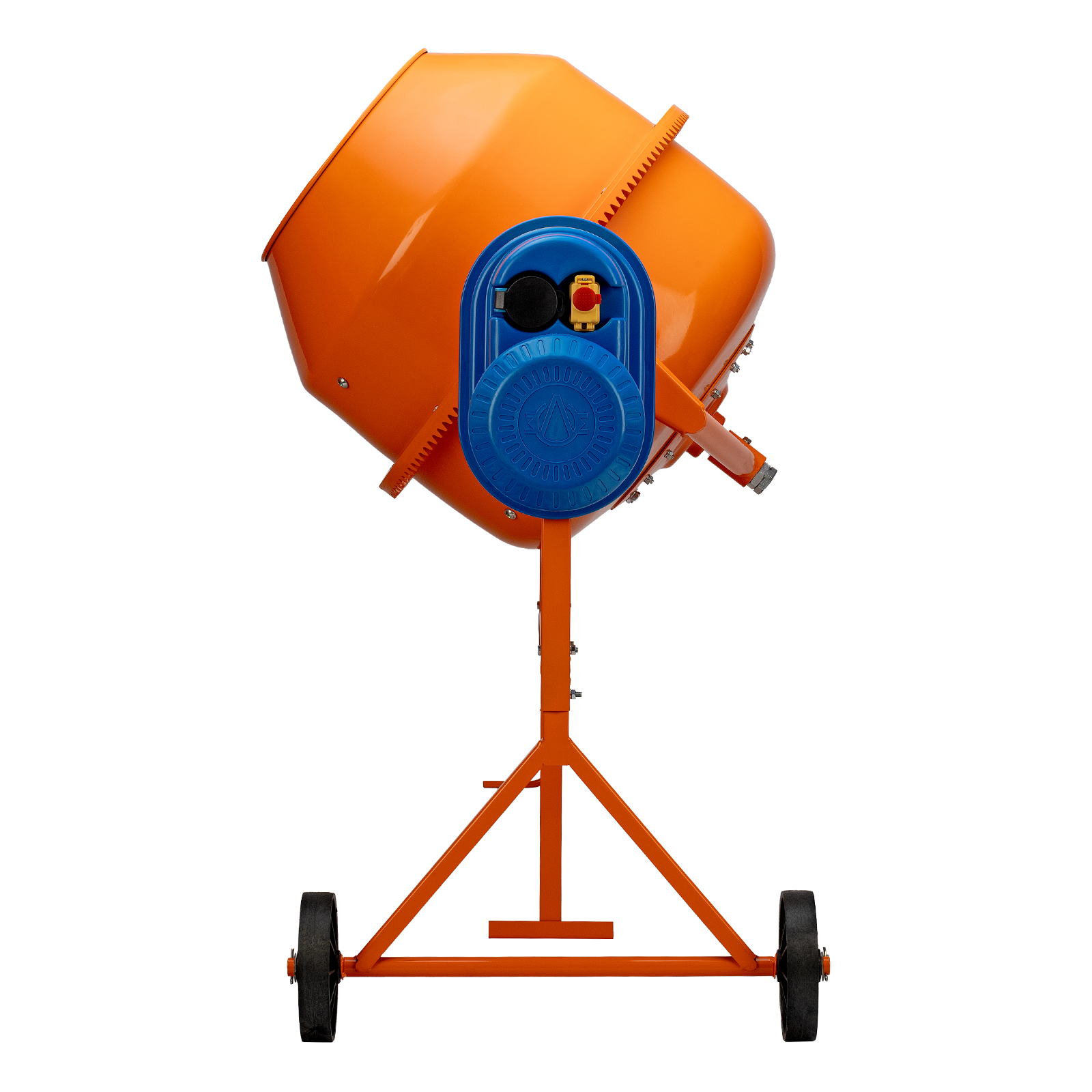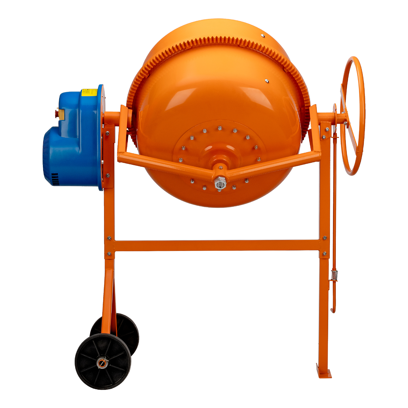 Бетоносмеситель СБР-150А.3 95448 мощностью 1,0 кВт, с барабаном объемом 150 л, работает от сети 220 В и используется для замешивания подвижных бетонных и цементных растворов, сухих смесей при заливке фундамента и стяжки, при укладке плитки и кирпича. Подходит для коммерческого использования благодаря возможности работы при высоких нагрузках и увеличенному ресурсу работы 3000 часов. Бак 150 л обеспечивает на выходе большой объем готового раствора — 80 л за один замес.ПреимуществаВысокий ресурс — венец и приводные шестерни выполнены из чугуна, бак изготовлен из листовой стали толщиной 2 мм снизу и 1,5 мм сверху.Прочная конструкция — бетоносмеситель имеет стальную раму и усиленные профили траверсы, втулка оси траверсы наварена на раму отдельным элементом, венец крепится к барабану с помощью внешних проушин, а металлическая опора обеспечивает устойчивость бетономешалкиТермозащита — автоматическое отключение двигателя в случае перегрева предотвращает его поломку.Ударопрочный кожух — электронные компоненты защищены от пыли и брызг воды, а благодаря лабиринтному строению воздуховодов двигатель не перегревается.Защита от коррозии — бак и стойка покрыты специальной порошковой краской.Безопасная работа — стальной вертикальный элемент траверсы защищает привод бака от затягивания посторонних предметов, выключатель закрыт крышкой для предотвращения случайного запуска.Кнопка аварийного выключения — можно мгновенно остановить работу в экстренном случае.Электробезопасность — усиленная изоляция токопроводящих элементов и клемм обеспечивает защиту от поражения током.Разборная конструкция — части бака и стойки скрепляются болтовыми соединениями, поэтому сборка бетоносмесителя не требует специальных навыков.Ремонтопригодность — разборный узел крепления оси барабана позволяет самостоятельно заменить подшипники в случае необходимости.Удобное использование — фиксация барабана под нужным углом облегчает выгрузку готовой смеси.Легкая замена кабеля питания — сетевой шнур не является элементом конструкции, а подключается к розетке на кожухе.Комфортное перемещение по строительной площадке — бетоносмеситель оснащен большими колесами.