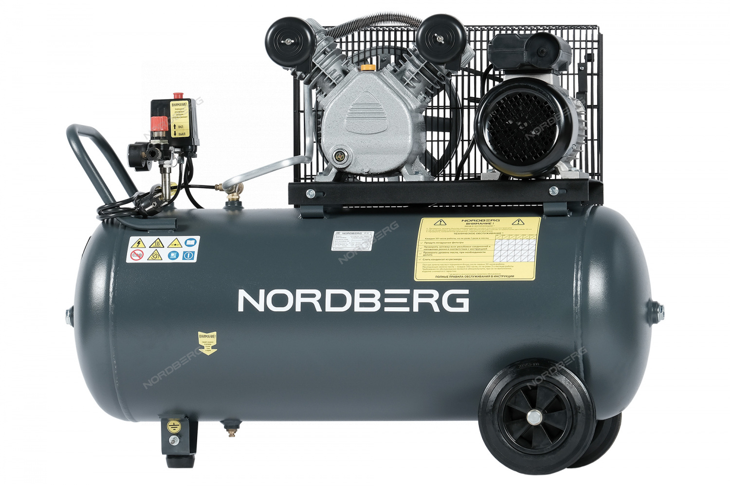 Поршневой компрессор с ременным приводом NORDBERG NCP100/360A – промышленное оборудование для применения с пневмоинструментами в автосервисных мастерских и для использования в бытовых целях.