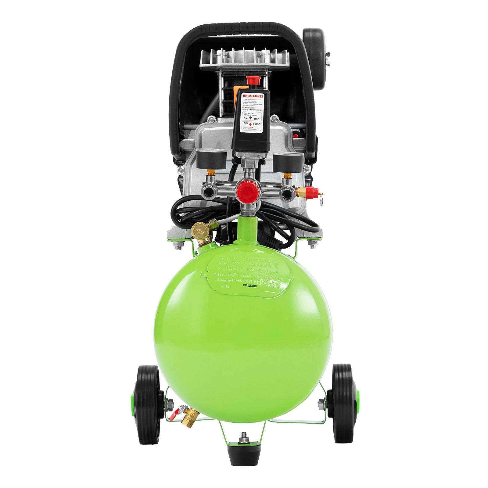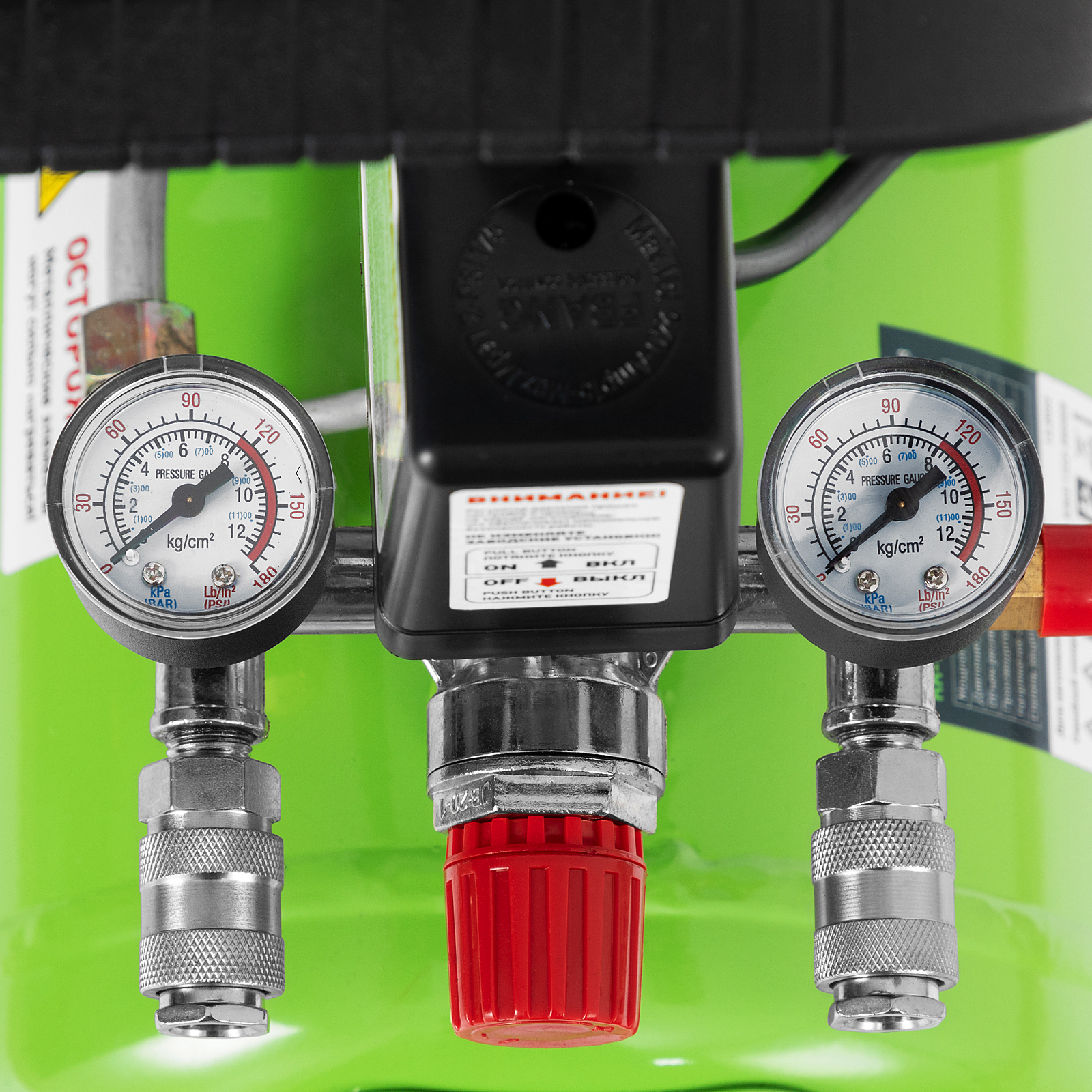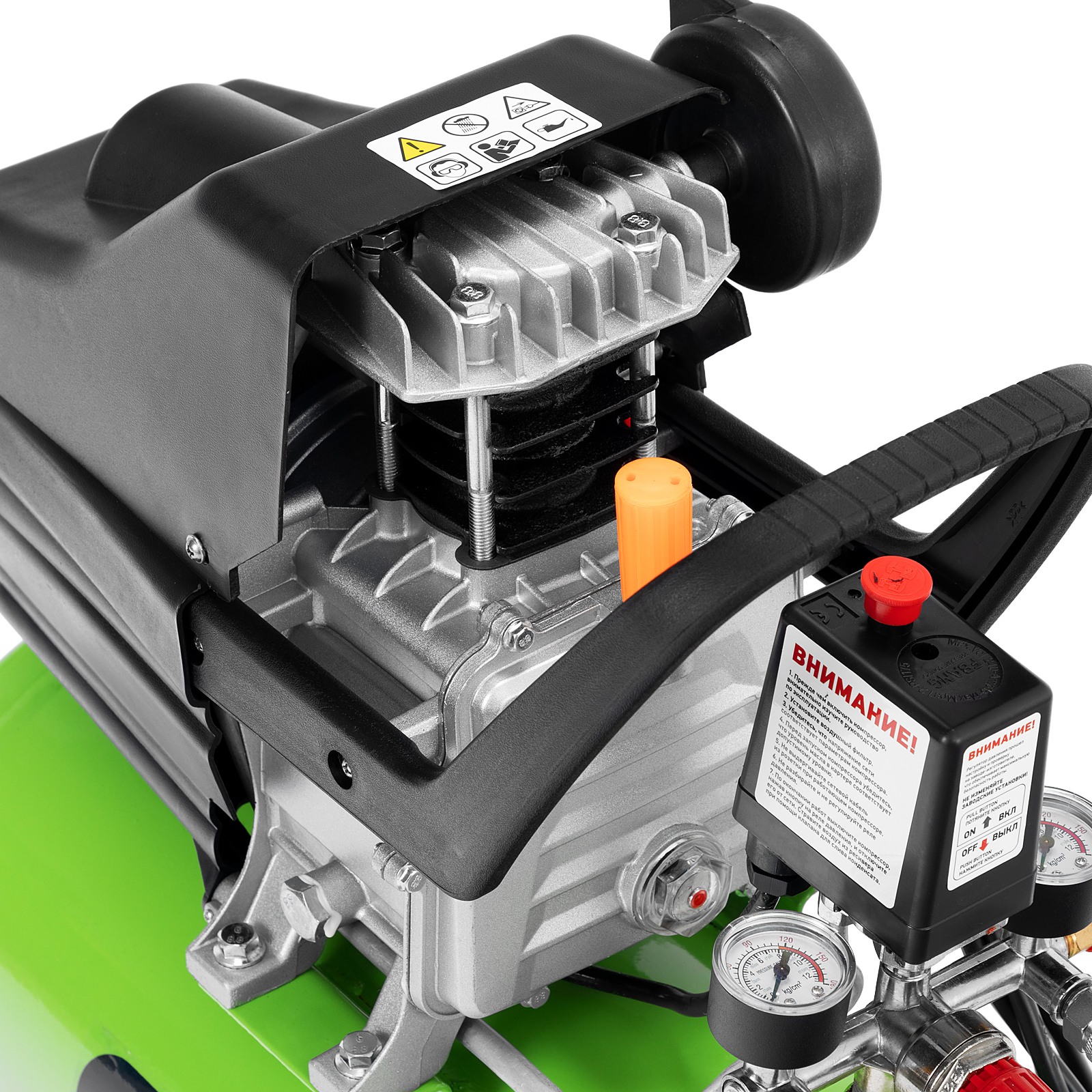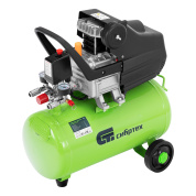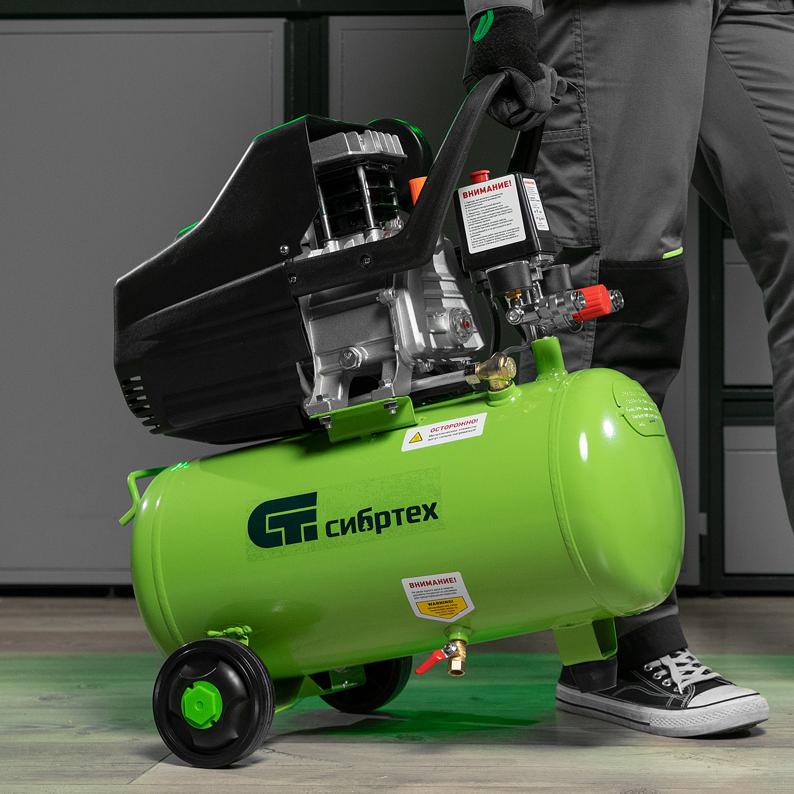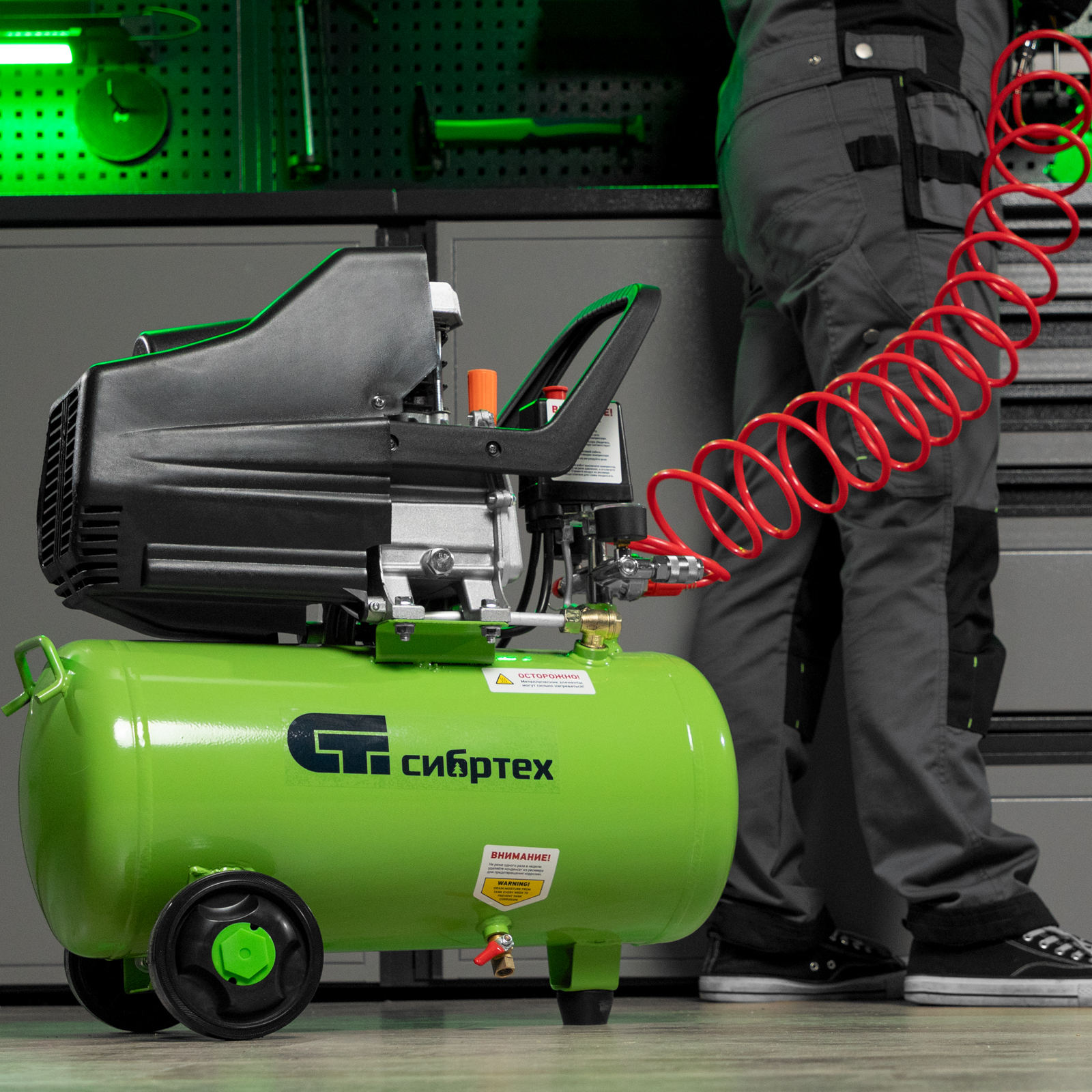 Компрессор Сибртех КК-1500/24 ПЛЮС относится к бытовому типу и для работы использует однофазную сеть. Его удобно применять на небольших ремонтных площадках для накачки шин, продувки различных деталей, монтажа и работ на стройке. Устройство комплектуется краскораспылителем, продувным и моечным пистолетами и 5-метровым спиральным шлангом. Это решение значительно экономит время на поиск аксессуаров.Пневмоинструмент из комплекта оснащен коннекторами Рапид (EURO) и готов к использованию с компрессором. Такой набор является необходимым для большинства задач, на которые рассчитан компрессор.В модели одновременно сочетаются мобильность и высокая производительность 198 л/мин. Большой магнитопровод и качественная обмотка статора позволили увеличить мощность двигателя до 1.5 кВт. Сжатый воздух под давлением 8 бар нагнетается в ресивер емкостью 24 литра, а затем подается к пневмоинструменту.Двигатель имеет 3 уровня защиты. Первый - внешняя защита от пыли, влаги и сколов за счет прочного кожуха. Второй - предохранитель по току, отключающий устройство при перегрузке. Наконец, третий - предотвращение перегрева благодаря увеличенной площади ребер охлаждения и эффективному теплоотводу.Преимущества:Контроль давления в ресивере и на выходной магистрали - 2 манометра расположены в удобной для просмотра плоскости, поэтому к ним не нужно наклоняться или приседать.Сапун для сброса давления - в системе поддерживается равенство давлений и при необходимости излишки газа оперативно отводятся.Продуманность до мелочей - места стыковки на картере гладкие, т.к. дополнительно обработаны после отливки, что исключает протечку масла и заботу о ее устранении.Легкое удаление влаги - после рабочего цикла конденсат удаляется с помощью удобного шарового крана без применения ключа.Защита от разрушения - антикоррозийная краска препятствует появлению ржавчины снаружи и внутри ресивера.Передвижная конструкция - компрессор спокойно переместит даже пожилой человек благодаря двум колесам и удобной рукоятке.Сглаживание вибраций - Вы не ощутите колебаний рядом с работающей установкой за счет прорезиненной опоры.Легкий вес и небольшие габариты - компрессор довольно компактен, весит всего 24 кг несмотря на высокую производительность.