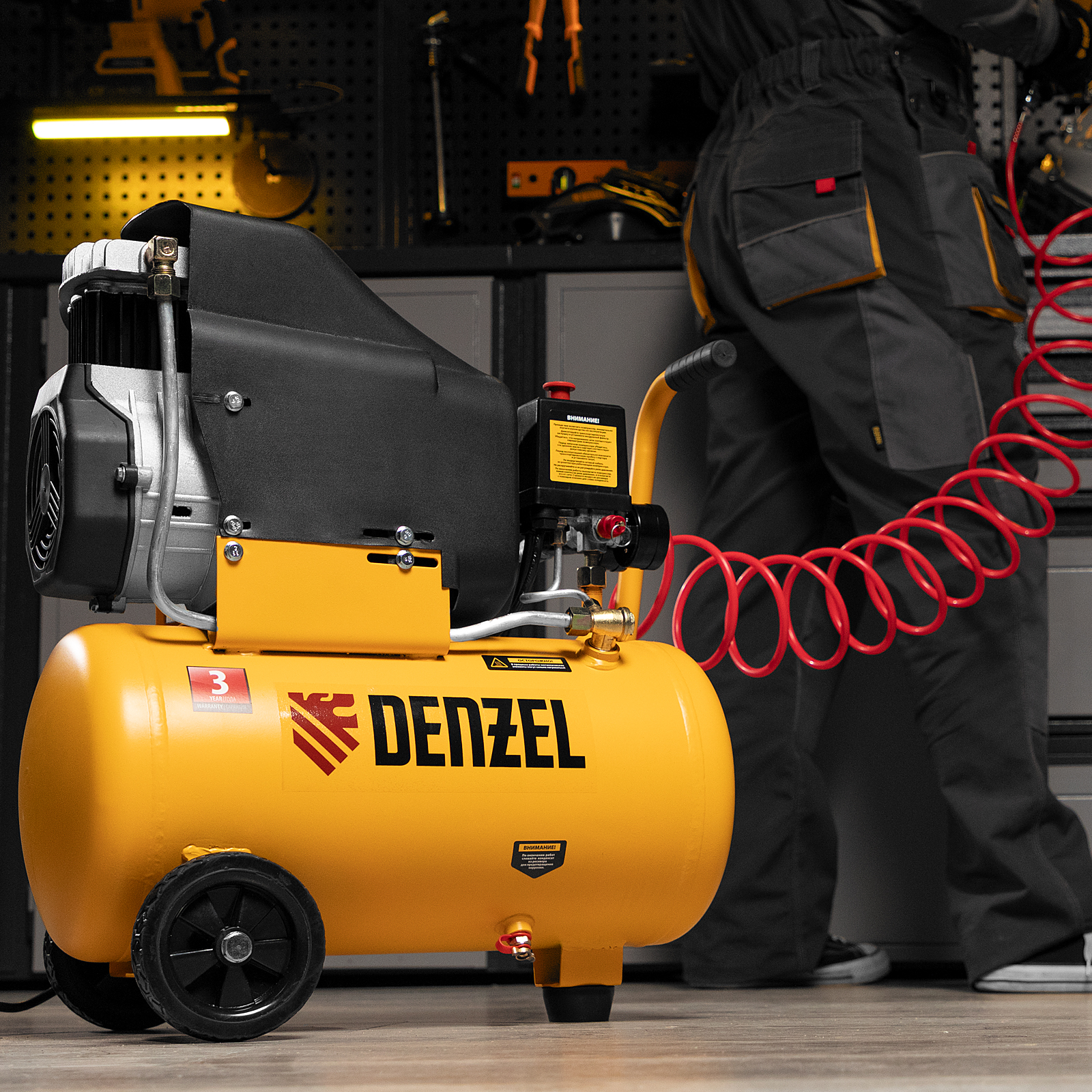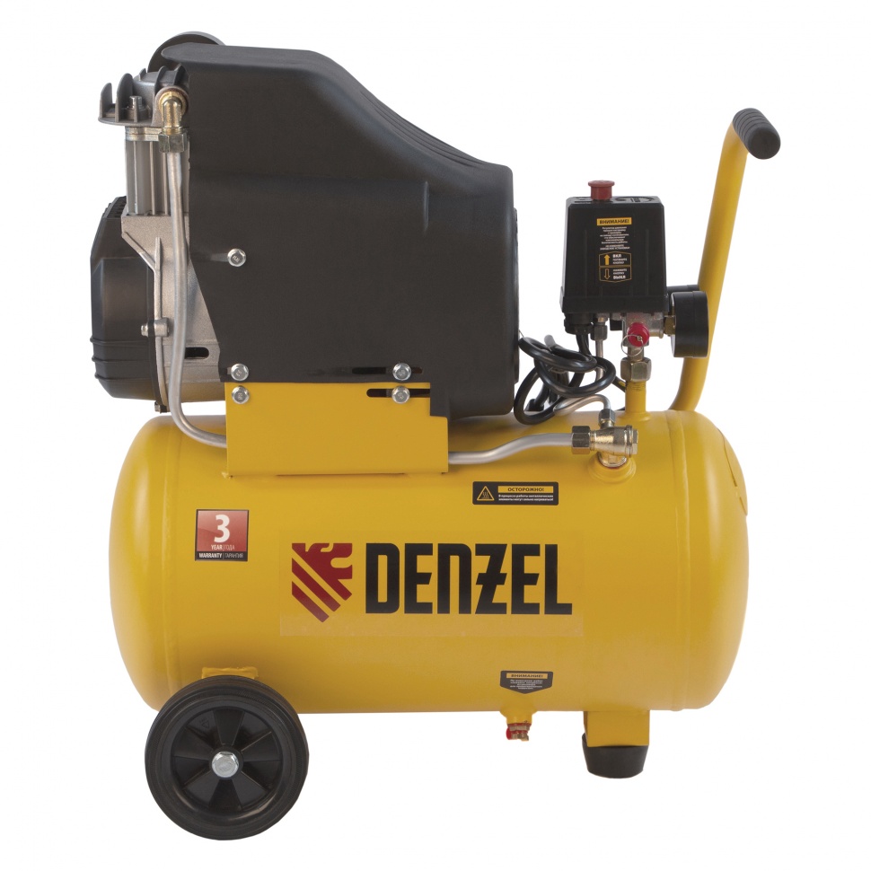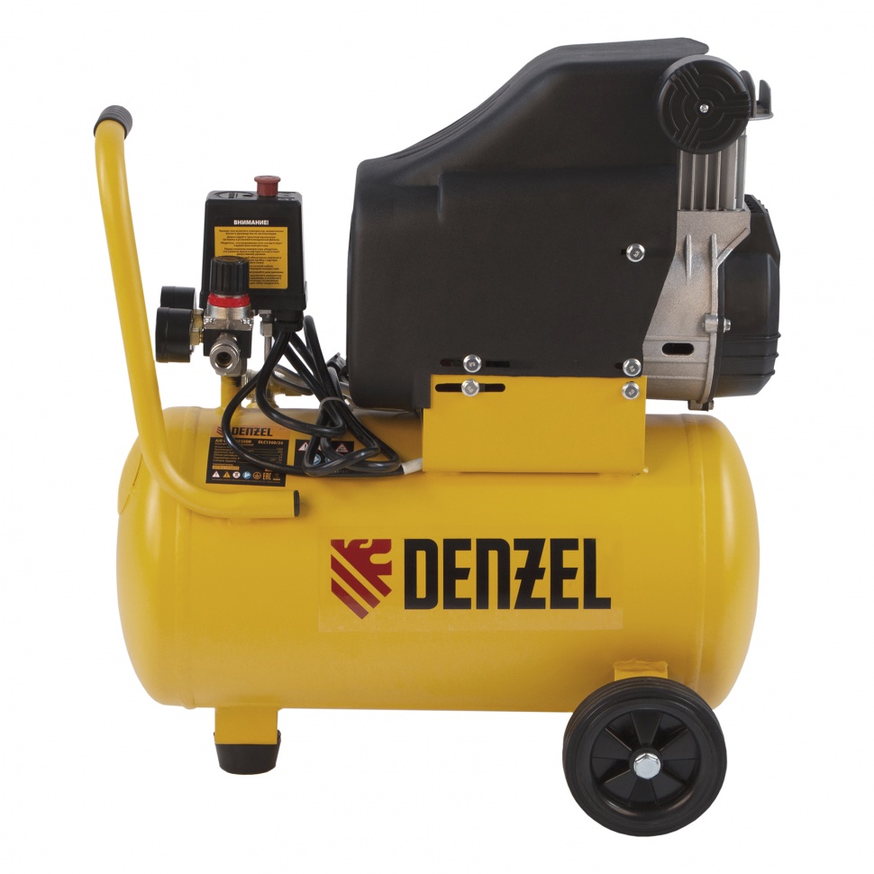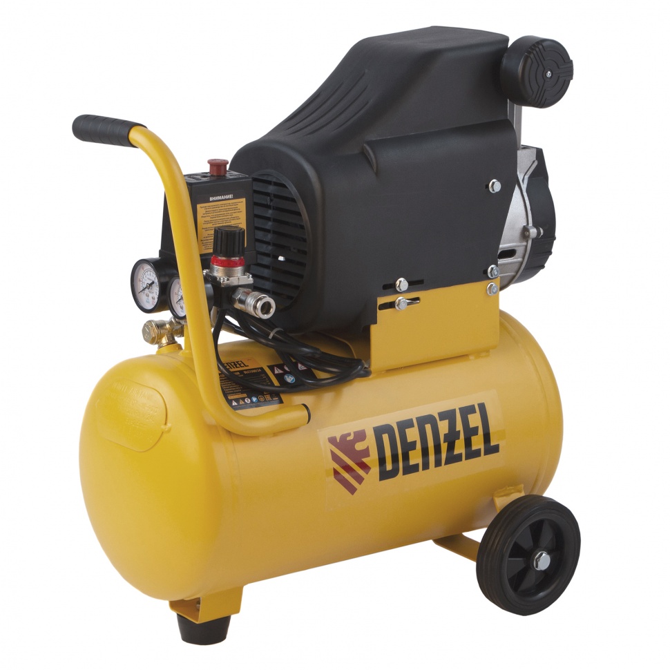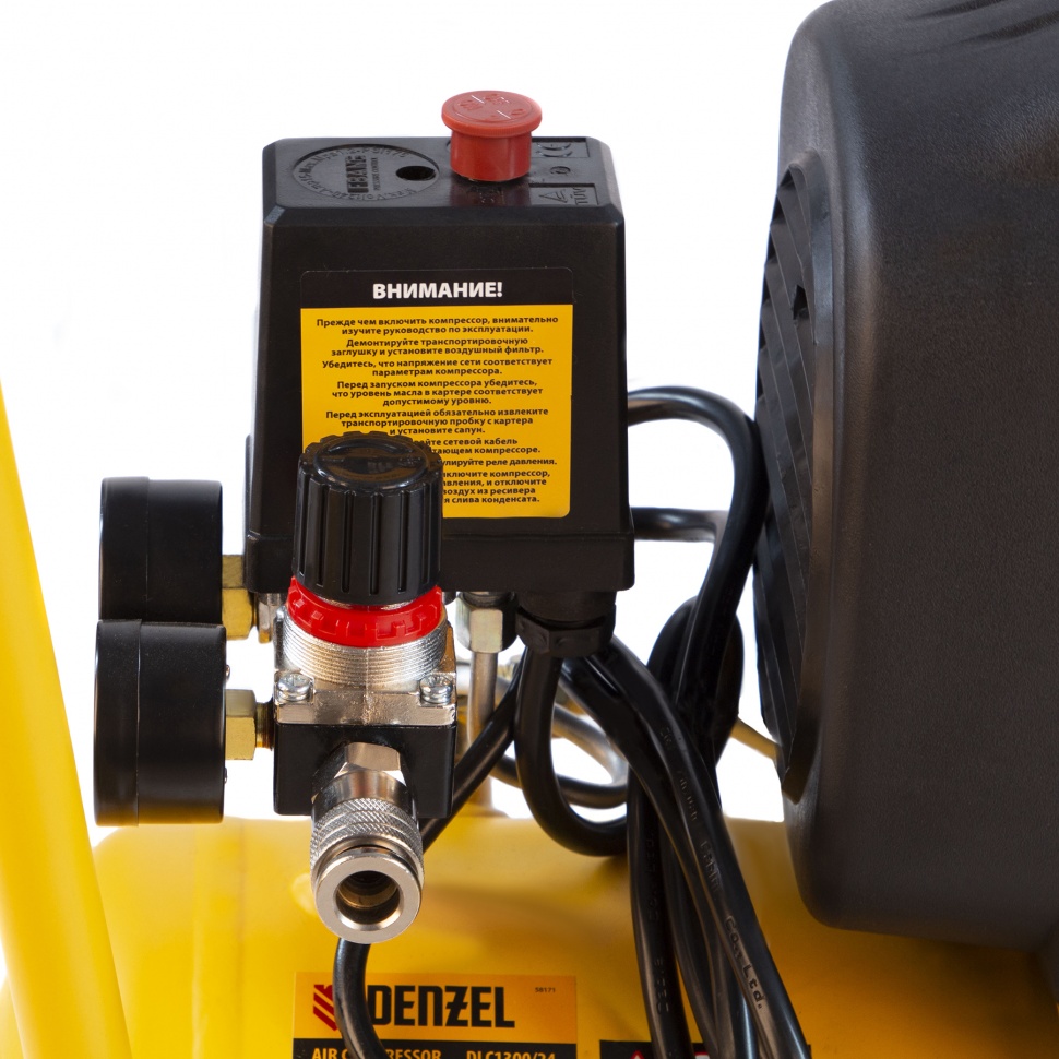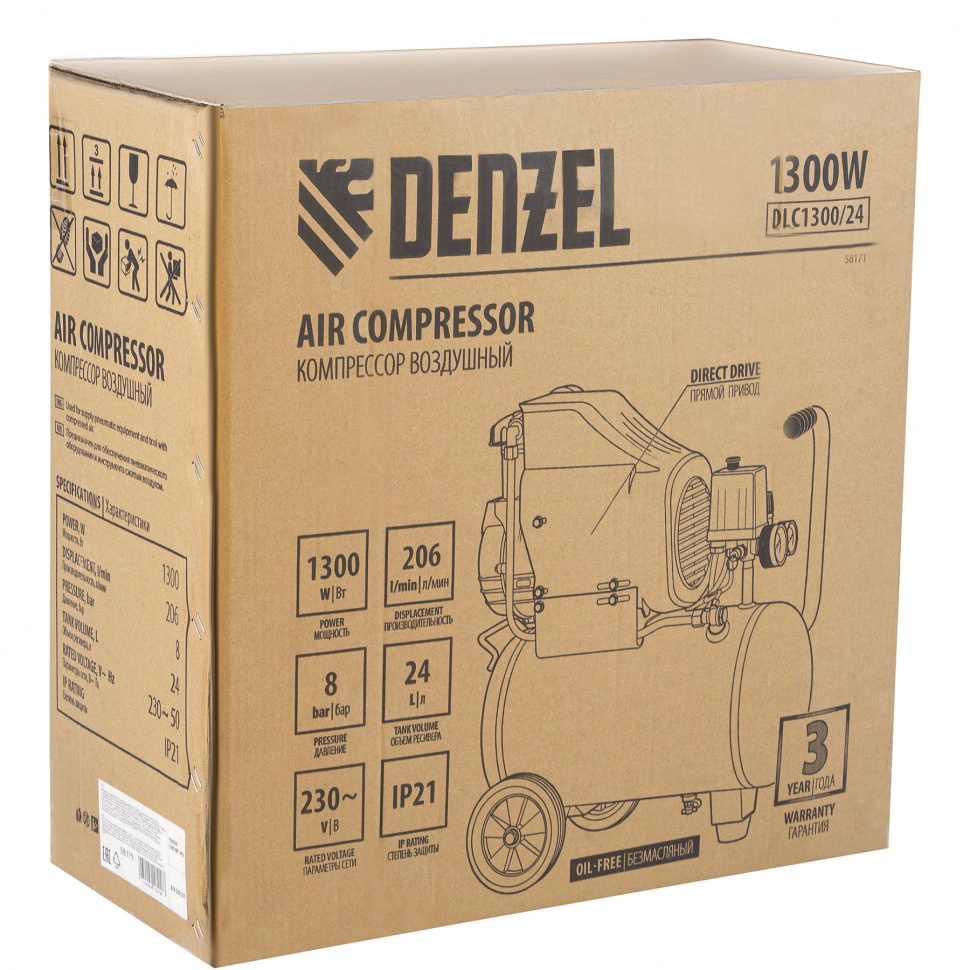 Безмасляный воздушный компрессор Denzel DLC1300/24 58171 мощностью 1,3 кВт, с объемом ресивера 24 л и производительностью на входе 206 л/мин, обеспечивает на выходе чистый сжатый воздух без примесей масла, что позволяет использовать его при окрашивании, креплении паркета и вагонки, продувке электронной техники, накачке шин. Подходит для обеспечения длительной работы пневмоаэрографа, пневмогравера, пневмошуруповерта, пневмодрели и пневмонейлера, а также другого пневмоинструмента. Быстроразъемный коннектор Euro (Rapid) упрощает подключение пневмомагистрали.ПреимуществаТермозащита — предохранитель останавливает работу двигателя при перегреве, что увеличивает срок службы компрессора.Продуманная конструкция — антифрикционное покрытие цилиндра уменьшает трение, а его ребристая поверхность улучшает теплоотвод, что снижает нагрузку на двигатель.Стабильная работа без потери производительности — фильтр с бумажным картриджем обладает повышенной пропускной способностью.Чистый воздух — уплотнитель на фильтре препятствует попаданию в цилиндр посторонних примесей.Безопасность — предохранительный клапан своевременно сбрасывает избыточное давление, предотвращая аварийную ситуацию.Быстрый слив конденсата — пробка расположена снизу и имеет специальные упоры для откручивания без инструмента.Контроль рабочих параметров — компрессор оснащен двумя манометрами для отслеживания давления в пневмолинии и ресивере.Отсутствие масла — компрессор не нуждается в постоянном техническом обслуживании.Накладки на ножках — компрессор отличается устойчивостью и не испытывает повышенных вибраций во время работы.Мобильность — компрессор, оснащенный ручкой и колесами, весит 22,6 кг, что упрощает его транспортировку.Расширенная 3-летняя гарантия — надежность компрессора подтверждена производителем.