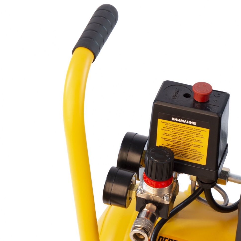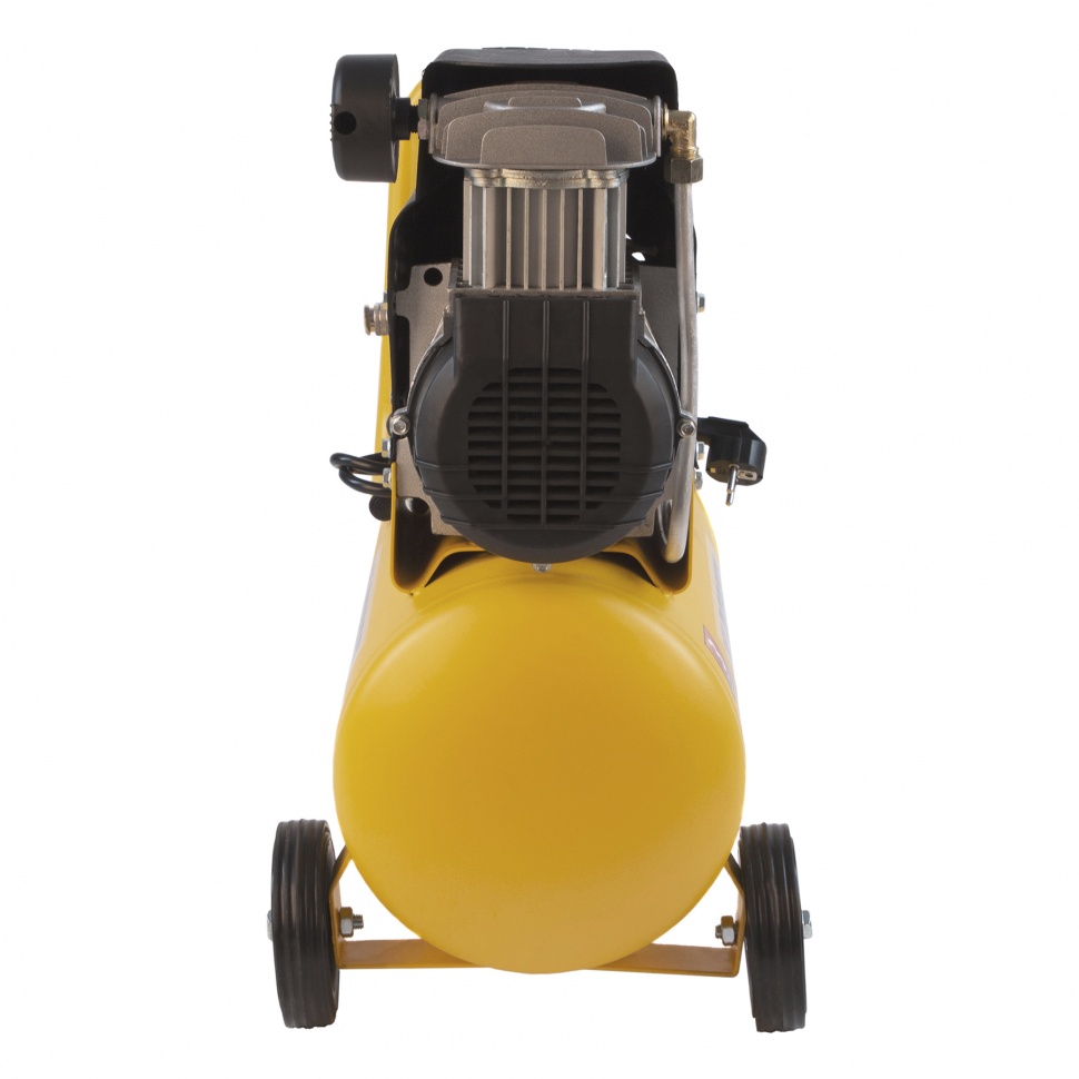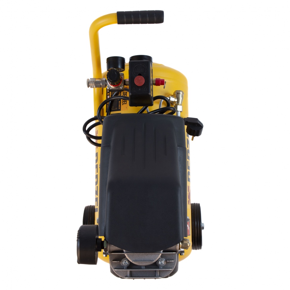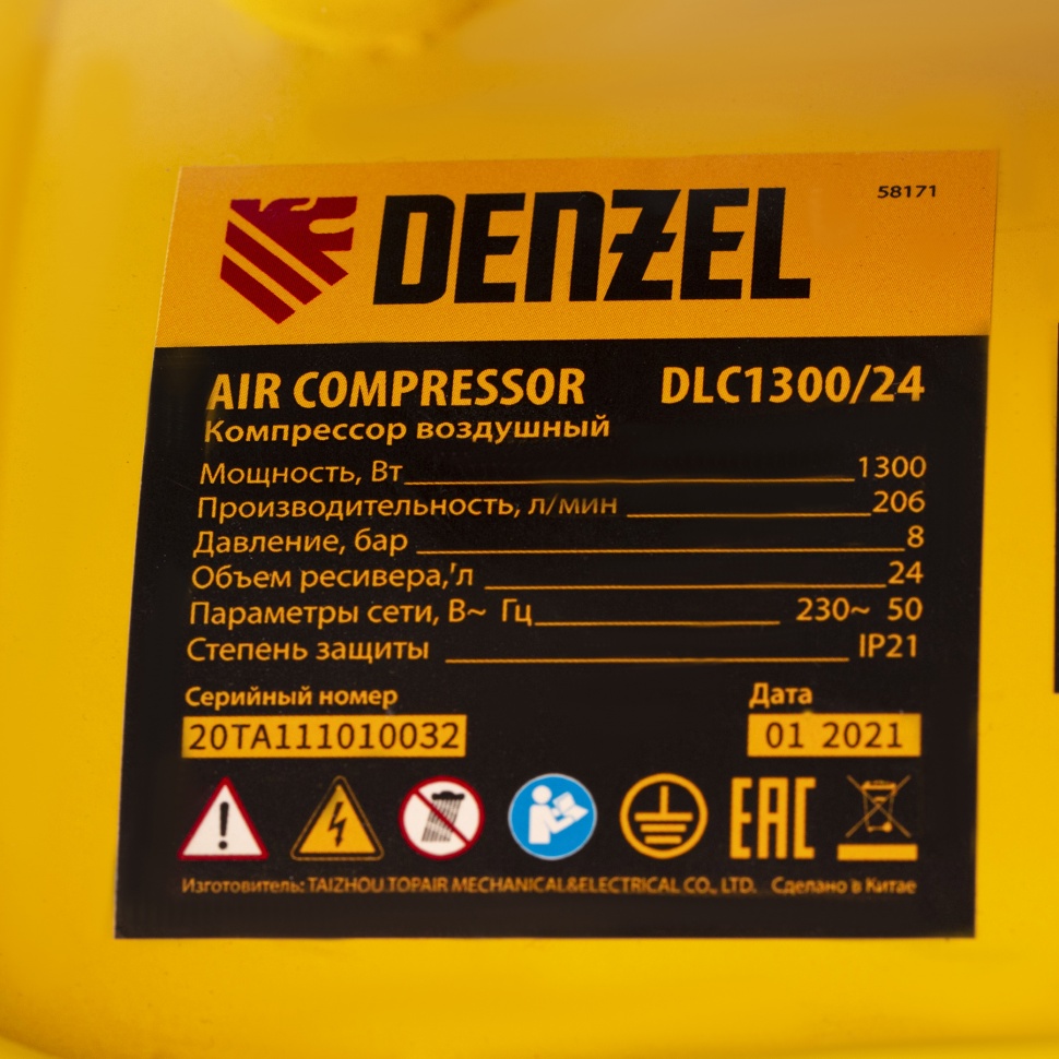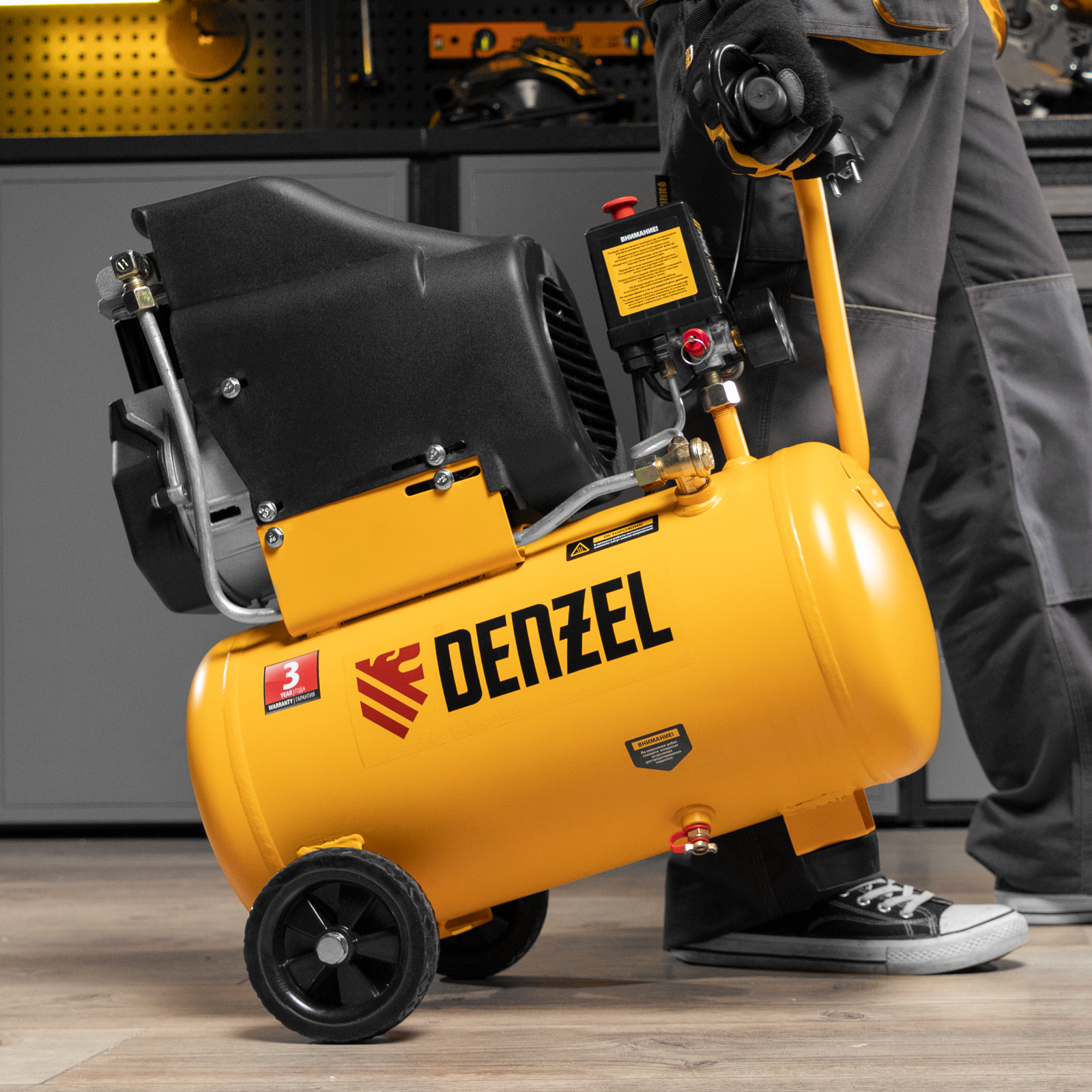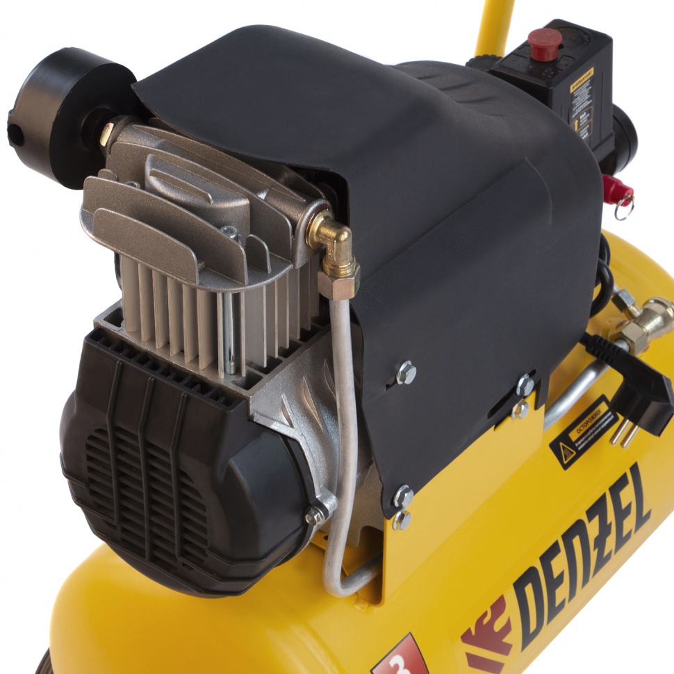 Безмасляный воздушный компрессор Denzel DLC1300/24 58171 мощностью 1,3 кВт, с объемом ресивера 24 л и производительностью на входе 206 л/мин, обеспечивает на выходе чистый сжатый воздух без примесей масла, что позволяет использовать его при окрашивании, креплении паркета и вагонки, продувке электронной техники, накачке шин. Подходит для обеспечения длительной работы пневмоаэрографа, пневмогравера, пневмошуруповерта, пневмодрели и пневмонейлера, а также другого пневмоинструмента. Быстроразъемный коннектор Euro (Rapid) упрощает подключение пневмомагистрали.ПреимуществаТермозащита — предохранитель останавливает работу двигателя при перегреве, что увеличивает срок службы компрессора.Продуманная конструкция — антифрикционное покрытие цилиндра уменьшает трение, а его ребристая поверхность улучшает теплоотвод, что снижает нагрузку на двигатель.Стабильная работа без потери производительности — фильтр с бумажным картриджем обладает повышенной пропускной способностью.Чистый воздух — уплотнитель на фильтре препятствует попаданию в цилиндр посторонних примесей.Безопасность — предохранительный клапан своевременно сбрасывает избыточное давление, предотвращая аварийную ситуацию.Быстрый слив конденсата — пробка расположена снизу и имеет специальные упоры для откручивания без инструмента.Контроль рабочих параметров — компрессор оснащен двумя манометрами для отслеживания давления в пневмолинии и ресивере.Отсутствие масла — компрессор не нуждается в постоянном техническом обслуживании.Накладки на ножках — компрессор отличается устойчивостью и не испытывает повышенных вибраций во время работы.Мобильность — компрессор, оснащенный ручкой и колесами, весит 22,6 кг, что упрощает его транспортировку.Расширенная 3-летняя гарантия — надежность компрессора подтверждена производителем.