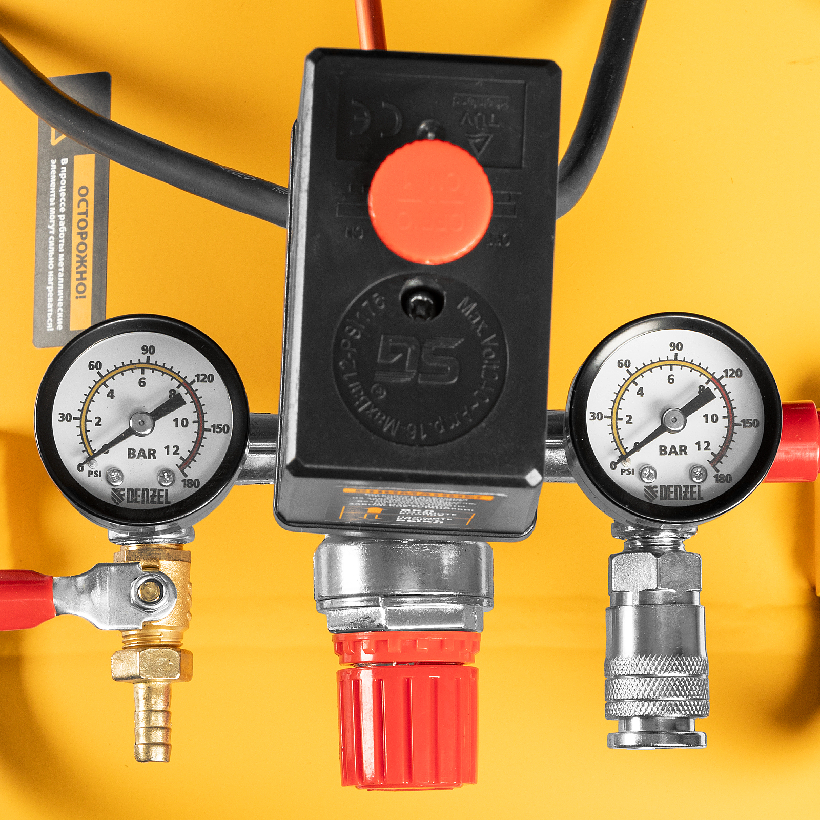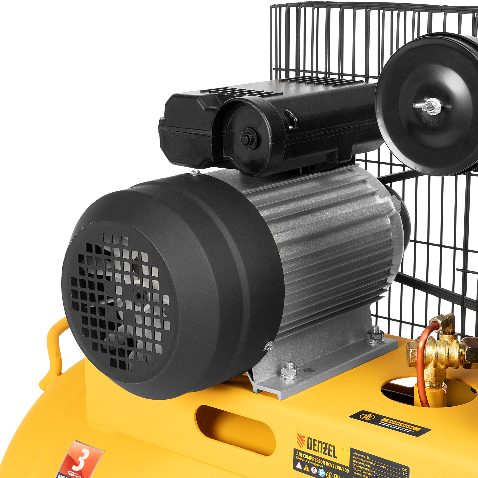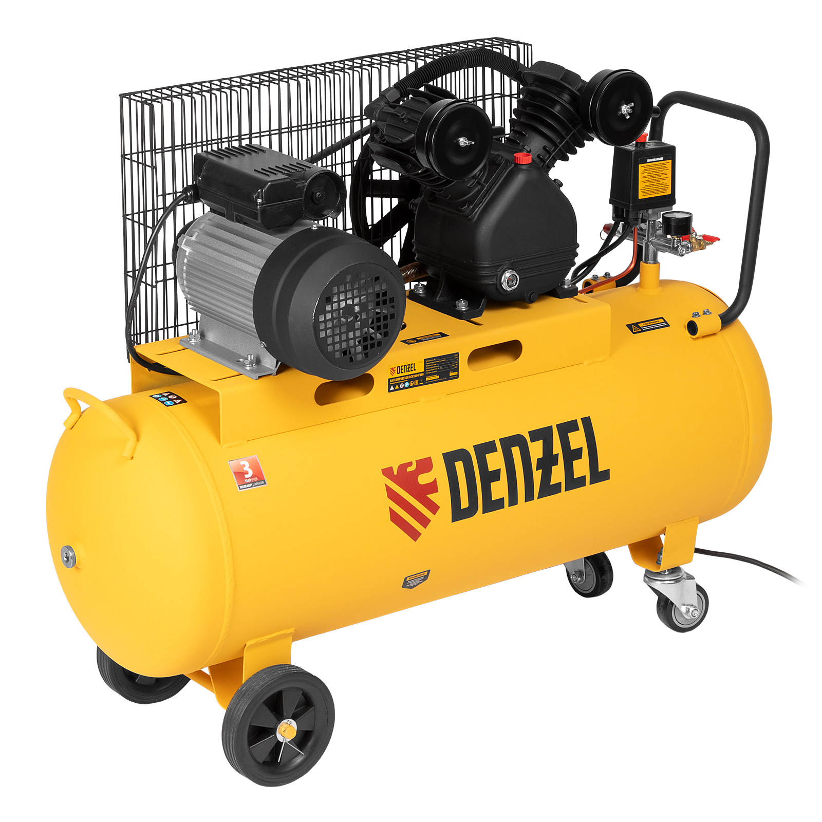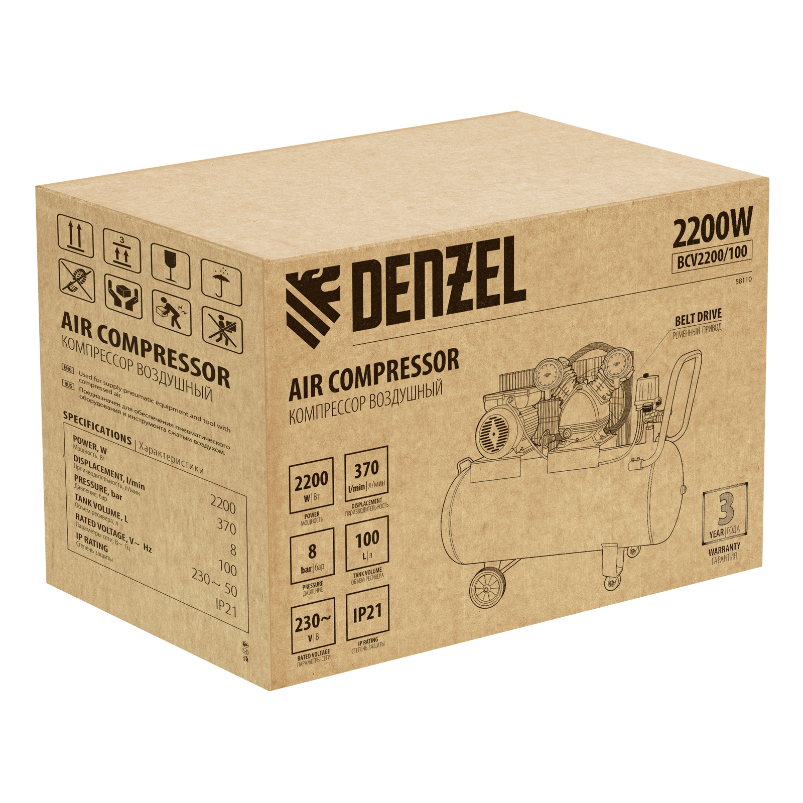 Компрессор Denzel BCV2200/100 58110 мощностью 2,2 кВт и производительностью 370 л/мин, с ресивером на 100 литров, предназначен для работ в мастерских, автосервисах, на производствах или в быту. К нему можно подключать сразу 2 пневмоинструмента, например, дрель, долото, заклепочный или продувочный пистолет, краскопульт, очиститель окалины и пр.Высокий ресурс чугунных цилиндров, надежная ременная передача и объемный ресивер на 100 л позволяют использовать компрессор длительное время. При необходимости можно напрямую подключать второй накопитель или пневмомагистраль через дополнительный порт.ПреимуществаТепловая защита — температура обмоток двигателя контролируется и в случае превышения допустимой нормы работа прекращается, чтобы устройство охладилось.Защита от перегрузки — если сила тока превышает безопасный порог, мотор моментально отключается, поэтому он остается в сохранности даже в случае резко возрастающей нагрузки.Автоматизация работы — реле FBANG самостоятельно останавливает и повторно запускает двигатель для поддержания давления в диапазоне 6,5-8 бар.Защита от аварийных ситуаций — если реле давления по каким-то причинам не остановит работу при превышении допустимого давления, лишний воздух стравится через предохранительный клапан.Удобный контроль работы — 2 манометра позволяют без труда отслеживать уровень давления как в ресивере, так и на выходной магистрали.Высокое качество ресивера — толщина стенок более 2 мм, прочное сварное соединение и антикоррозийное покрытие надежно защищают его от внутренних разрушений.Надежный картер — детали прочно прилегают друг к другу, а крышка плотно закрывается, что обеспечивает полную защиту от протекания масла.Смотровое окно — уровень масла в картере удобно отслеживать, это позволяет вовремя доливать его и избегать поломок двигателя.Коррозионностойкая клапанная плита — гальваническое покрытие предотвращает разрушение стали, это позволяет сохранить герметичность клапанного механизма и высокий ресурс компрессора.Воздушный фильтр — весь входящий поток проходит через гофробумагу, которая практически не создает сопротивления и удерживает даже мелкие частички пыли. Это повышает износоустойчивость цилиндров и защищает их от разрушения.Клапан слива конденсата — скопившаяся влага быстро удаляется из ресивера с потоком оставшегося воздуха после окончания работы.Транспортировка без проблем — 2 колеса и П-образная ручка помогают перевозить тяжелый компрессор по рабочей площадке.Устойчивость — опоры с прорезиненным покрытием позволяют удобно разместить компрессор и гасят вибрации.Гарантия 3 года — высокое качество компрессора подтверждено производителем.