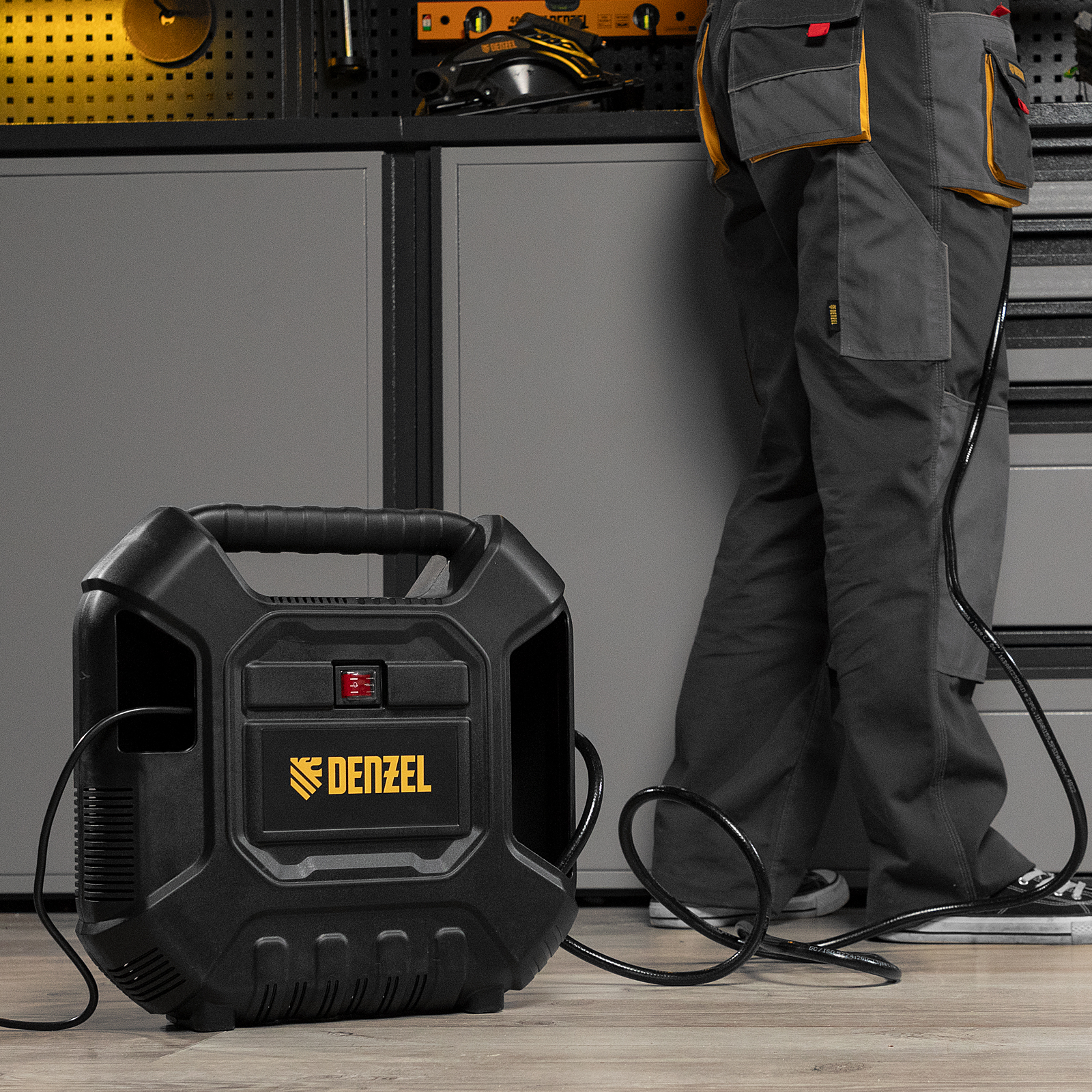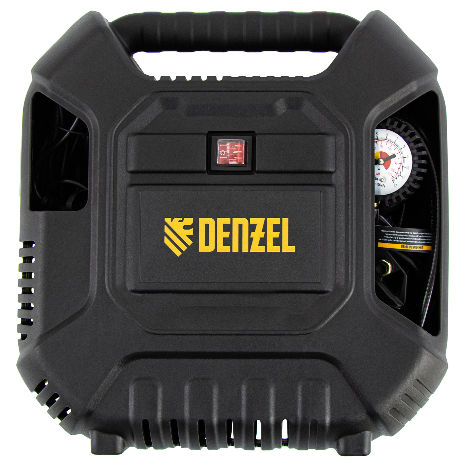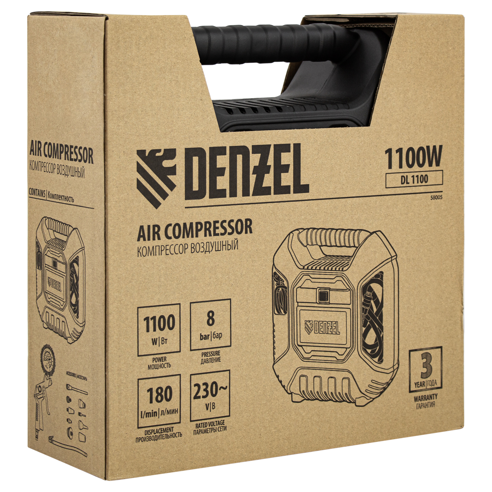 Воздушный безмасляный компрессор Denzel DL1100 58005 мощностью 1,1 кВт и производительностью 180 л/мин предназначен для подключения пневмопистолетов, продувочного инструмента и другого оборудования, исключающего контакт с маслом. Высокой производительности хватит, чтобы подкачать шины, продуть технику, провести частичную подкраску и обеспечить выполнение других технических работ.Компрессор выполнен в виде моноблока, что очень удобно для его хранения, переноски и размещения на рабочей площадке. Отсутствие ресивера и безмасляная технология позволяют получать чистый воздух без примесей влаги и масляных паров. Также отпадает необходимость проверять давление в ресивере и удалять конденсат после рабочего цикла.ПреимуществаКомпактность — в компрессоре предусмотрены отсеки для кабеля питания, аксессуаров и пневмопистолета со шлангом, что позволяет хранить комплектующие в одном месте.Безопасное включение — кнопка пуска закрыта пластиковым кожухом, препятствующим попаданию влаги.Наличие манометра — контролировать давление сжатого воздуха можно по измерительному прибору, расположенному на корпусе пневмопистолета.Термозащита — электродвигатель моментально отключается при превышении допустимой температуры, это позволяет избежать поломок и продлить средний срок службы устройства до 5 лет.Предохранительный клапан — при возникновении избыточного давления происходит автоматическое стравливание газа, что предотвращает возникновение аварийной ситуации.Продуманность до мелочей — прорезиненные опоры гасят вибрации и повышают комфорт работы.Легкость перемещения — ребристая транспортировочная ручка делает транспортировку кейса простой и удобной.Полная комплектация — к компрессору прилагается набор переходников и насадок, универсальный пневмопистолет, быстросъемное соединение со сменными соплами для накачивания шин и продувки воздухом.Гарантия 3 года — высокое качество компрессора подтверждено производителем.