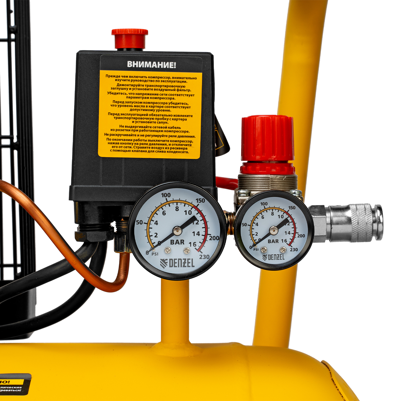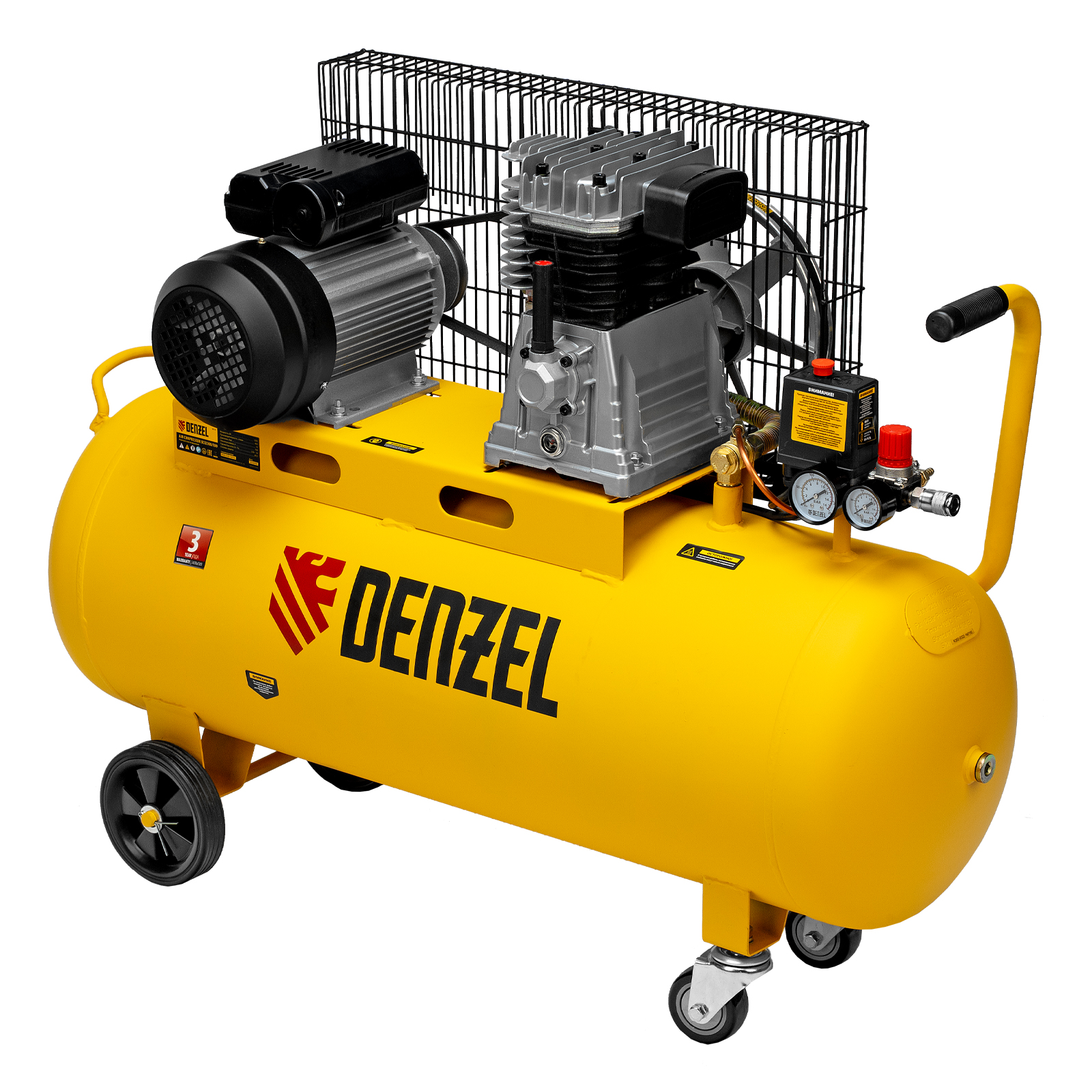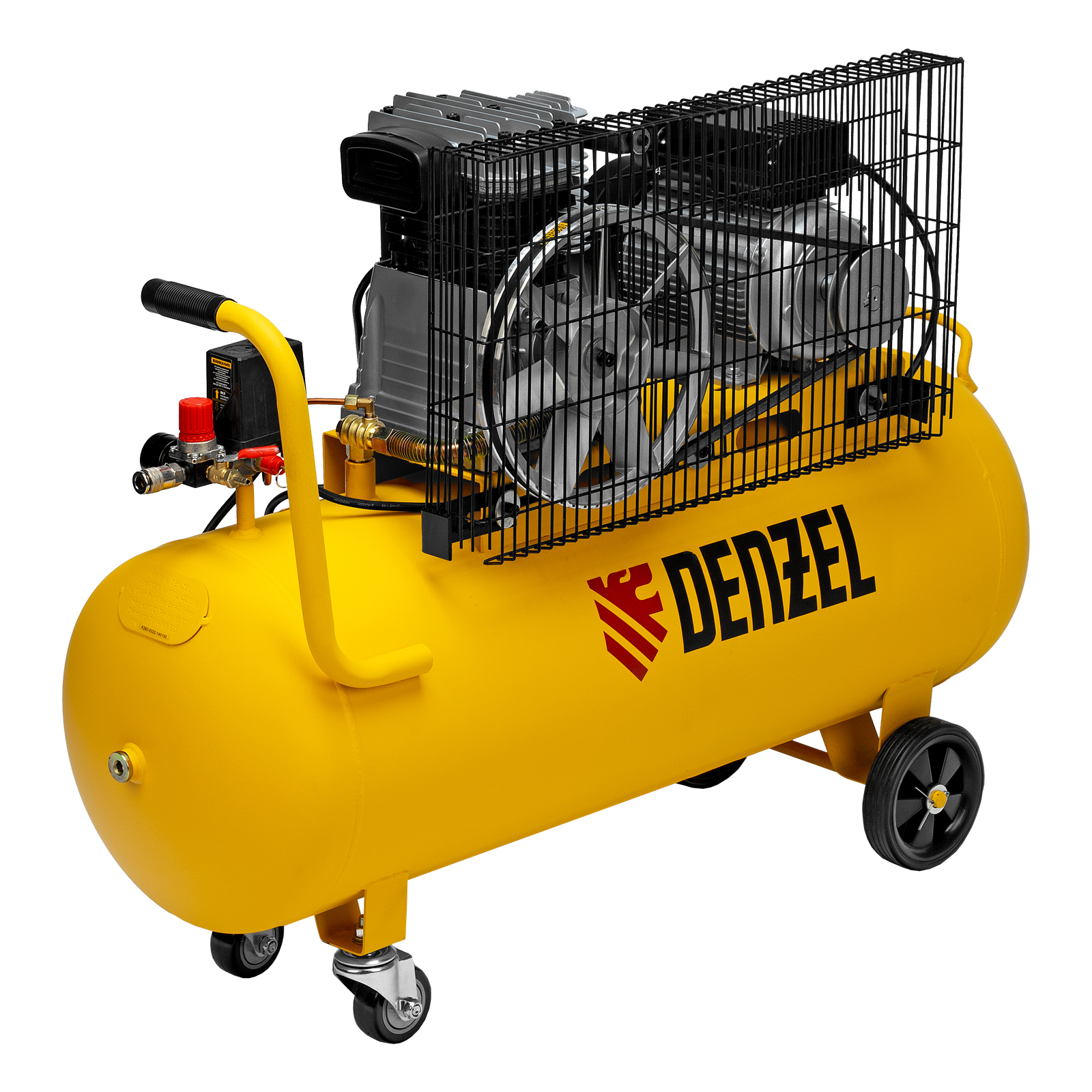 Масляный компрессор Denzel BCI2300/100 с ременным приводом предназначен для работы с несколькими пневмоинструментами сразу. Через быстросъемный коннектор «Рапид» и штуцер «Елочка» к нему можно подключить продувочный пистолет или пистолет для накачки шин, дрель, пневмоножницы и пр. Мощности 2.3 кВт достаточно для длительных работ в автосервисах, на производствах, в мастерских.Отличительная особенность компрессора - двухуровневая защита электродвигателя. Термодатчик, установленный в обмотке, останавливает работу при перегреве, а защита от перегрузок прекращает питание при превышении порогового значения потребляемого тока. Такая система сохраняет двигатель, не допускает его поломок и выгодно отличает от конкурентов, обычно использующих один тип защиты.Преимущества:Медная обмотка позволяет использовать компрессор полный рабочий день без последствий и риска перегрева.Прессостат отвечает за автоматизацию работы: двигатель выключается при заполнении ресивера до 10 бар и снова включается, когда давление падает ниже необходимого уровня.Спускной клапан предохраняет ресивер от взрыва в случае, когда по какой-то причине реле не сработало. Удаление лишнего давления происходит моментально в автоматическом режиме.Ресивер выполнен из конструктивной стали толщиной более 2 мм, что обеспечивает прочный сварочный шов и надежно защищает его от утечек воздуха.Двухцилиндровая компоновка с большими ребрами охлаждения позволяет добиться быстрого охлаждения компрессора. Цилиндры выполнены из прочного чугуна, что повышает надежность и ресурс изделия.Клапанная плита имеет гальванизированное покрытие, которое препятствует возникновению коррозии и окислению.Клапаны выполнены из японской «нержавейки» AISI 420, что позволяет работать длительное время под высокой нагрузкой.Регулятор выходного давления позволяет установить его на необходимом уровне под конкретный тип инструмента. Это особенно важно при окрасочных работах.2 больших манометра обеспечивают быстрое считывание показаний по давлению сжатого воздуха в ресивере и на выходной магистрали.Порт прямого подключения к пневмомагистрали упрощает соединение с дополнительным ресивером или пневмолинией и исключает потерю производительности.Компрессор оснащен двумя парами колес. Передние увеличивают его маневренность при развороте, а задние облегчают перемещение по объекту.Удобная рукоятка облегчает наклон ресивера при его обслуживании и транспортировку.Сливной клапан в нижней части накопителя легко открывается и облегчает удаление конденсата вместе с потоком оставшегося воздуха.