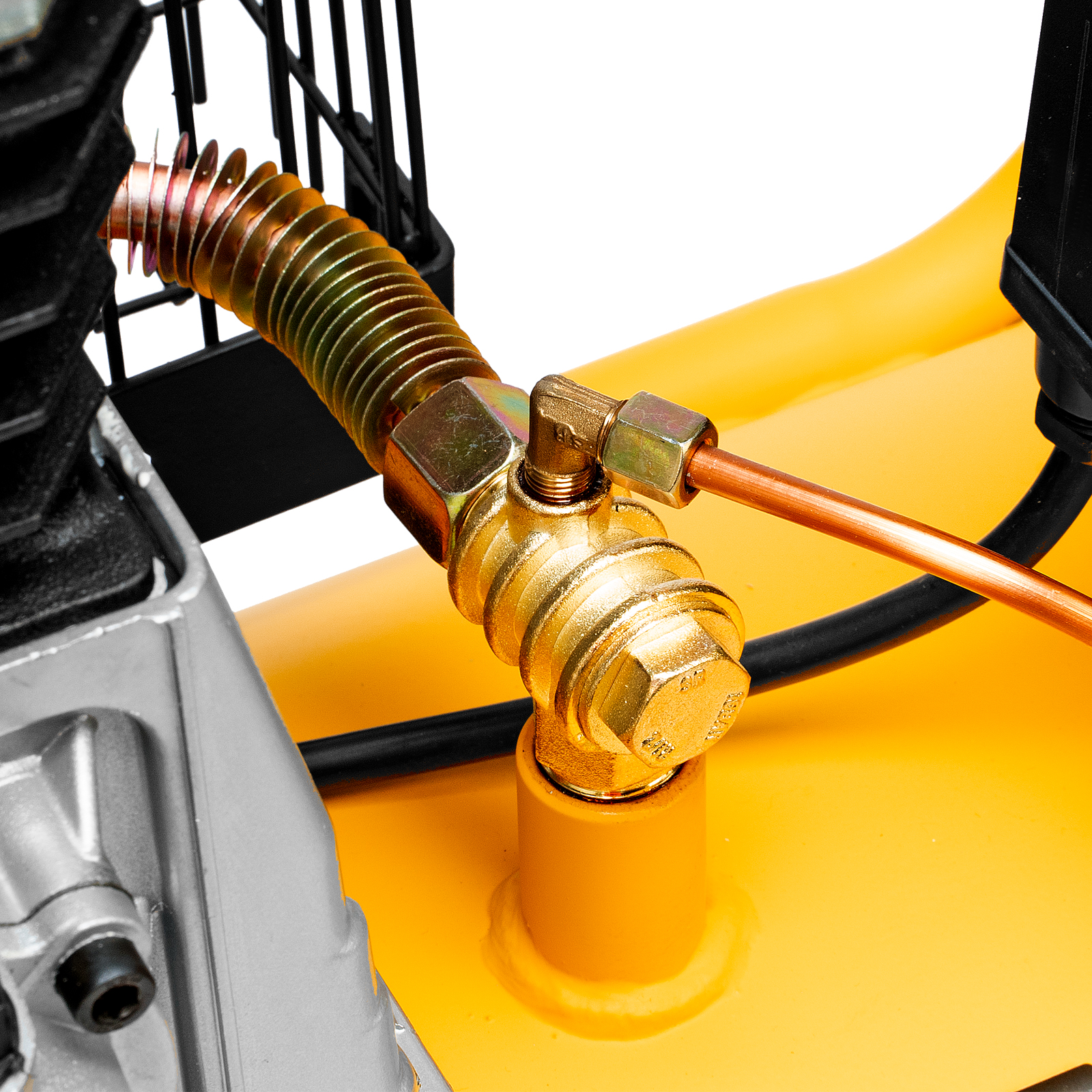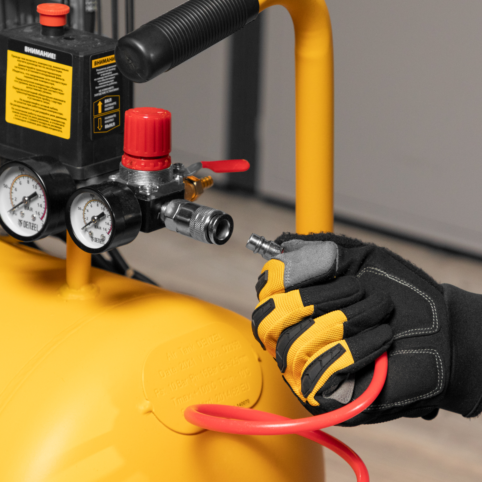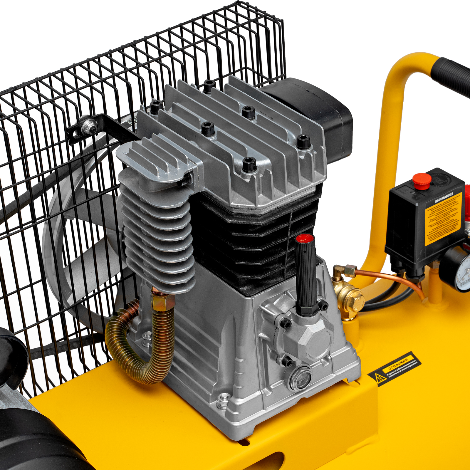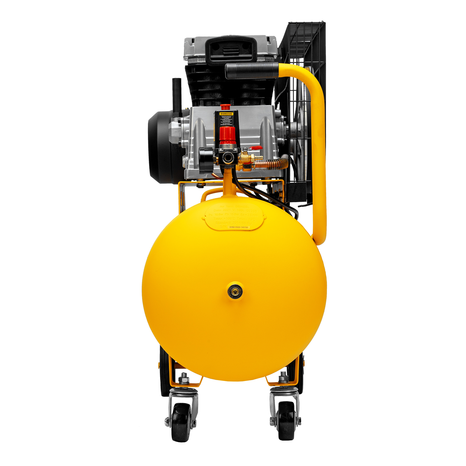 Масляный компрессор Denzel BCI2300/100 с ременным приводом предназначен для работы с несколькими пневмоинструментами сразу. Через быстросъемный коннектор «Рапид» и штуцер «Елочка» к нему можно подключить продувочный пистолет или пистолет для накачки шин, дрель, пневмоножницы и пр. Мощности 2.3 кВт достаточно для длительных работ в автосервисах, на производствах, в мастерских.Отличительная особенность компрессора - двухуровневая защита электродвигателя. Термодатчик, установленный в обмотке, останавливает работу при перегреве, а защита от перегрузок прекращает питание при превышении порогового значения потребляемого тока. Такая система сохраняет двигатель, не допускает его поломок и выгодно отличает от конкурентов, обычно использующих один тип защиты.Преимущества:Медная обмотка позволяет использовать компрессор полный рабочий день без последствий и риска перегрева.Прессостат отвечает за автоматизацию работы: двигатель выключается при заполнении ресивера до 10 бар и снова включается, когда давление падает ниже необходимого уровня.Спускной клапан предохраняет ресивер от взрыва в случае, когда по какой-то причине реле не сработало. Удаление лишнего давления происходит моментально в автоматическом режиме.Ресивер выполнен из конструктивной стали толщиной более 2 мм, что обеспечивает прочный сварочный шов и надежно защищает его от утечек воздуха.Двухцилиндровая компоновка с большими ребрами охлаждения позволяет добиться быстрого охлаждения компрессора. Цилиндры выполнены из прочного чугуна, что повышает надежность и ресурс изделия.Клапанная плита имеет гальванизированное покрытие, которое препятствует возникновению коррозии и окислению.Клапаны выполнены из японской «нержавейки» AISI 420, что позволяет работать длительное время под высокой нагрузкой.Регулятор выходного давления позволяет установить его на необходимом уровне под конкретный тип инструмента. Это особенно важно при окрасочных работах.2 больших манометра обеспечивают быстрое считывание показаний по давлению сжатого воздуха в ресивере и на выходной магистрали.Порт прямого подключения к пневмомагистрали упрощает соединение с дополнительным ресивером или пневмолинией и исключает потерю производительности.Компрессор оснащен двумя парами колес. Передние увеличивают его маневренность при развороте, а задние облегчают перемещение по объекту.Удобная рукоятка облегчает наклон ресивера при его обслуживании и транспортировку.Сливной клапан в нижней части накопителя легко открывается и облегчает удаление конденсата вместе с потоком оставшегося воздуха.