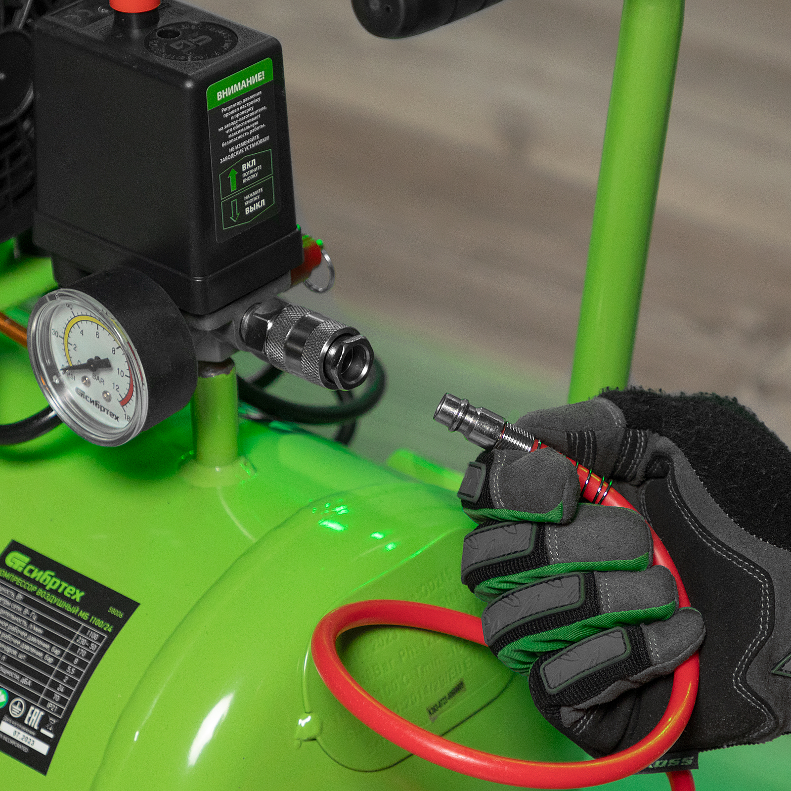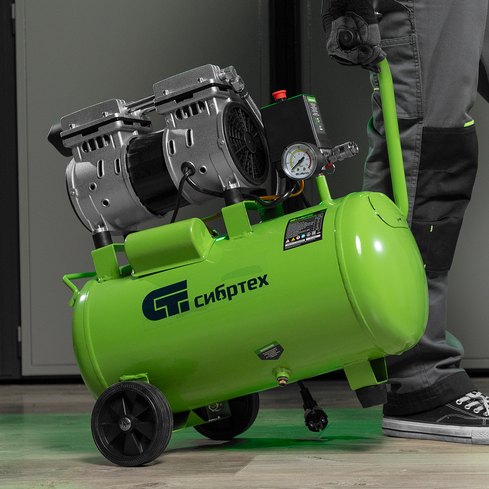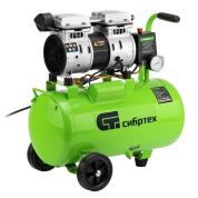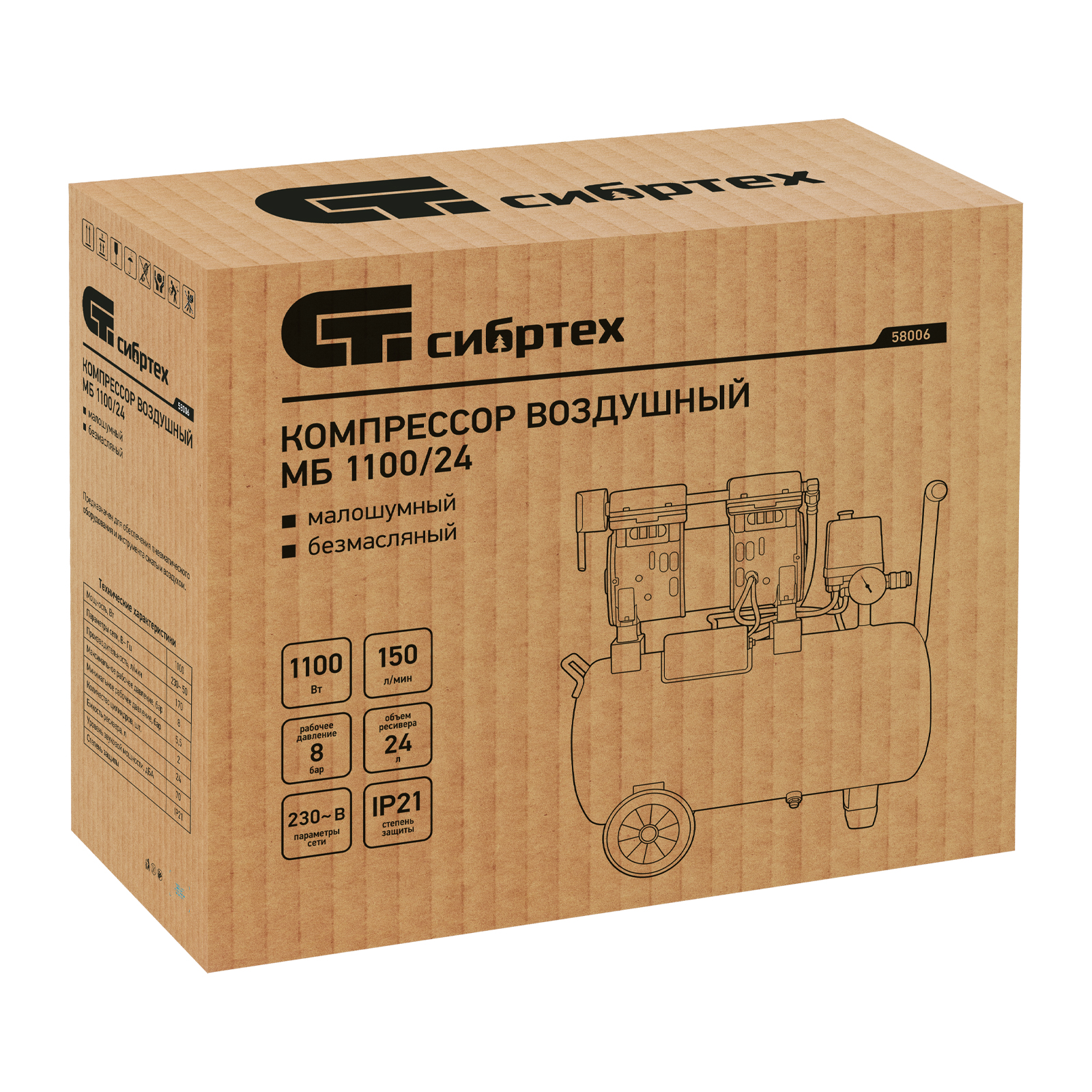 Безмасляный малошумный компрессор Сибртех МБ 1100/24 58006 мощностью 1100 Вт и объемом ресивера 24 л имеет производительность на входе 170 л/мин и сжимает воздух под давлением до 8 бар. Используется для обеспечения функционирования пневмоинструмента, например, краскораспылителя или пневматического шуруповерта. Для работы устройства не требуется масло, поэтому воздух на выходе не содержит его частиц. Компрессор оптимален для проведения покрасочных работ и продувки электронных компонентов.Одна из ключевых особенностей компрессора — низкий уровень шума (не превышает 70 дБ), позволяющий использовать устройство в жилом помещении без дискомфорта для людей.ПреимуществаТермозащита — при превышении допустимой температуры двигатель останавливается, что предотвращает его поломку.Простое подключение — выходной быстросъемный коннектор позволяет подсоединить пневмоинструмент одним движением.Контроль рабочих параметров — компрессор оборудован механическим манометром для отслеживания давления.Безопасная работа — предохранительный клапан защищает от превышения максимально допустимого давления.Автономная работа — реле давления останавливает двигатель по достижении максимального рабочего давления и запускает его, если давление опускается до минимального.Продуманная конструкция — виброопора обеспечивает устойчивость компрессора и гасит колебания, возникающие во время работы.Комфортная транспортировка — производителем предусмотрена ручка и 2 колеса для перемещения.