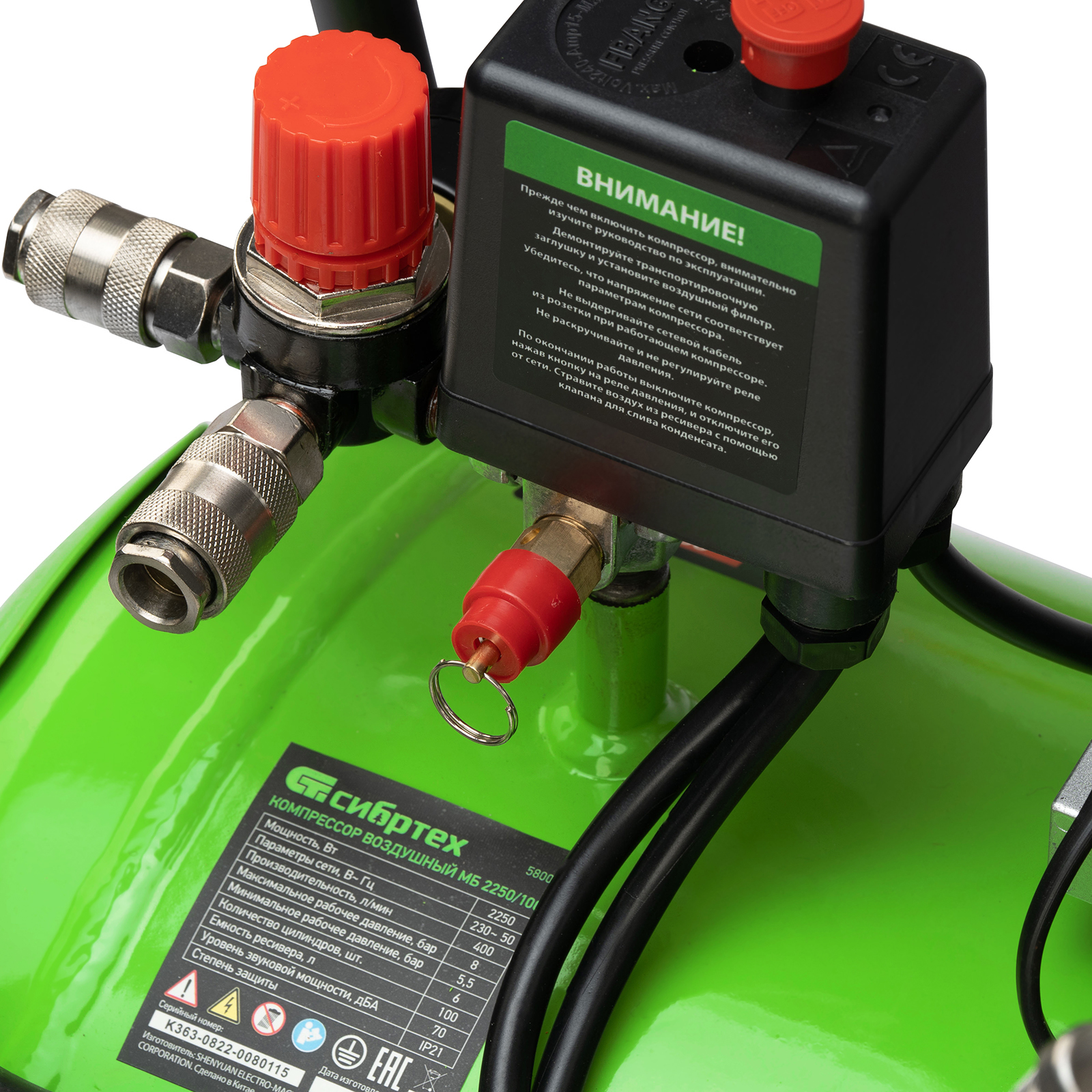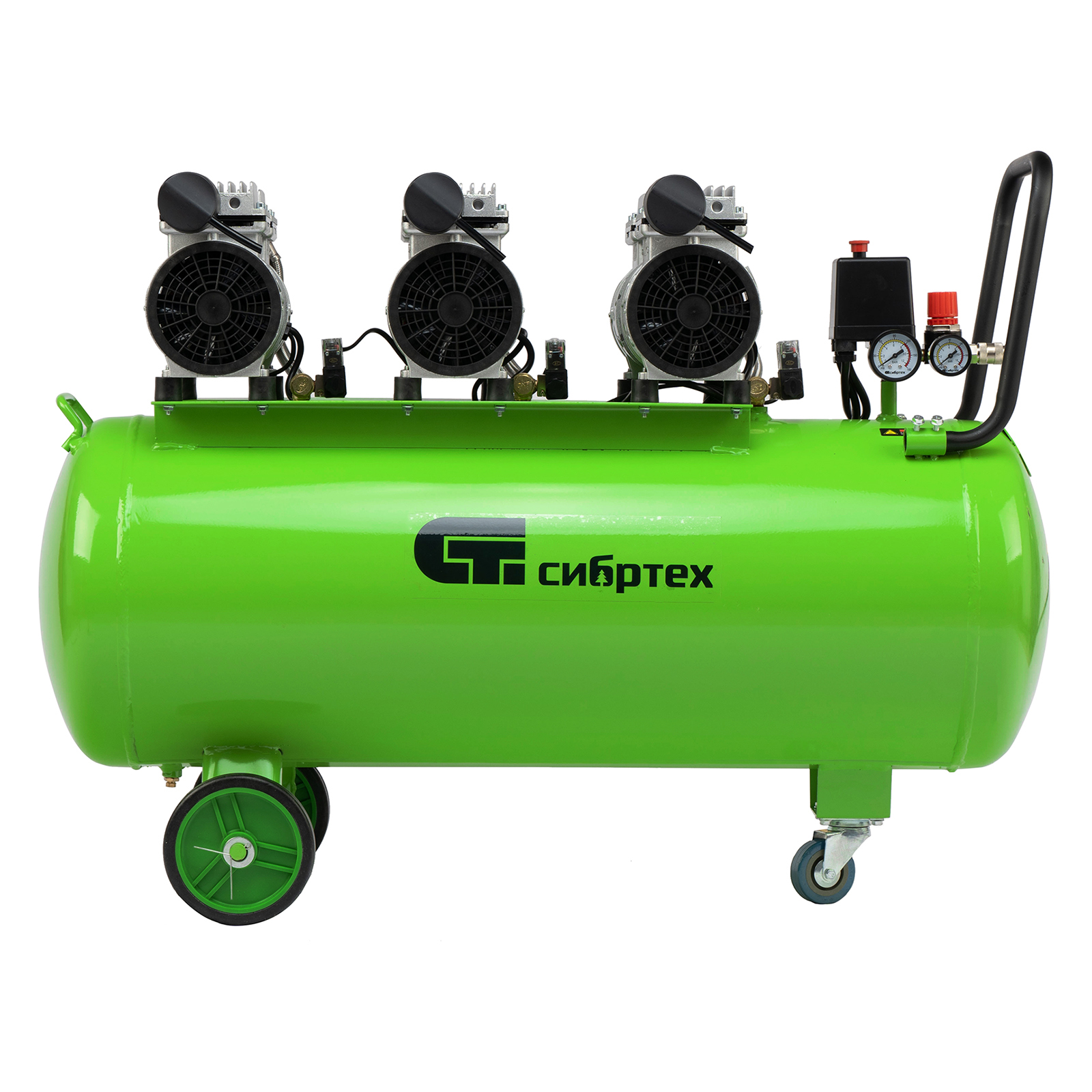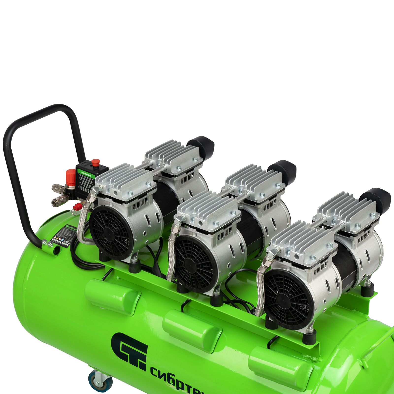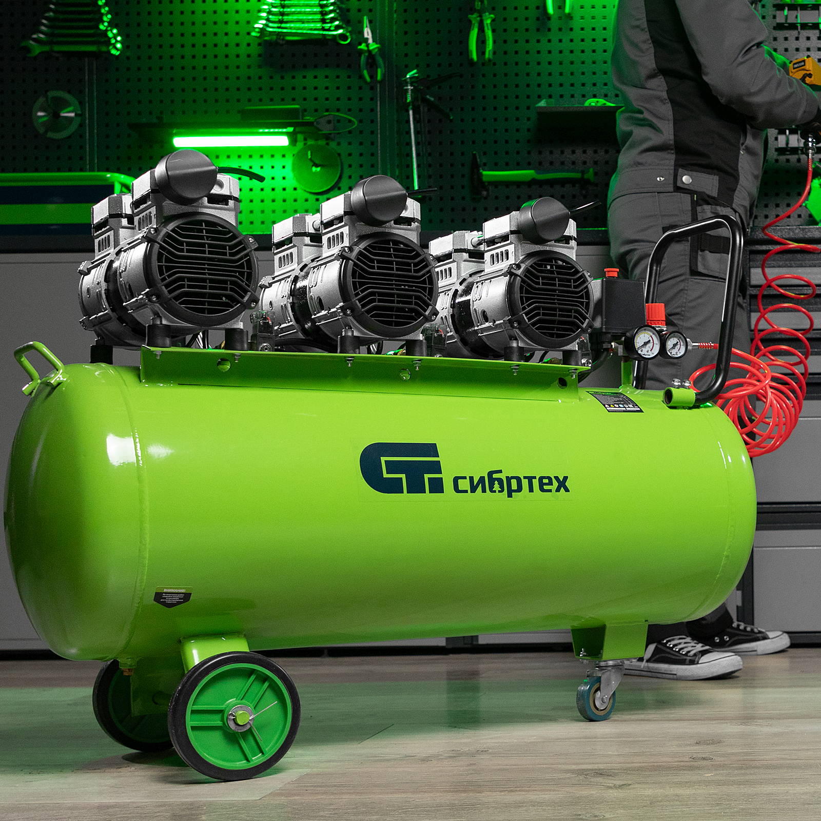 Безмасляный малошумный компрессор Сибртех МБ 2250/100 58008 мощностью 2250 Вт и объемом ресивера 100 л имеет производительность на входе 400 л/мин и сжимает воздух под давлением до 8 бар. Используется для обеспечения функционирования пневмоинструмента, например, краскораспылителя, перфоратора или пневматического шуруповерта. Для работы устройства не требуется масло, поэтому воздух на выходе не содержит его частиц. Компрессор оптимален для проведения покрасочных работ и продувки электронных компонентов.Одна из ключевых особенностей компрессора — низкий уровень шума (не превышает 70 дБ), позволяющий использовать устройство в жилом помещении без дискомфорта для людей.ПреимуществаТермозащита — при превышении допустимой температуры двигатель останавливается, что предотвращает его поломку.Простое подключение — выходной быстросъемный коннектор позволяет подсоединить пневмоинструмент одним движением.Контроль рабочих параметров — компрессор оборудован механическим манометром для отслеживания давления.Безопасная работа — предохранительный клапан защищает от превышения максимально допустимого давления.Автономная работа — реле давления останавливает двигатель по достижении максимального рабочего давления и запускает его, если давление опускается до минимального.Легкий разворот и комфортная транспортировка — производителем предусмотрена ручка, а также 2 больших колеса и 1 поворотное.