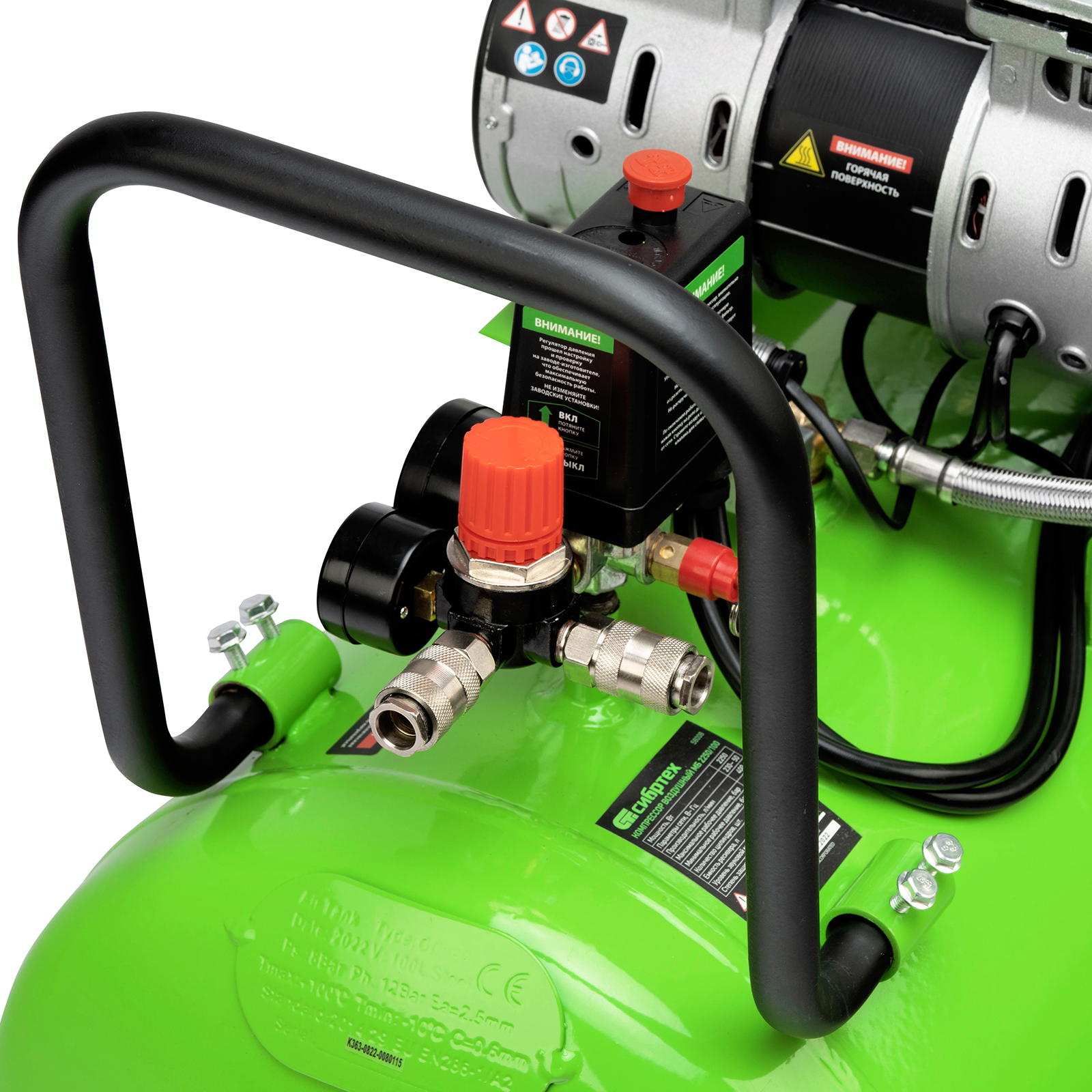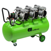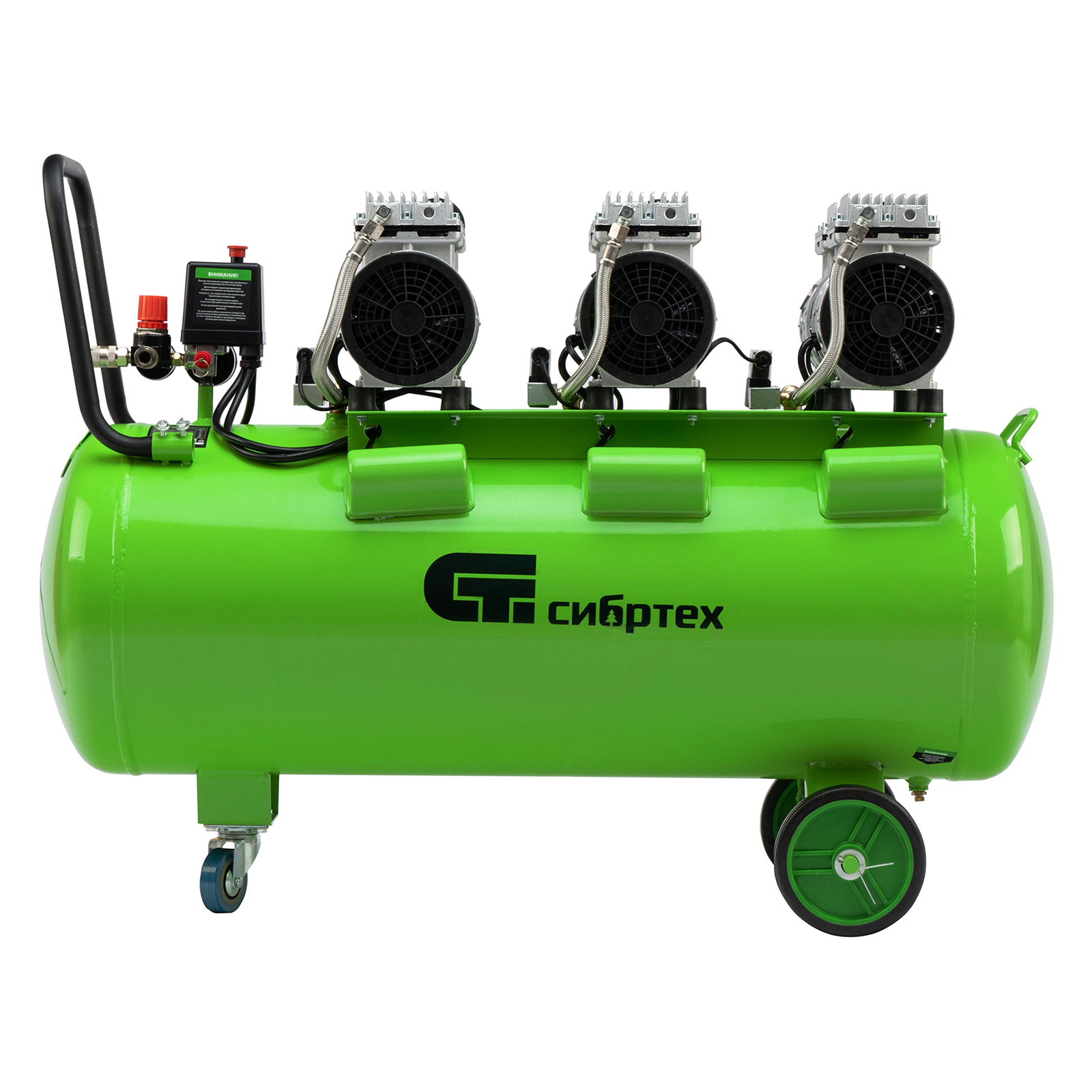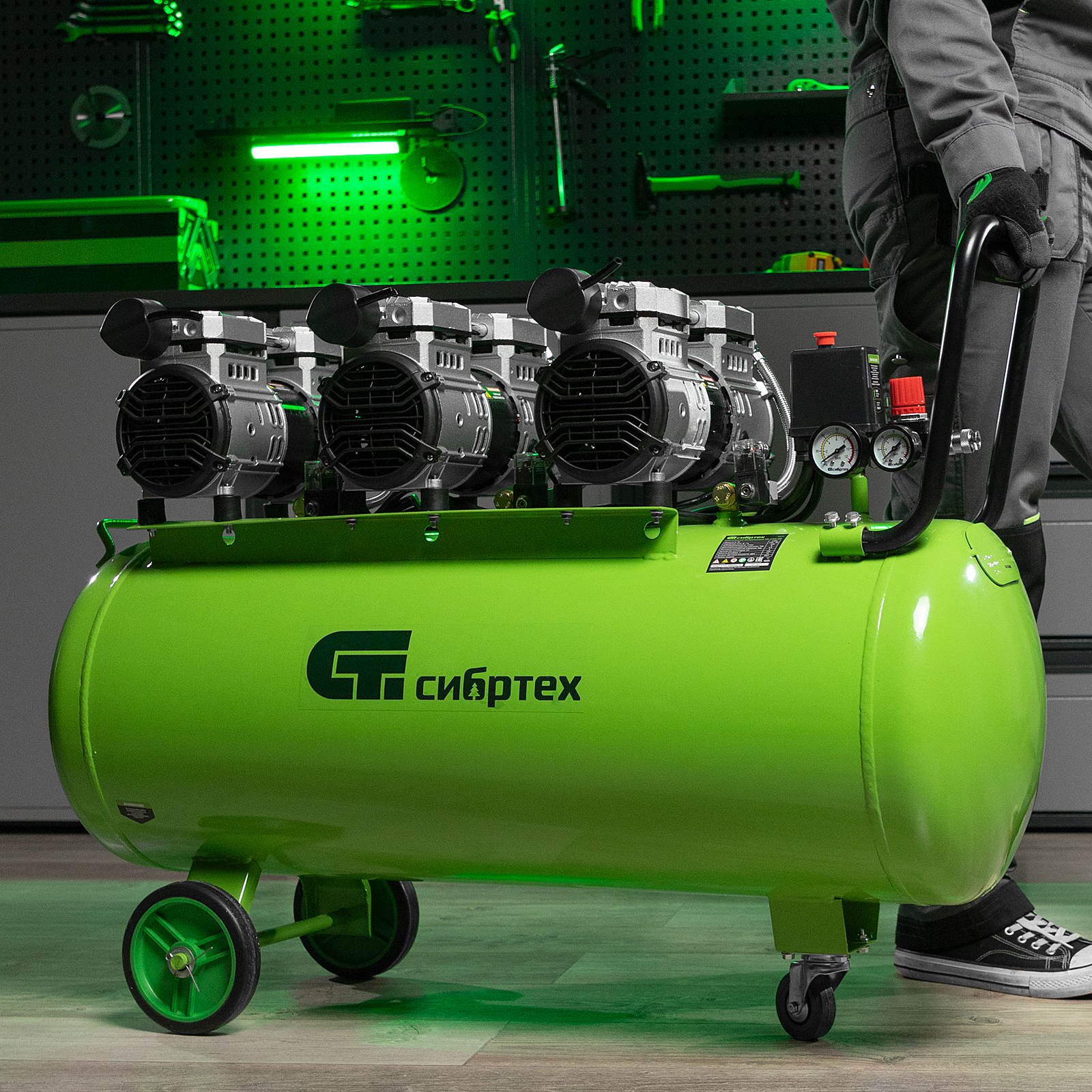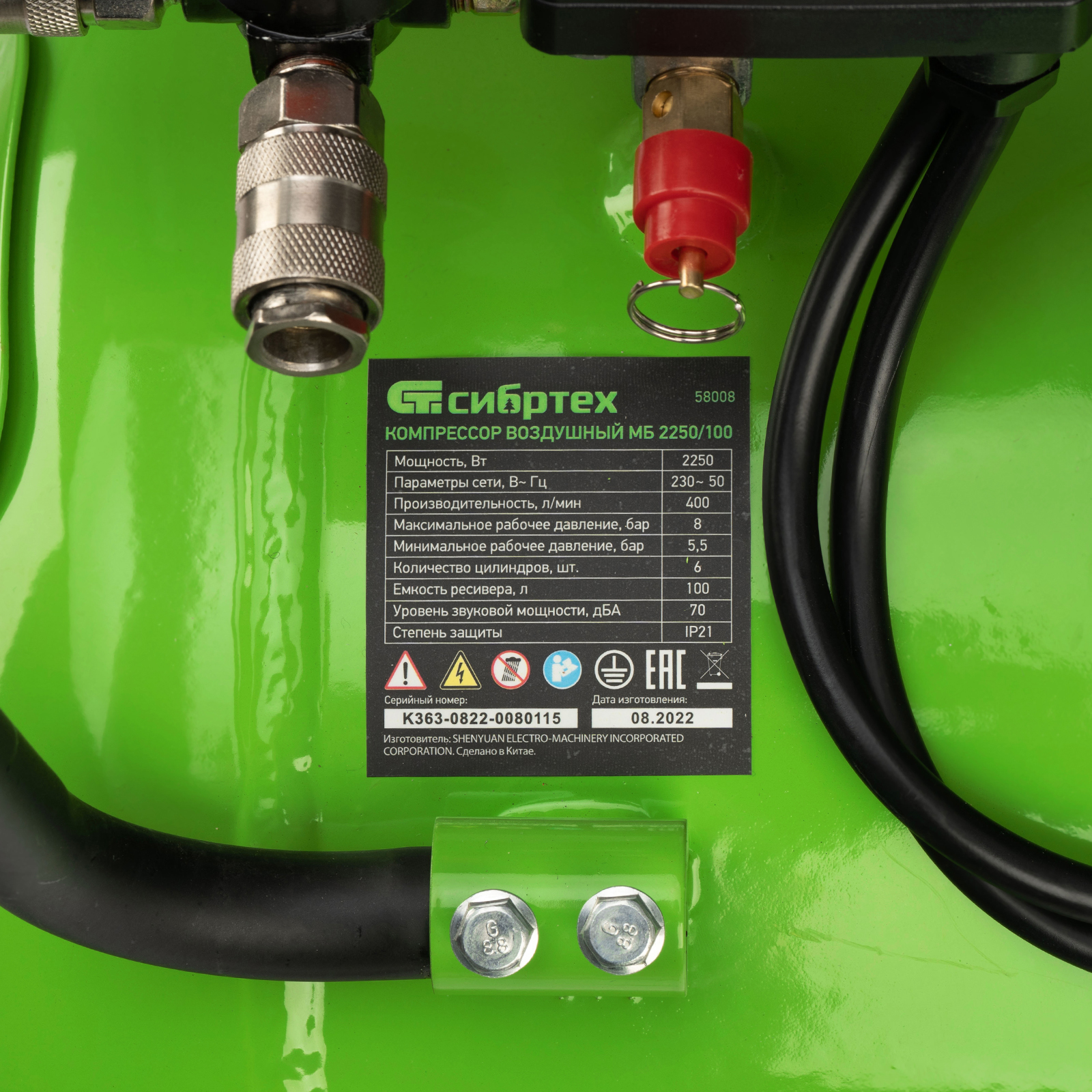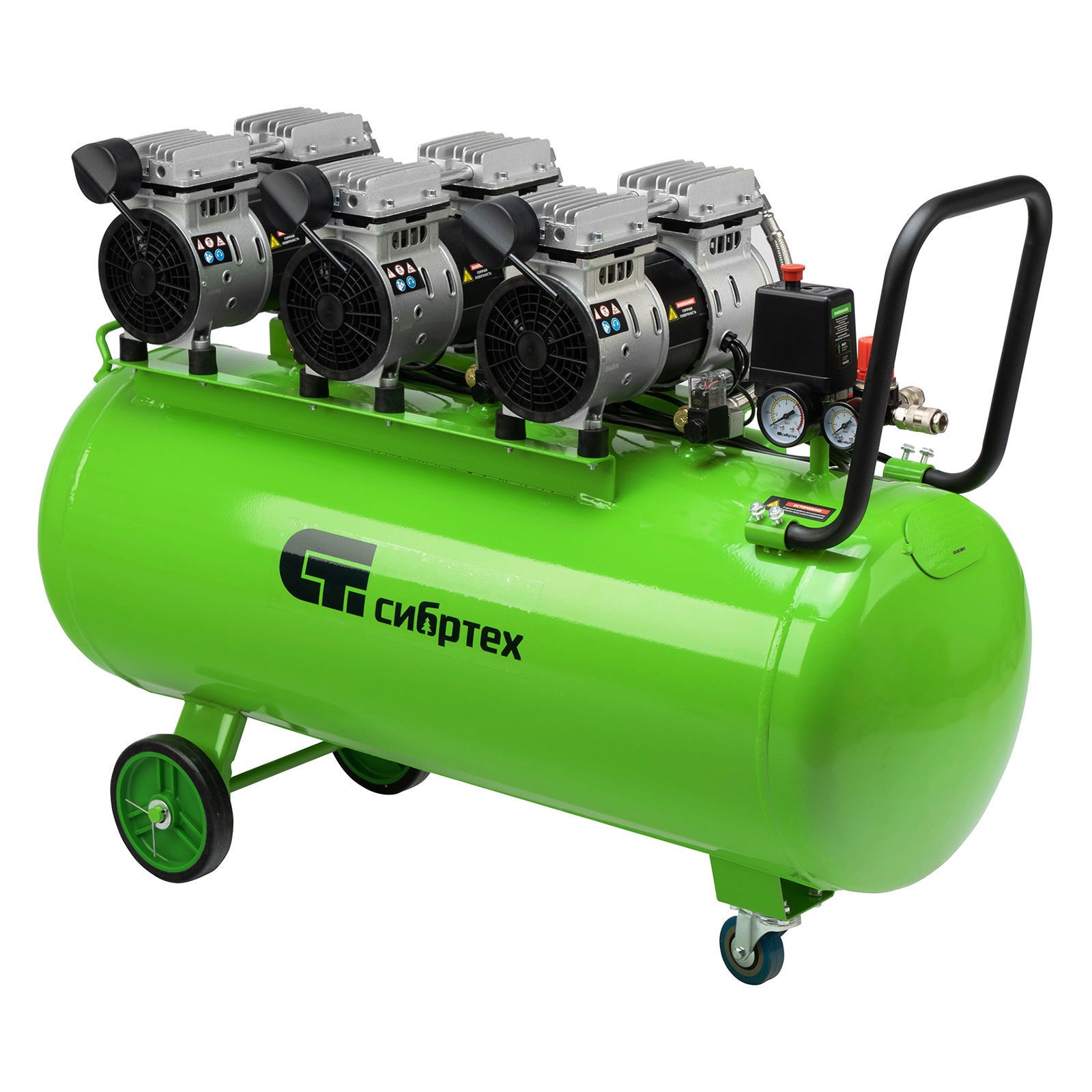 Безмасляный малошумный компрессор Сибртех МБ 2250/100 58008 мощностью 2250 Вт и объемом ресивера 100 л имеет производительность на входе 400 л/мин и сжимает воздух под давлением до 8 бар. Используется для обеспечения функционирования пневмоинструмента, например, краскораспылителя, перфоратора или пневматического шуруповерта. Для работы устройства не требуется масло, поэтому воздух на выходе не содержит его частиц. Компрессор оптимален для проведения покрасочных работ и продувки электронных компонентов.Одна из ключевых особенностей компрессора — низкий уровень шума (не превышает 70 дБ), позволяющий использовать устройство в жилом помещении без дискомфорта для людей.ПреимуществаТермозащита — при превышении допустимой температуры двигатель останавливается, что предотвращает его поломку.Простое подключение — выходной быстросъемный коннектор позволяет подсоединить пневмоинструмент одним движением.Контроль рабочих параметров — компрессор оборудован механическим манометром для отслеживания давления.Безопасная работа — предохранительный клапан защищает от превышения максимально допустимого давления.Автономная работа — реле давления останавливает двигатель по достижении максимального рабочего давления и запускает его, если давление опускается до минимального.Легкий разворот и комфортная транспортировка — производителем предусмотрена ручка, а также 2 больших колеса и 1 поворотное.
