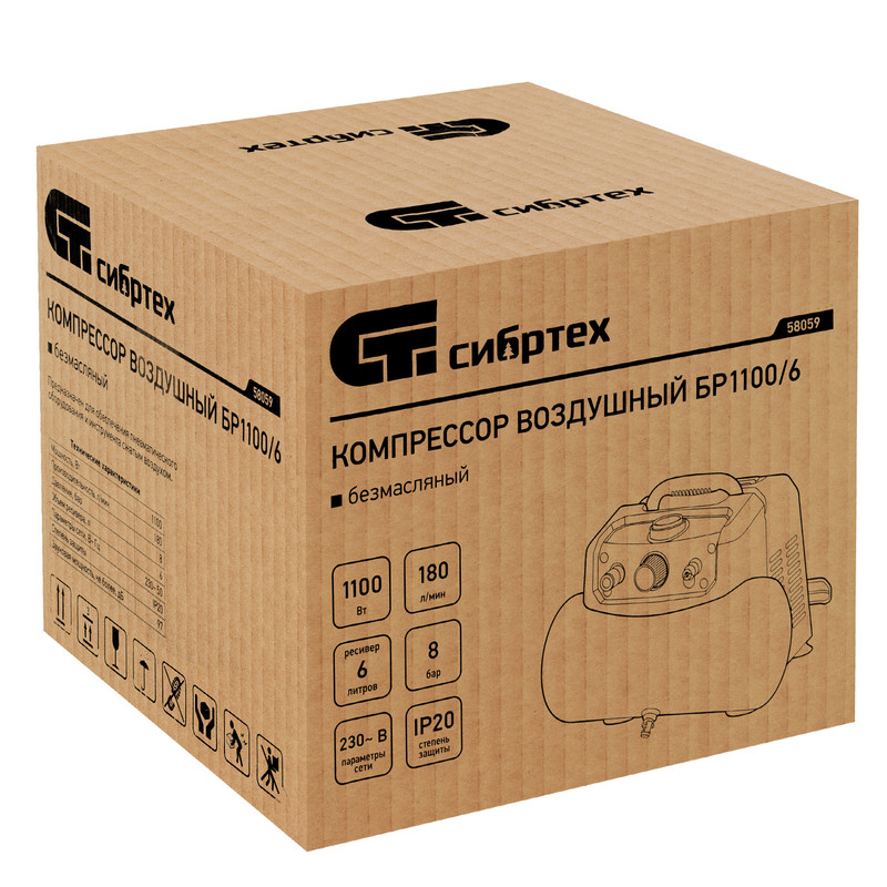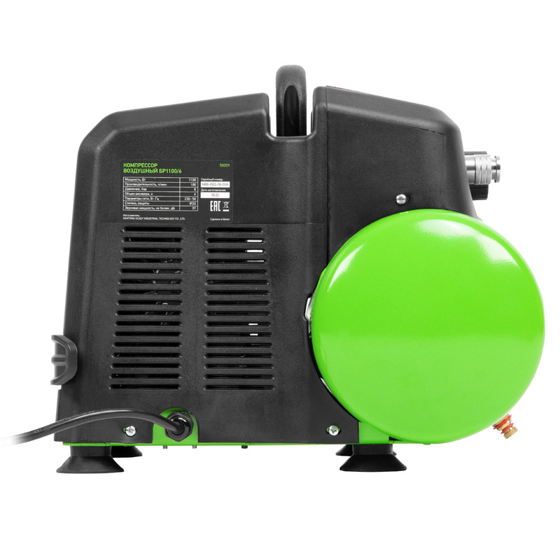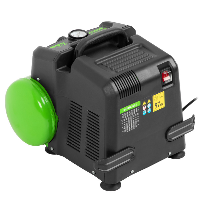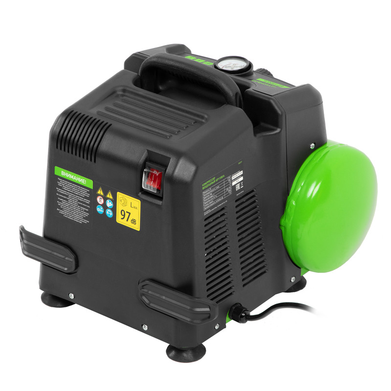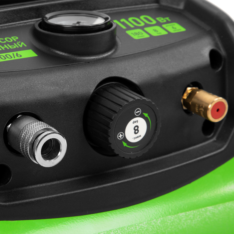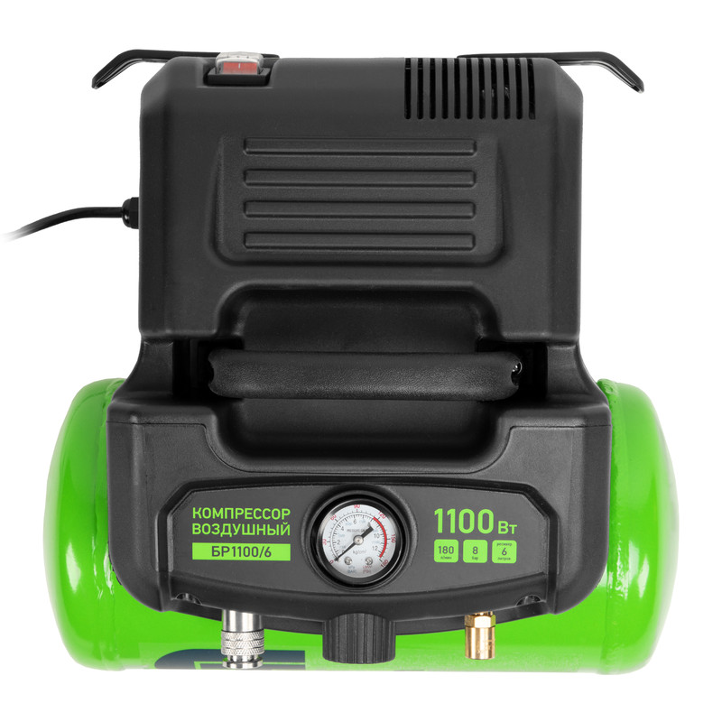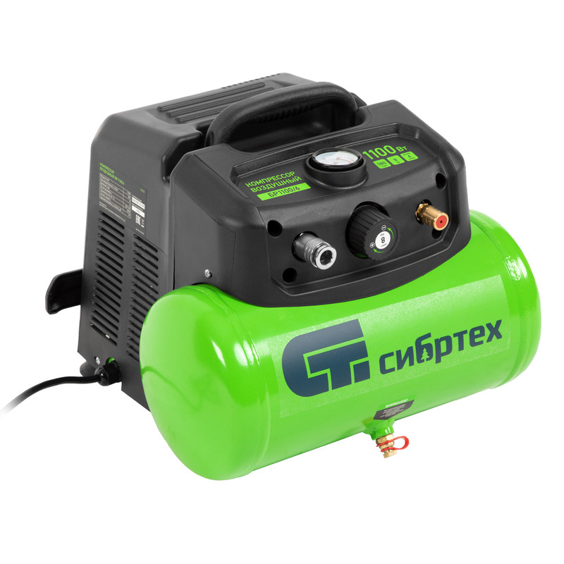 Воздушный безмасляный компрессор Сибртех BL 1100/6 58059 мощностью 1100 Вт, с ресивером емкостью 6 литров, служит для подачи сжатого воздуха под давлением до 8 бар со скоростью 180 л/мин. К нему можно подключить краскораспылитель, продувочный пистолет, заклепочник, пистолет для накачки шин и другой пневмоинструмент. Отсутствие масла делает компрессор оптимальным для выполнения покрасочных работ и продувки электронных компонентов. Устройство предназначено для бытового использования.Одна из основных особенностей данной модели — компактность и удобство в перевозке. Компрессор отличается небольшим весом и дополнен эргономичной транспортировочной ручкой.ПреимуществаАвтономность — прессостат обеспечивает автоматический запуск двигателя и его остановку в зависимости от уровня давления в ресивере.Простая подготовка к работе — быстроразъемный выходной коннектор «Рапид» (евро) позволяет легко подключить пневмоинструмент.Удобное управление — при помощи поворотного регулятора на передней панели можно установить нужное значение давления.Контроль давления в ресивере — в верхней части корпуса расположен манометр, для считывания показателей не нужно наклоняться.Предохранительный клапан — возможность сброса избыточного давления позволяет избежать аварийных ситуаций.Продуманная конструкция — виброгасящие опоры обеспечивают устойчивость компрессора во время работы.