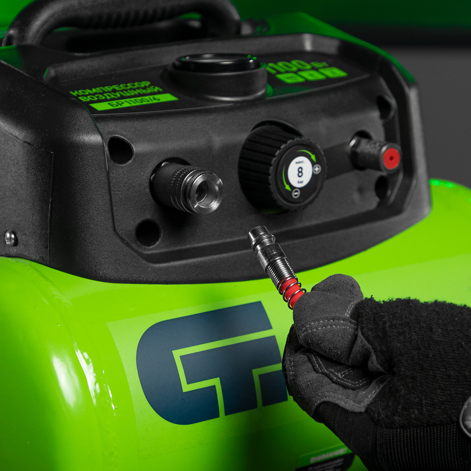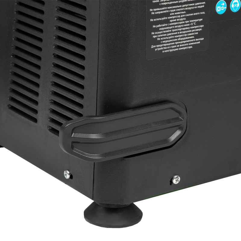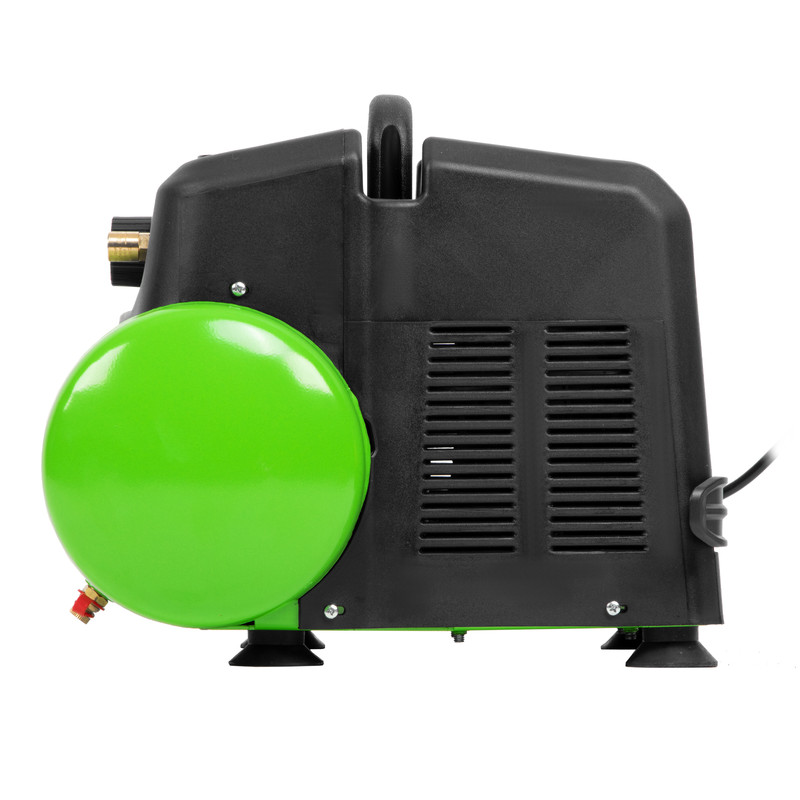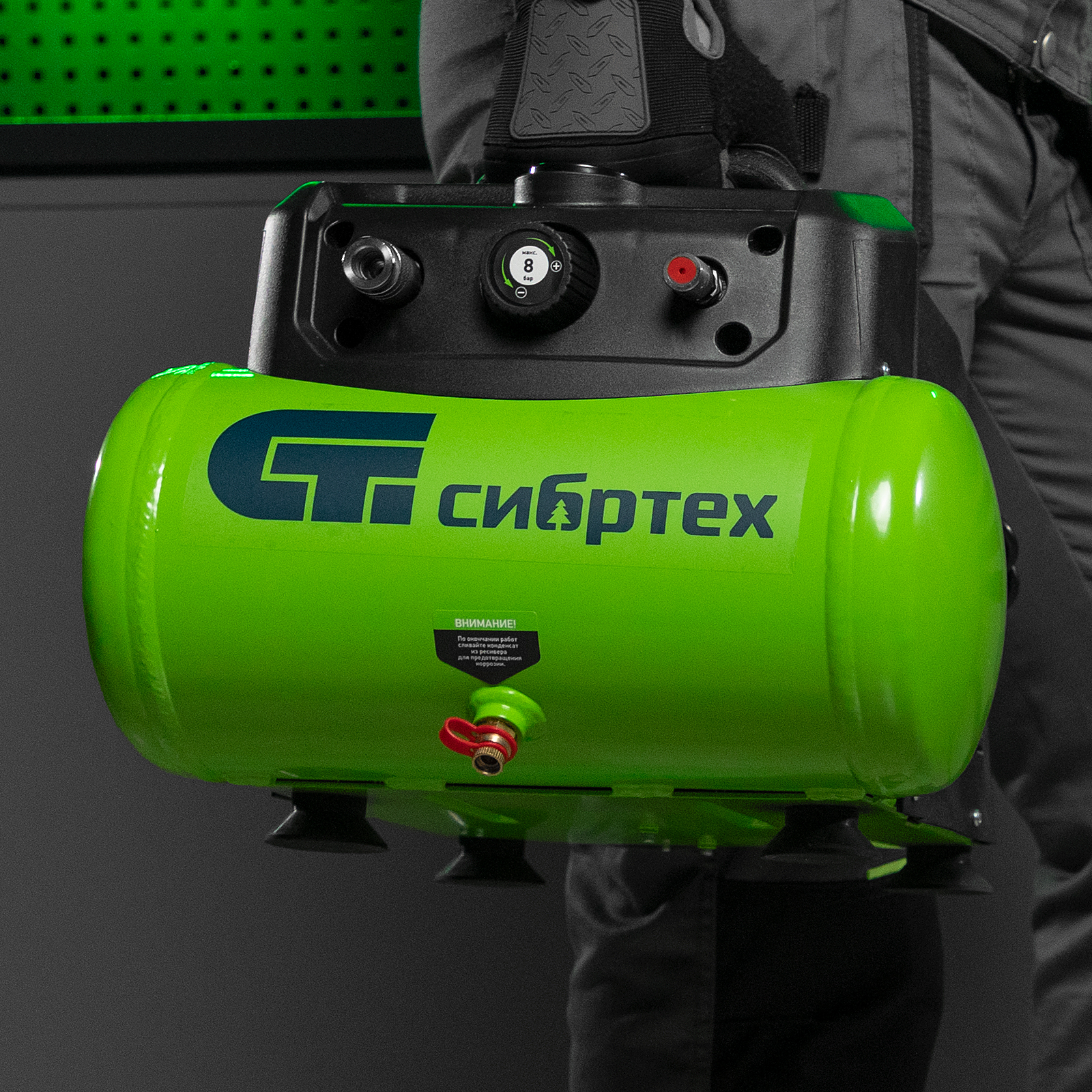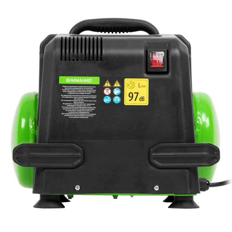Воздушный безмасляный компрессор Сибртех BL 1100/6 58059 мощностью 1100 Вт, с ресивером емкостью 6 литров, служит для подачи сжатого воздуха под давлением до 8 бар со скоростью 180 л/мин. К нему можно подключить краскораспылитель, продувочный пистолет, заклепочник, пистолет для накачки шин и другой пневмоинструмент. Отсутствие масла делает компрессор оптимальным для выполнения покрасочных работ и продувки электронных компонентов. Устройство предназначено для бытового использования.Одна из основных особенностей данной модели — компактность и удобство в перевозке. Компрессор отличается небольшим весом и дополнен эргономичной транспортировочной ручкой.ПреимуществаАвтономность — прессостат обеспечивает автоматический запуск двигателя и его остановку в зависимости от уровня давления в ресивере.Простая подготовка к работе — быстроразъемный выходной коннектор «Рапид» (евро) позволяет легко подключить пневмоинструмент.Удобное управление — при помощи поворотного регулятора на передней панели можно установить нужное значение давления.Контроль давления в ресивере — в верхней части корпуса расположен манометр, для считывания показателей не нужно наклоняться.Предохранительный клапан — возможность сброса избыточного давления позволяет избежать аварийных ситуаций.Продуманная конструкция — виброгасящие опоры обеспечивают устойчивость компрессора во время работы.