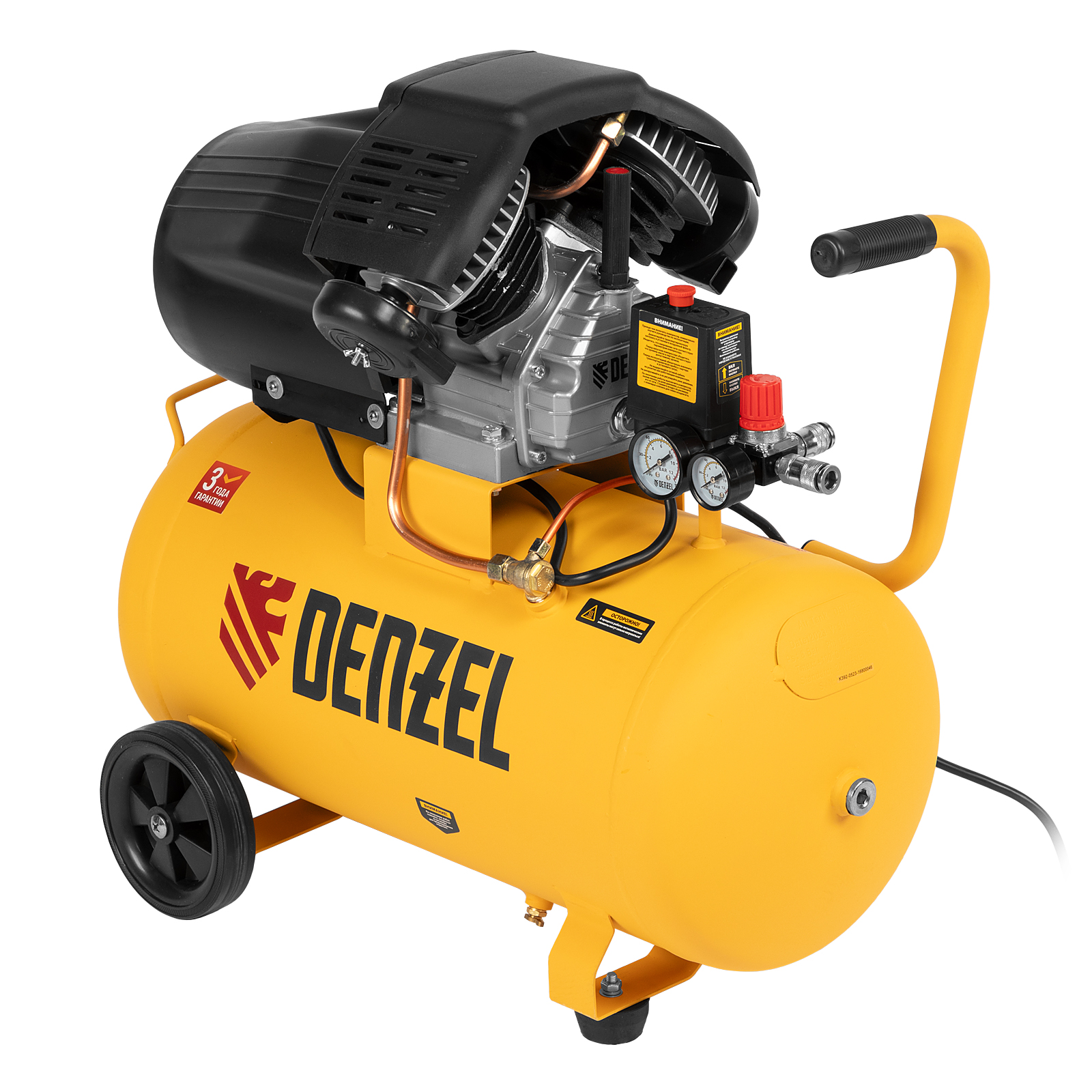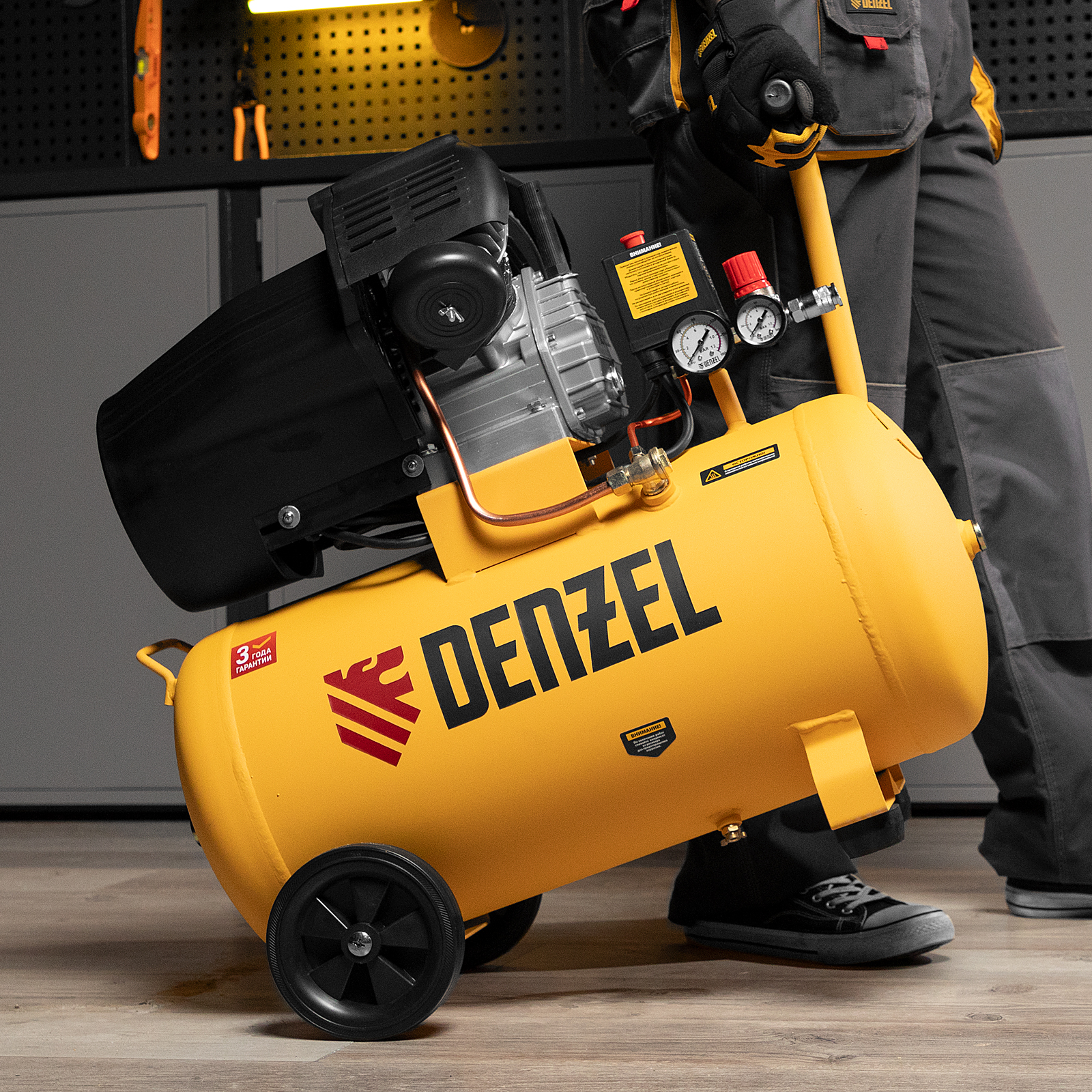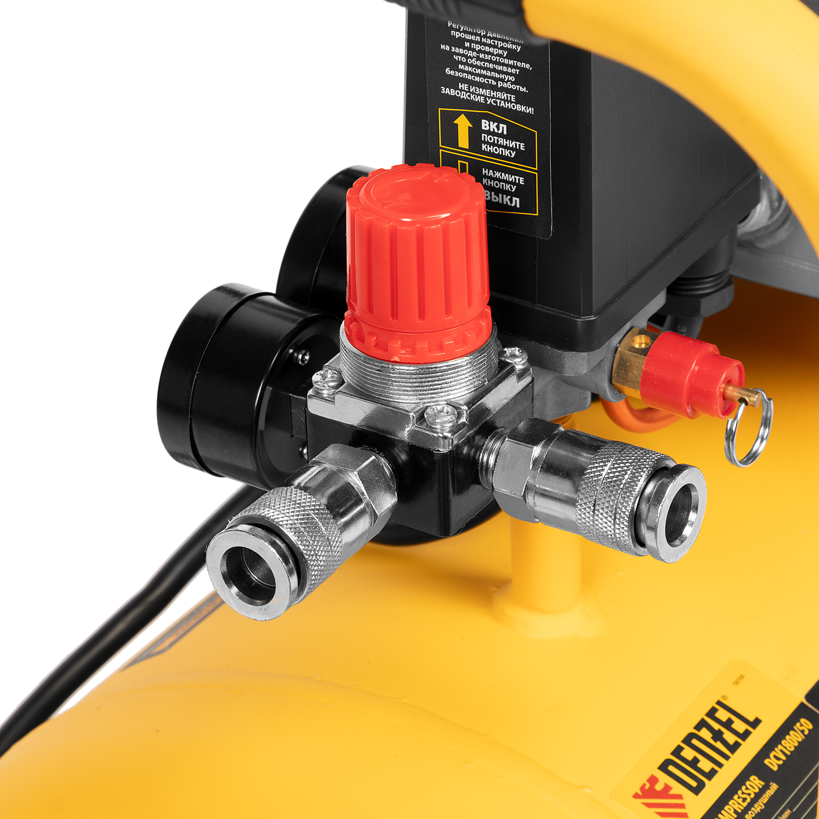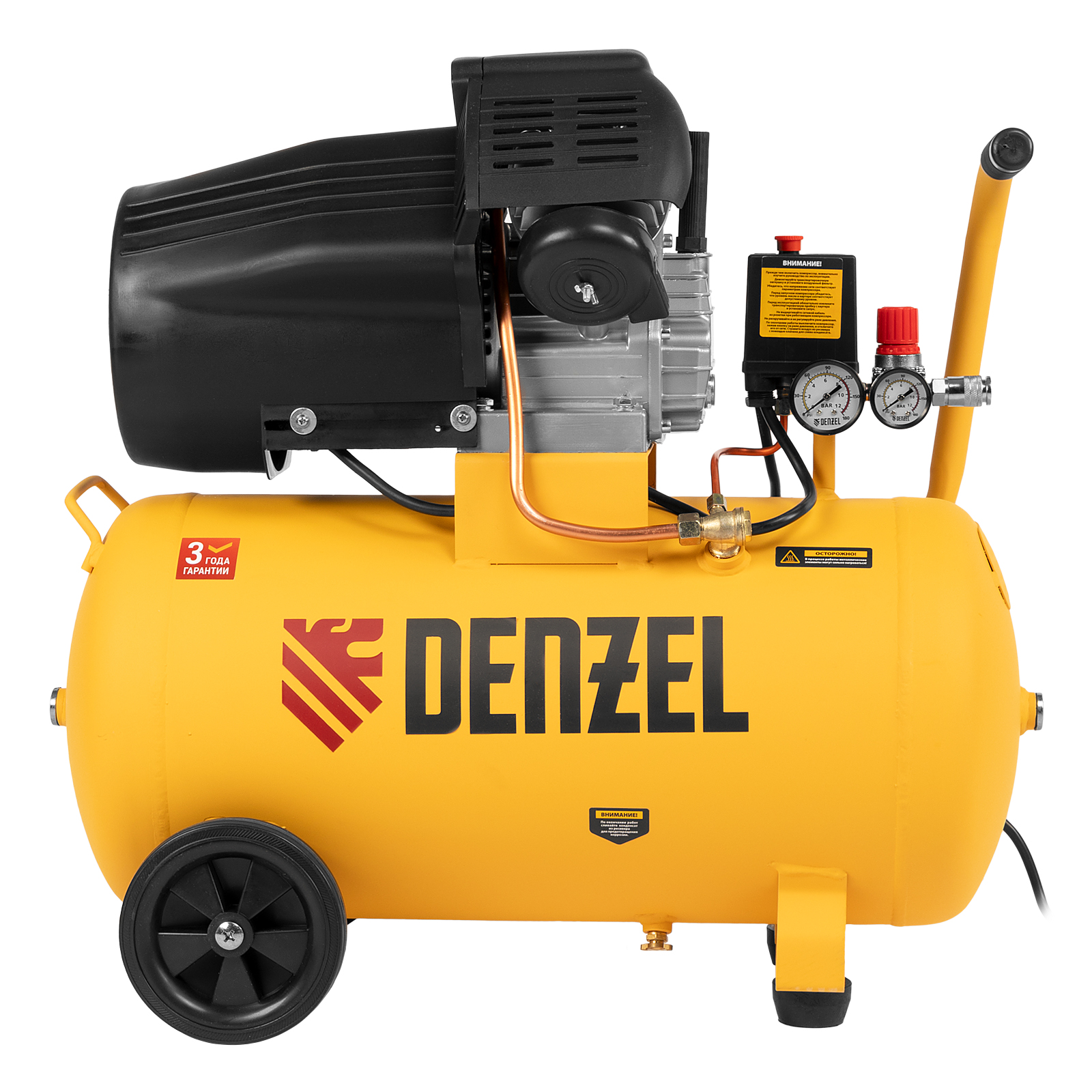 Воздушный компрессор с прямым приводом Denzel DCV1800/50 58168 мощностью 1,8 кВт и производительностью на входе 320 л/мин, с объемом ресивера 50 л, подходит для обеспечения длительной работы пневмогайковерта, пневмозубила, пневмодрели, пневмомолотка или другого пневмоинструмента. Быстроразъемные коннекторы Рапид (Евро) облегчают подключение пневмомагистралей. Эффективная система смазки снижает износ деталей и уменьшает нагрузку на двигатель, что позволяет использовать компрессор в профессиональной сфере. Преимущества Надежность и долговечность — коленвал и цилиндры изготовлены из чугуна, ресивер сварен из стальных листов толщиной 2,5 мм. Безопасная эксплуатация — при перегреве и перегрузке автоматически срабатывает аварийное отключение. Защита от превышения допустимого давления — производитель предусмотрел предохранительный клапан. Автономность — прессостат останавливает двигатель по достижении максимального рабочего давления и запускает его, если давление опускается до минимального. Высокое качество изготовления — детали картера в местах стыка прошли механическую обработку с дополнительной шлифовкой, поэтому риск протечки масла минимален. Улучшенный теплоотвод — оребренные трубки воздуховода обеспечивают эффективное охлаждение поступающего в ресивер воздуха. Тщательная фильтрация воздушного потока — уплотнители на фильтрах исключают попадание пыли в цилиндры. Контроль давления и расхода воздуха — компрессор оснащен регулятором и двумя манометрами. Быстрое удаление конденсата — для откручивания сливной пробки с подпальцевыми упорами не требуется специальный инструмент. Комфортная эксплуатация — амортизирующие опоры снижают уровень вибрации. Удобное перемещение по рабочей площадке — конструкцией предусмотрены колеса и рукоятка. Гарантия 3 года — высокое качество компрессора подтверждено производителем.