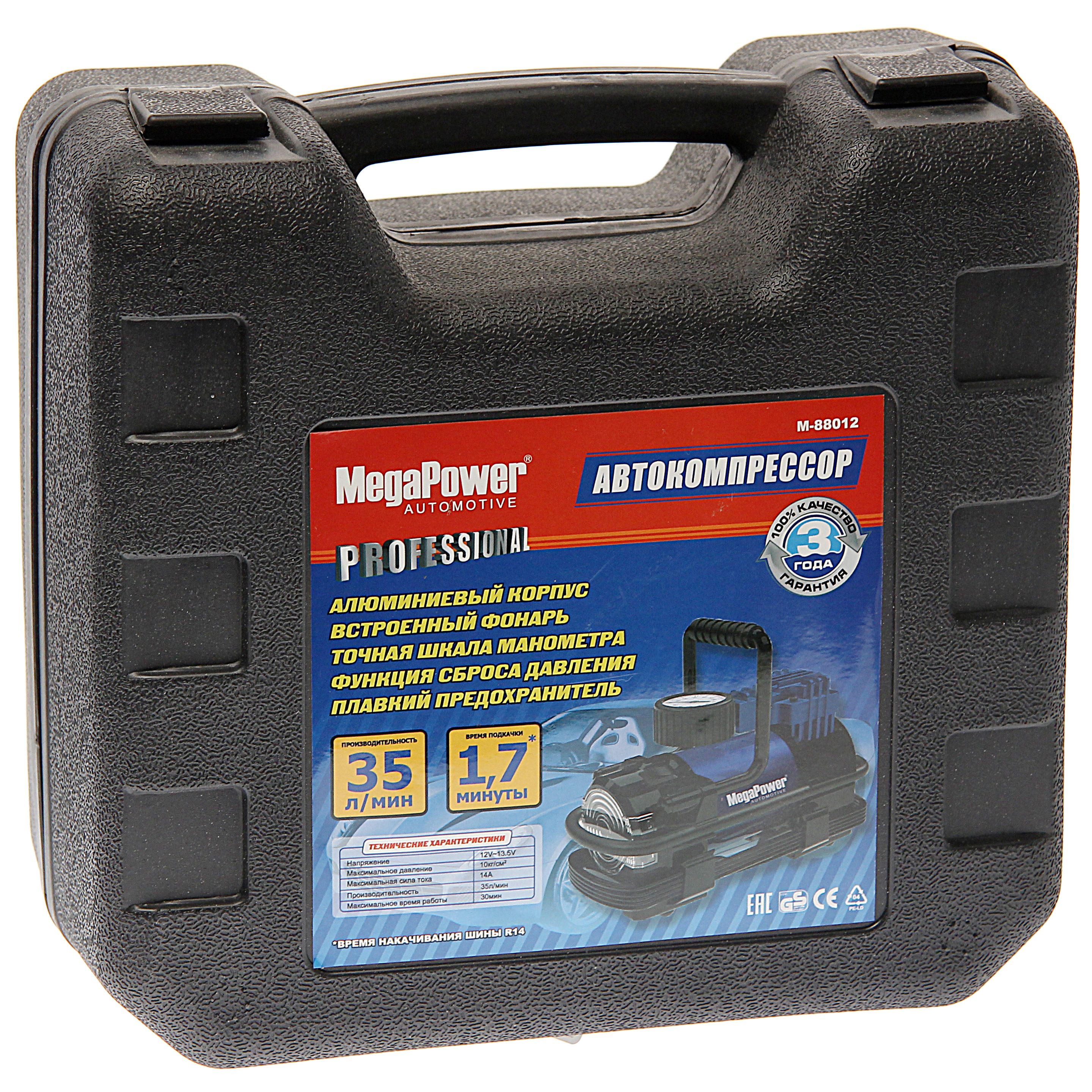 Автомобильный компрессор M-88012 поршневой 150PSI (35л/мин, 14А) с фонарем и дефлятором, в кейсе 12V.