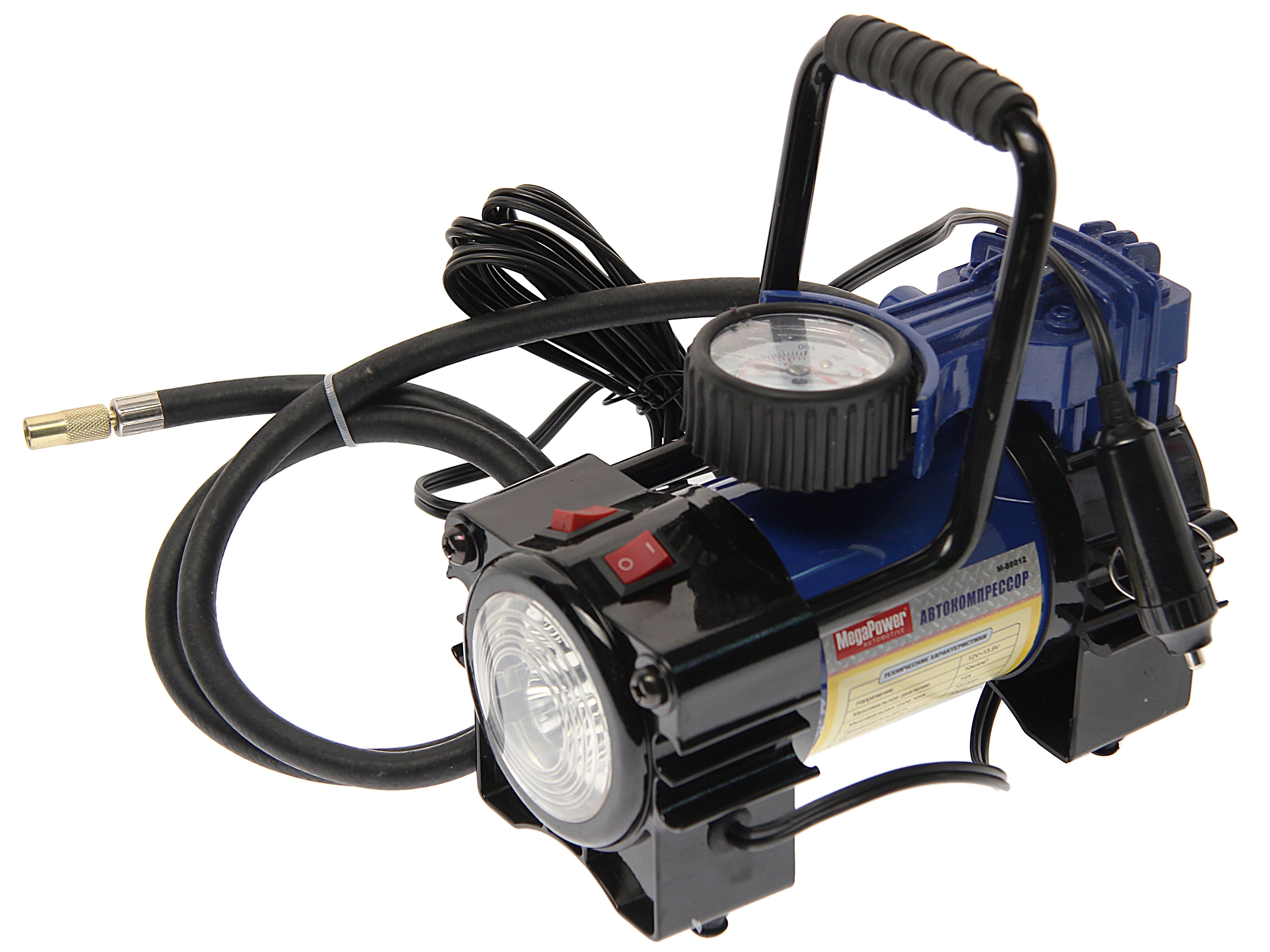 Поршневой компрессор 150PSI 35л/мин, 14А с фонарем и дефлятором, в кейсе 12V M-88012 предназначен для подкачки шин, лодок и детских надувных игрушек.