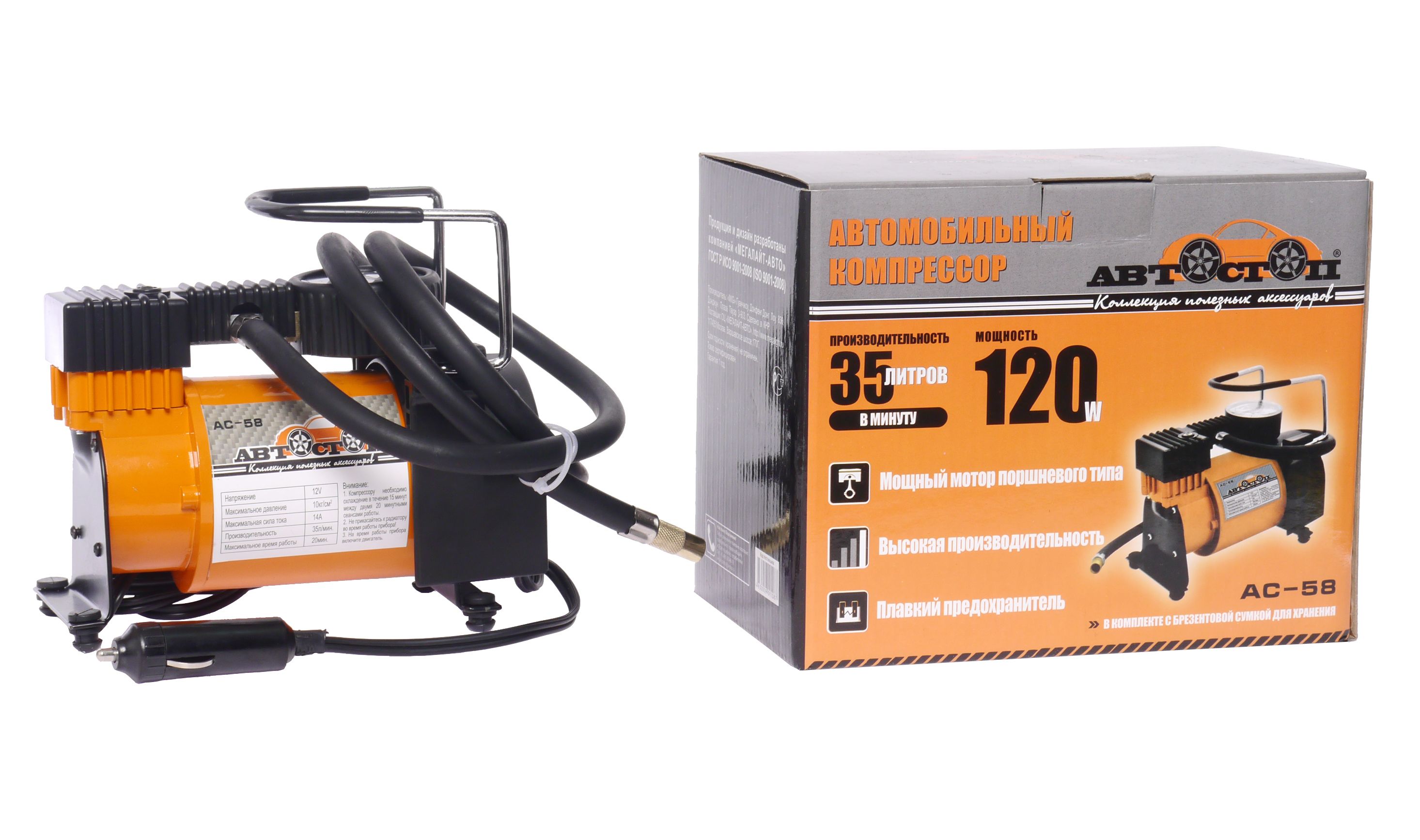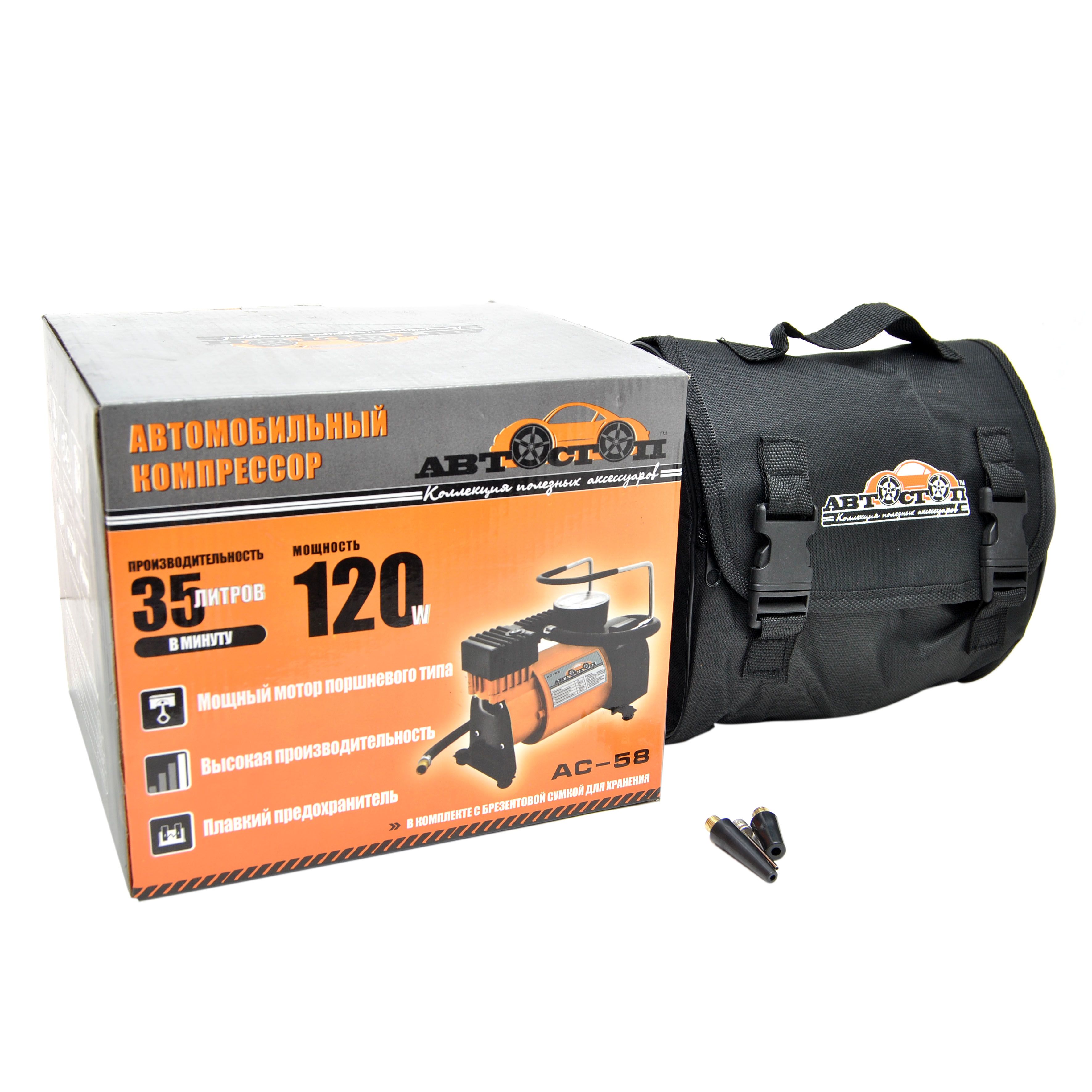 Автомобильный компрессор AC-58 поршневой 120W (35л/мин, 14А) с предохранителем, в сумке 12V АВТОСТОП.