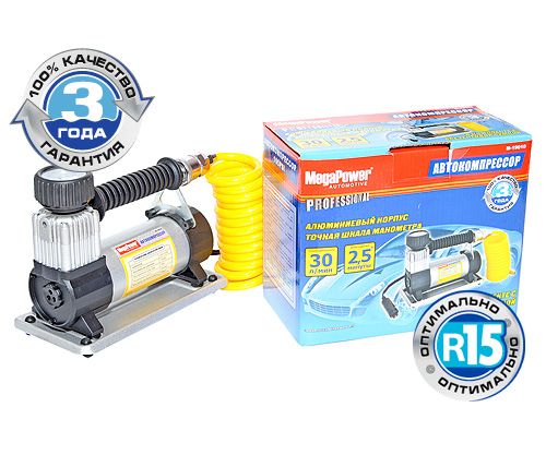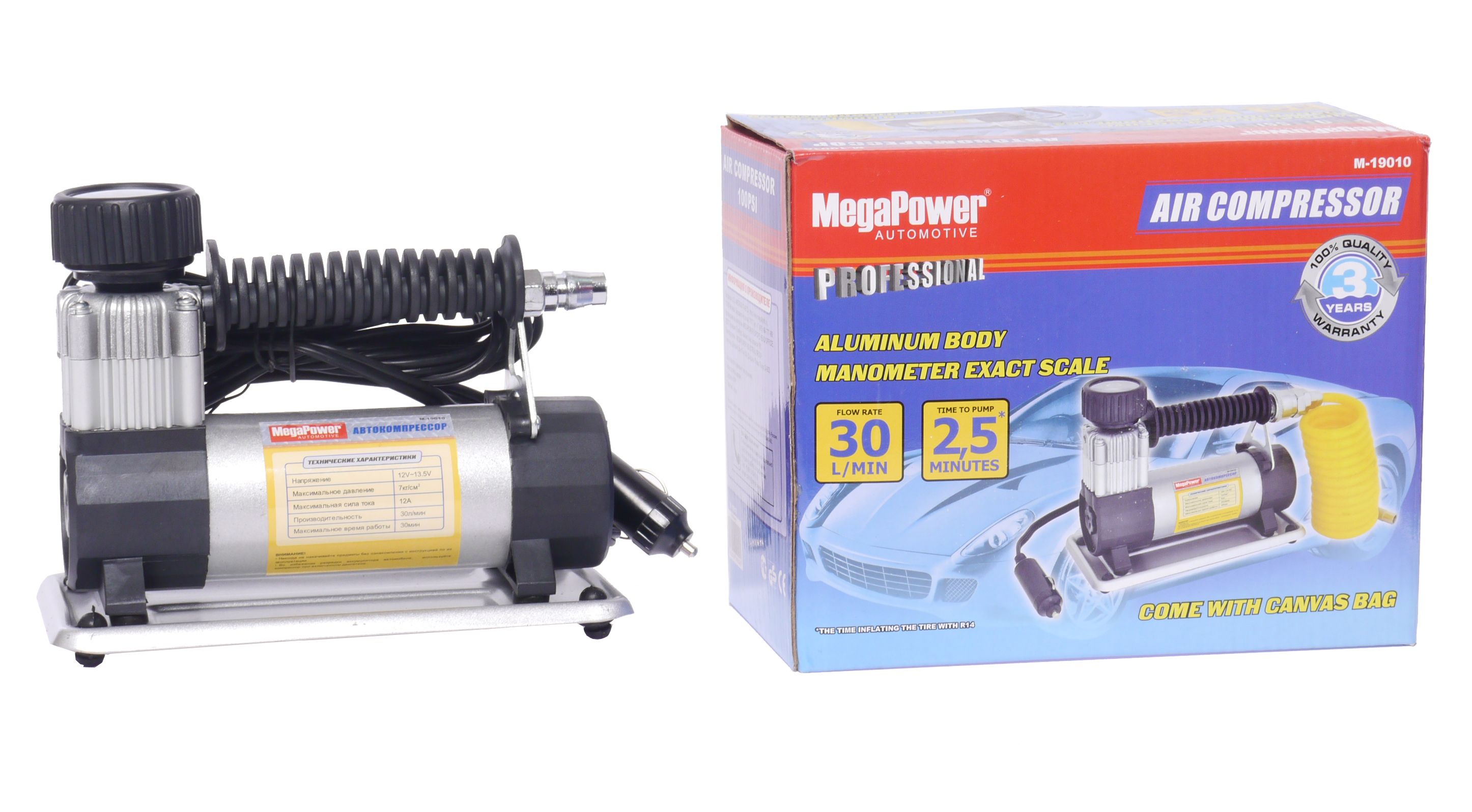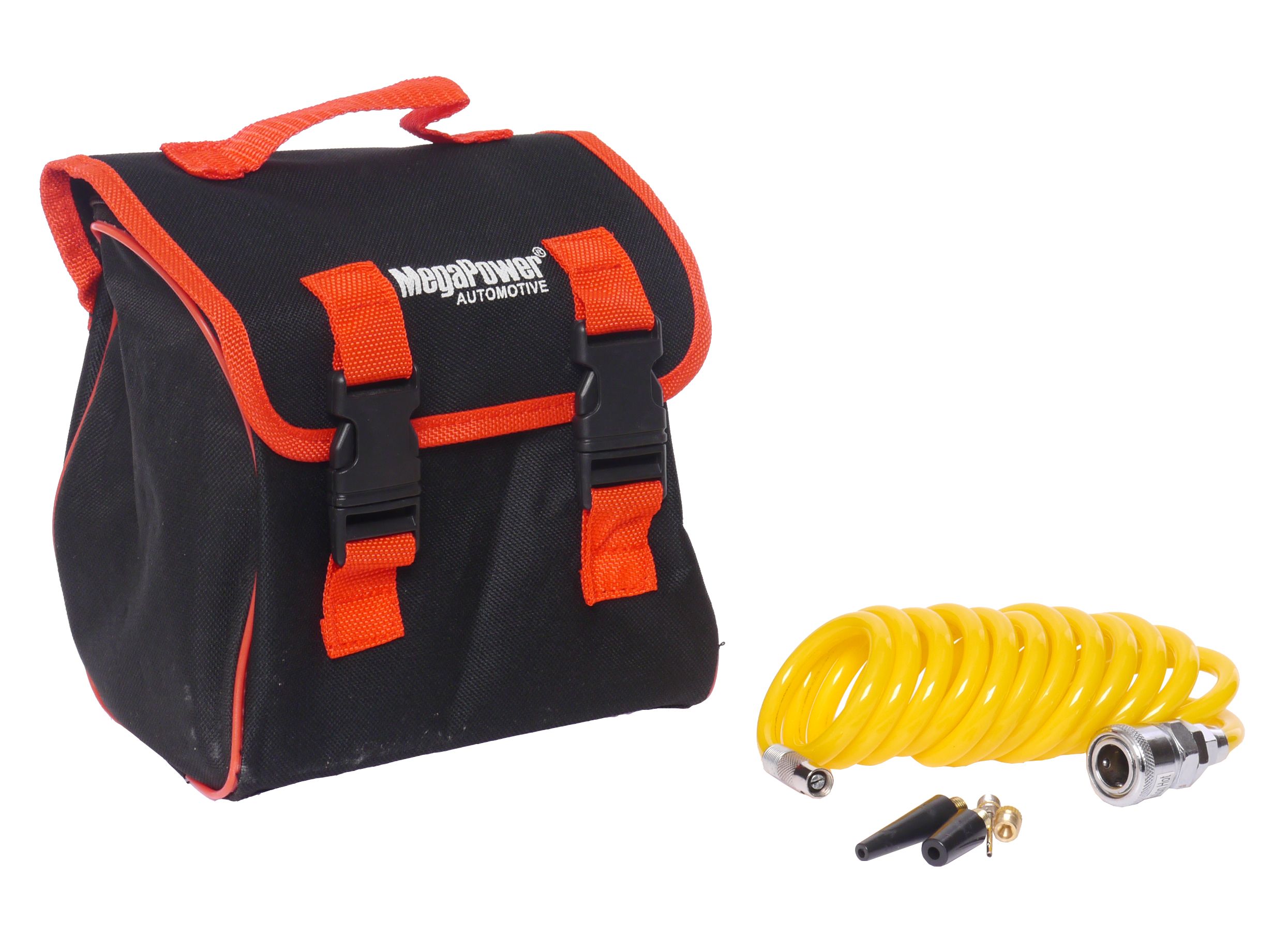 Автомобильный компрессор M-19010 поршневой 100PSI (30л/мин, 12А) удлиненный шланг, в сумке 12V MEGAPOWER предназначен для подкачки шин, лодок и детских надувных игрушек.