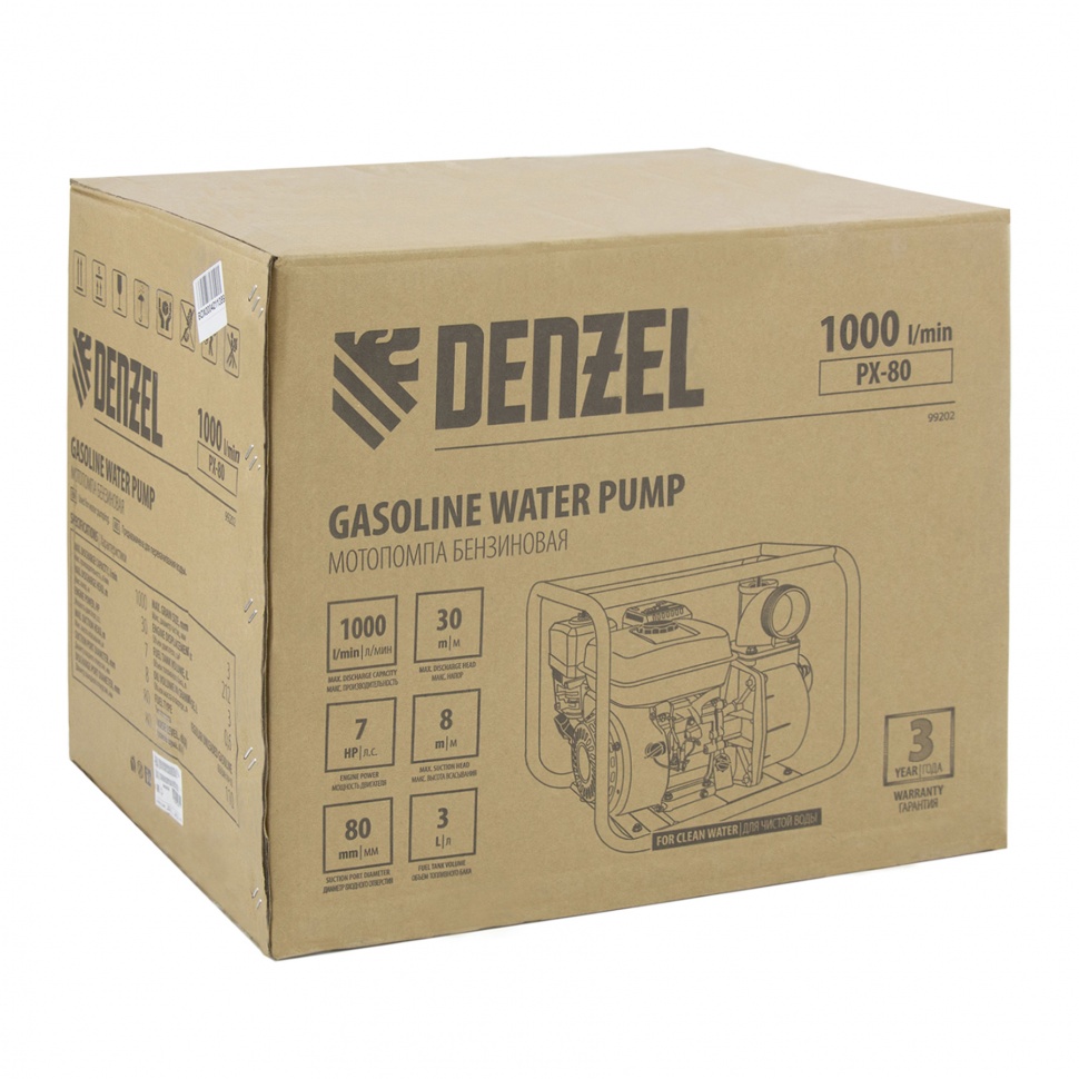 Бензиновая мотопомпа Denzel PX-80 99202 производительностью 1000 л/мин, с двигателем мощностью 7 л. с. и штуцерами диаметром 3 дюйма, осуществляет забор воды с глубины до 8 м, обеспечивает напор до 30 м и используется для подачи чистой воды на дачный участок, стройку, небольшое предприятие или в системы полива. Также легко справляется с осушением водоемов, бассейнов и затопленных помещений. Бензиновая мотопомпа работает автономно, и ее можно использовать для выездных работ.ПреимуществаВысококачественные комплектующие — чугунная гильза цилиндра, свеча зажигания Bosch, стальные коленчатый и распределительный вал обеспечивают долговечность двигателя серии Denzel Long Life series.Безопасная работа — при низком уровне масла встроенная защита отключает двигатель для предотвращения его поломки.Низкий расход топлива — объема топливного бака 3 л достаточно для работы в течение 1,5 ч без дозаправки.Контроль интенсивности подачи воды — предусмотрена возможность регулировки оборотов двигателя.Ручной стартер — двигатель легко запускается в холодную погоду или после долго простоя.Надежная конструкция — усиленная стальная рама с широким основанием защищает мотопомпу от повреждений и обеспечивает ее устойчивость во время работы.Продуманная комплектация — к мотопомпе прилагаются хомуты и инструменты для установки патрубков.Вес 24 кг — мотопомпу легко перемещать по рабочей площадке.Гарантия 3 года — надежность оборудования подтверждена производителем.