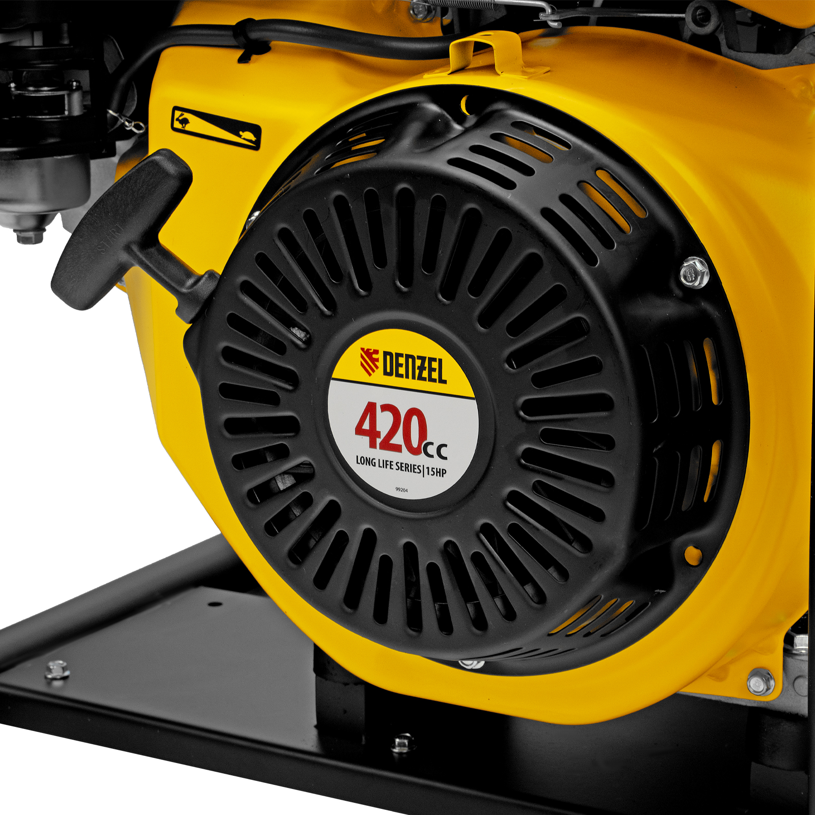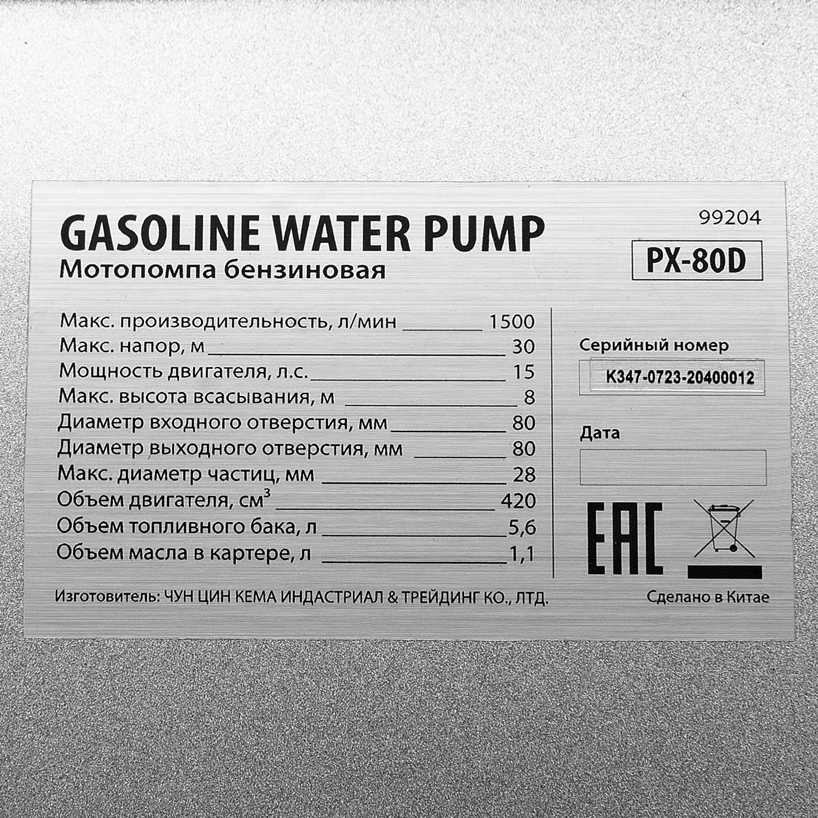 Бензиновая мотопомпа Denzel PX-80D 99204 с двигателем мощностью 15 л. с. и штуцерами диаметром 3 дюйма обеспечивает напор 30 м и применяется для откачки грязной воды со скоростью 1500 л/мин из затопленных помещений, а также котлованов, траншей, погребов, колодцев глубиной до 8 м. Оптимальна для проведения земляных работ, т. к. может работать с грязной водой, содержащей фракции размером до 28 мм. Используется также для подачи чистой воды на стройку, небольшое предприятие, на дачный участок и в систему полива.ПреимуществаНадежность и долговечность — двигатель Denzel Long Life из высококачественных комплектующих обеспечивает длительную стабильную работу мотопомпы.Низкий расход топлива — увеличенный бак объемом 5,6 л позволяет работать до 90 минут без дозаправки.Защита двигателя — при низком уровне масла происходит автоматическое отключение мотопомпы для предотвращения ее поломки.Возможность изменения интенсивности потока воды — конструкцией предусмотрен регулятор оборотов двигателя.Быстрый запуск — двигатель легко заводится в любую погоду благодаря ручному стартеру.Прочность — стальная рама защищает двигатель и насосную часть от механических повреждений.Устойчивость — широкое основание позволяет установить мотопомпу даже на неровной поверхности.Необходимые инструменты в комплекте — к мотопомпе прилагаются хомуты и инструменты для подключения шланга.Подтвержденное качество — гарантия на заводской брак составляет 3 года.