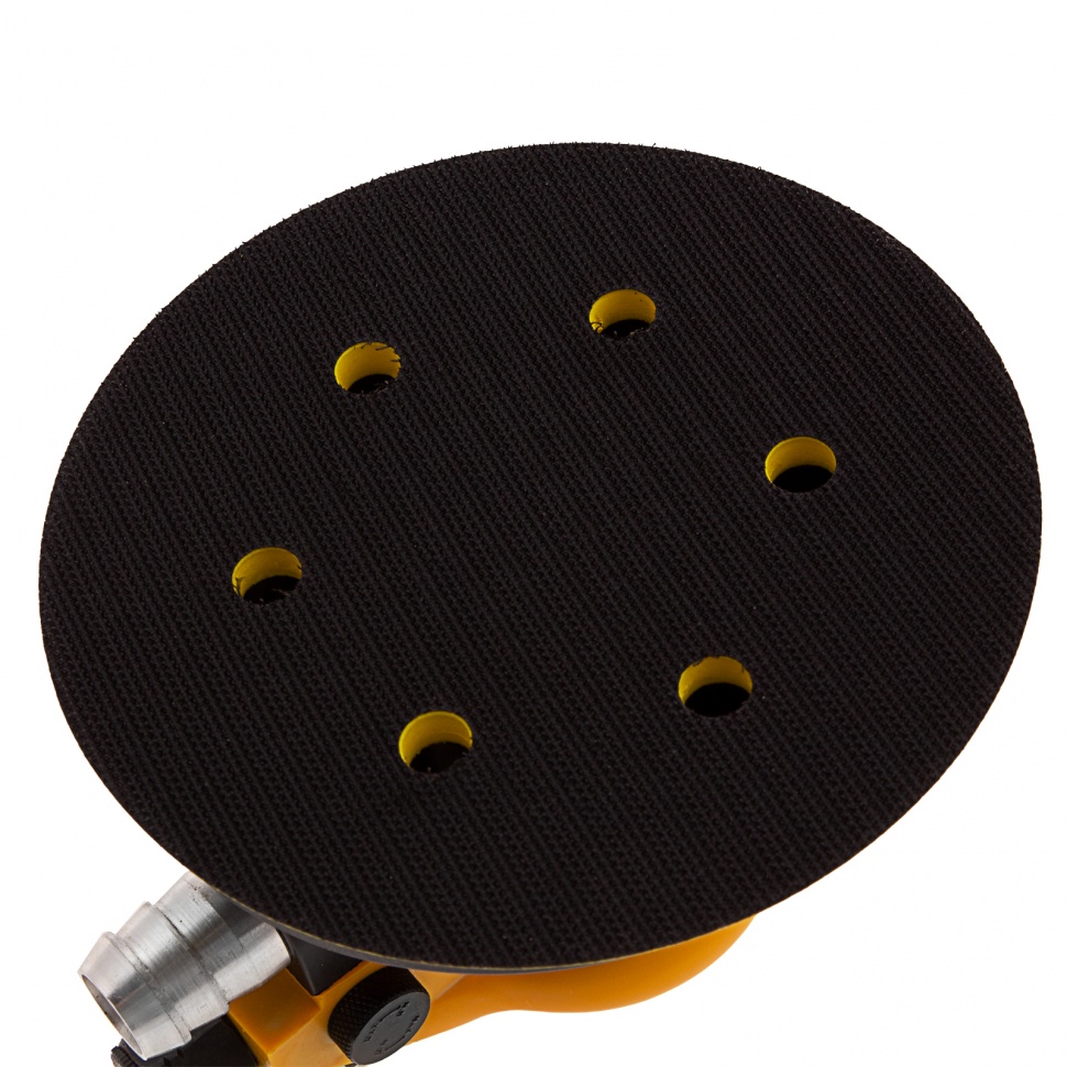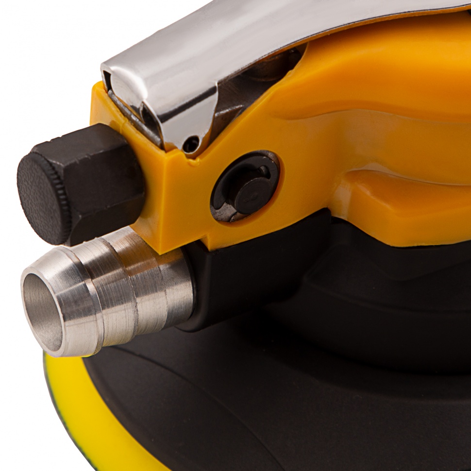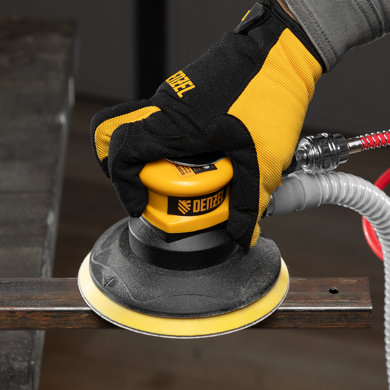 Пневматическая эксцентриковая шлифовальная машина Denzel EPG150 57476 с амплитудой 5 мм развивает скорость вращения 10000 об/мин при среднем расходе воздуха 160 л/мин. Этого достаточно для эффективного шлифования, зачистки и выравнивания любых поверхностей (древесины, металла, пластика и т.д.). С помощью машинки можно без усилий подготовить материал любой твердости к покраске или отделке, выровнять металл перед сваркой. А при использовании более мягкой насадки получится сделать любую поверхность абсолютно гладкой и придать ей дополнительный блеск.Орбитальная шлифмашина предназначена для работы при давлении 6,3 бар, расход воздуха не превышает 200 л/мин. Во время работы не забывайте использовать специальное масло ISO 46, которое можно добавлять как напрямую в инструмент, так и с помощью блока подготовки воздуха Denzel 57469, включающего в себя лубрикатор для автоматической подачи масла.ПреимуществаВысокая производительность — расширенная рабочая поверхность диаметром 150 мм позволяет быстро обрабатывать большие площади материала.Регулируемая скорость вращения — машинку можно использовать как для шлифовки с использованием оснастки различной зернистости, так и для полировки поверхностей, подбирая нужный режим под обрабатываемый материал.Удобное включение — длинную и широкую клавишу «пуск» удобно нажимать при любом хвате инструмента.Работа без усталости — шлифовальная машина очень компактная (116 x 156 x 148,7 мм) и удобно управляется, что позволяет снизить нагрузку на руку.Быстрое переключение между задачами — насадки легко меняются благодаря удобному креплению на липучку.Эффективная система пылеудаления — в комплект поставки входит пылесборный мешок со шлангом для отвода сошлифованного материала, поэтому пользоваться инструментом безопасно в закрытых помещениях.Аккуратный результат — низкий уровень вибраций позволяет избежать возникновения круговых царапин на обрабатываемой поверхности.Полная готовность к работе — в комплект входит штуцер и гаечный ключ, поэтому сразу после покупки можно приступать к использованию инструмента.Гарантия 3 года — качество инструмента подтверждено производителем.