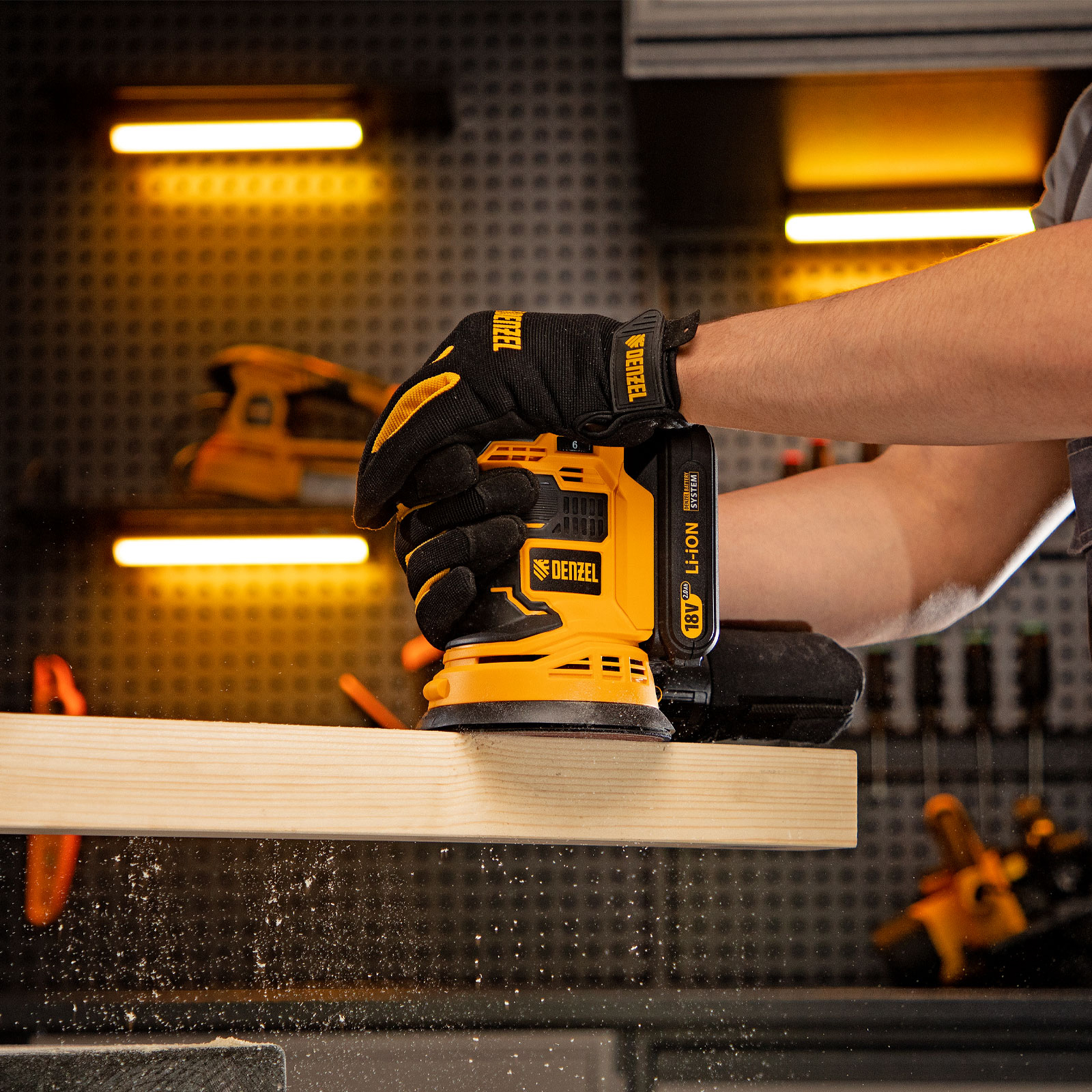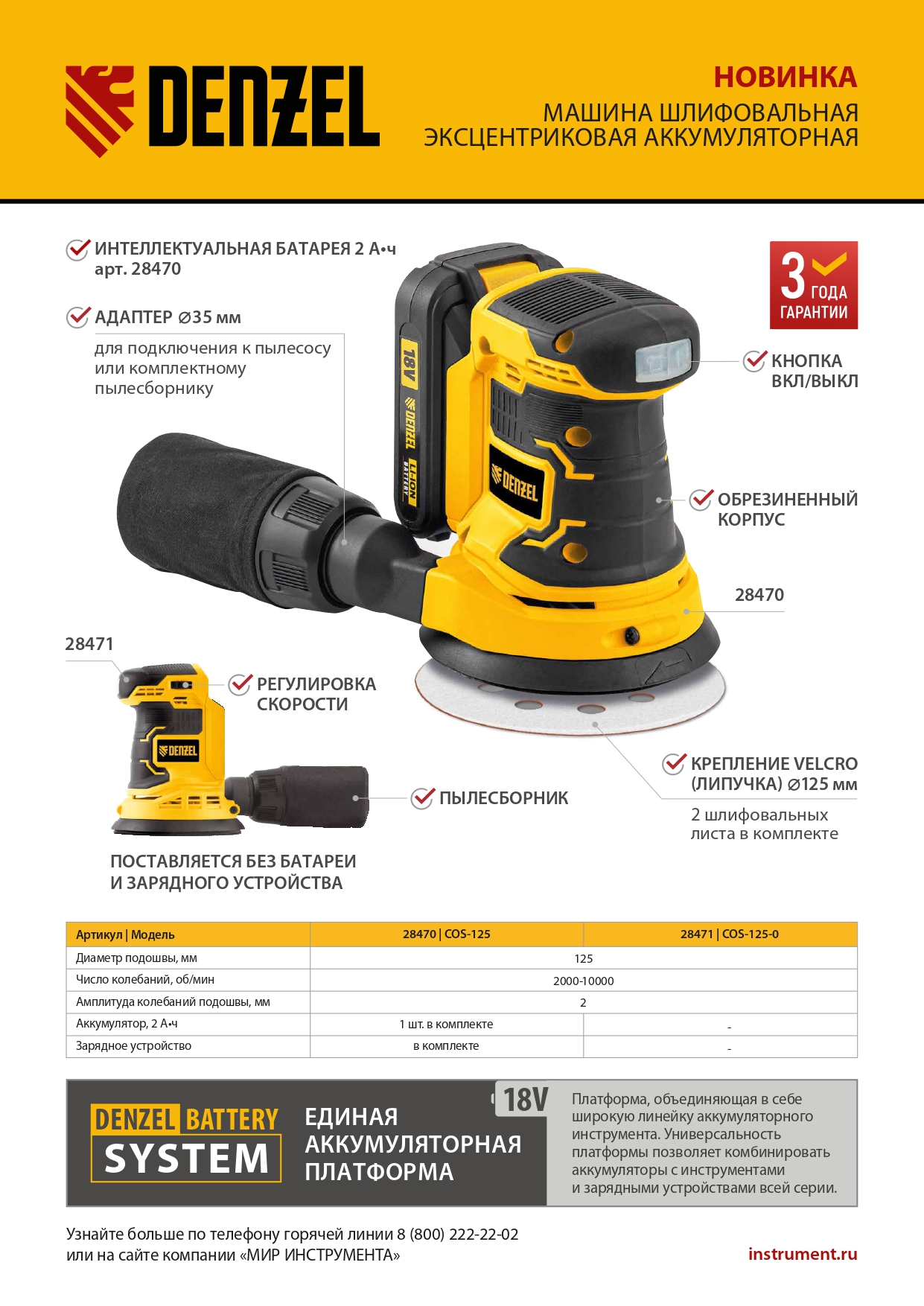 Аккумуляторная эксцентриковая шлифовальная машина Denzel COS-125 28471 работает от источника питания Li-Ion емкостью 2 А/ч, с рабочим напряжением 18 В. Предназначена для выполнения зачистных, шлифовальных и полировальных работ по древесине, металлу, пластику и камню. Применяется со шлифовальными и полировальными кругами диаметром 125 мм, скорость вращения составляет 2000-10000 об/мин., благодаря чему можно эффективно решать различные задачи.ПреимуществаАвтономность — шлифмашина не нуждается в подключении к розетке, что позволяет свободно перемещаться по рабочей зоне.Универсальность — к шлифовальной машине подходит аккумулятор 4Ач Li-ion, совместимый с любым инструментом 18V Denzel battery system серии IB (в комплект поставки не входит).Защита от перегрузки — при превышении допустимой нагрузки двигатель отключается для предотвращения поломки.Быстрая установка оснастки — благодаря креплению «velcro» шлифкруг фиксируется на подошве за несколько секунд.Гарантия 3 года — высокое качество шлифмашины подтверждено производителем.