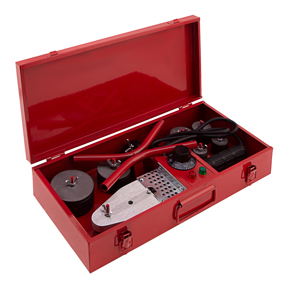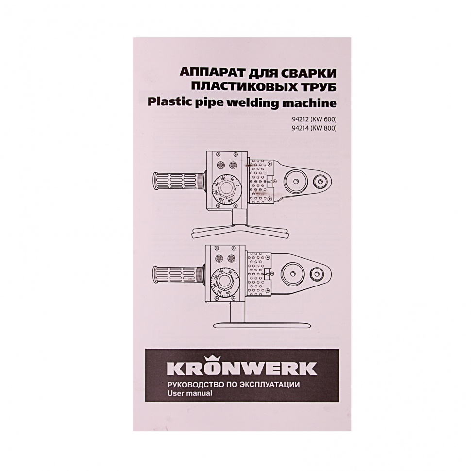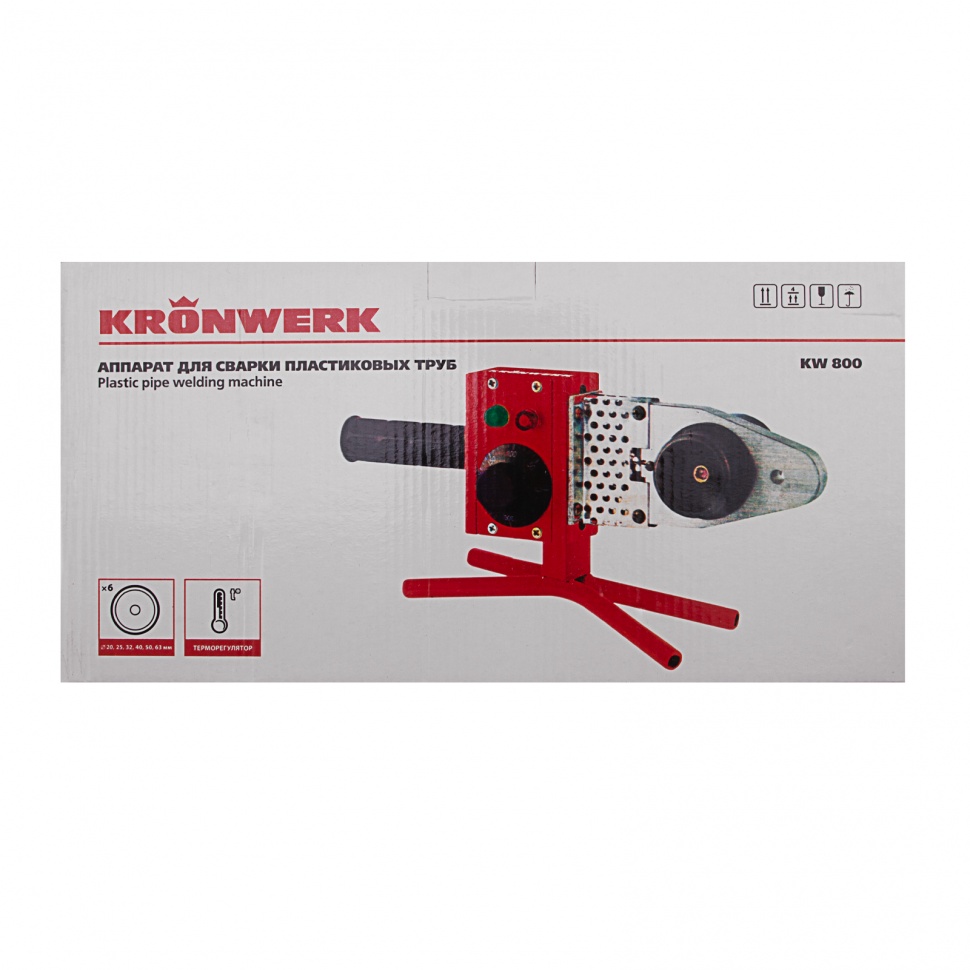 Аппарат для сварки пластиковых труб Kronwerk KW800 используется для муфтовой раструбной сварки при температуре до 300?. Он идеально подходит для разовых применений, обновления системы водопровода, монтажа канализационной и отопительной систем. Материал труб, с которыми работает аппарат - полипропилен и полиэтилен.Аппарат для сварки пластиковых труб выполнен в форме утюга. Он работает от сети 220 В и может применяться только в бытовых условиях. 6 насадок для пластиковых труб диаметром 20, 25, 32, 40, 50 и 60 мм прилагаются к аппарату.ПреимуществаПлавная регулировка рабочей температуры в диапазоне 50-300 °C обеспечивается поворотным переключателем с ребристой поверхностью.Индикаторы на корпусе аппарата помогают визуально отследить, включены ли нагреватели, защитив себя от получения ожогов.Благодаря наличию сменных насадок и шестигранного ключа не придется докупать расходники.Антипригарное покрытие на насадках предотвращает прилипание пластика и их поломку.Металлическая подставка с 4-мя опорами обеспечивает устойчивое положение паяльника на рабочей поверхности в перерывах между сваркой.Ручка аппарата имеет прорезиненное рельефное покрытие, что обеспечивает удобный захват.Прочный металлический кейс с крепежами для аппарата и каждой насадки обеспечивает безопасную транспортировку и удобное хранение.