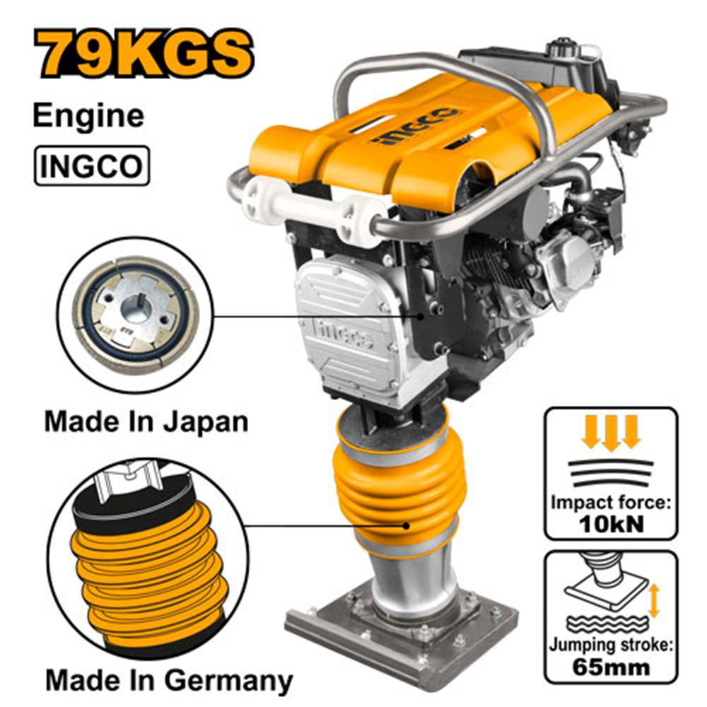 Вибротрамбовка INGCO GRT75-2 представляет собой мощное универсальное оборудование, которое служит для уплотнения асфальта, песка и грунтов.