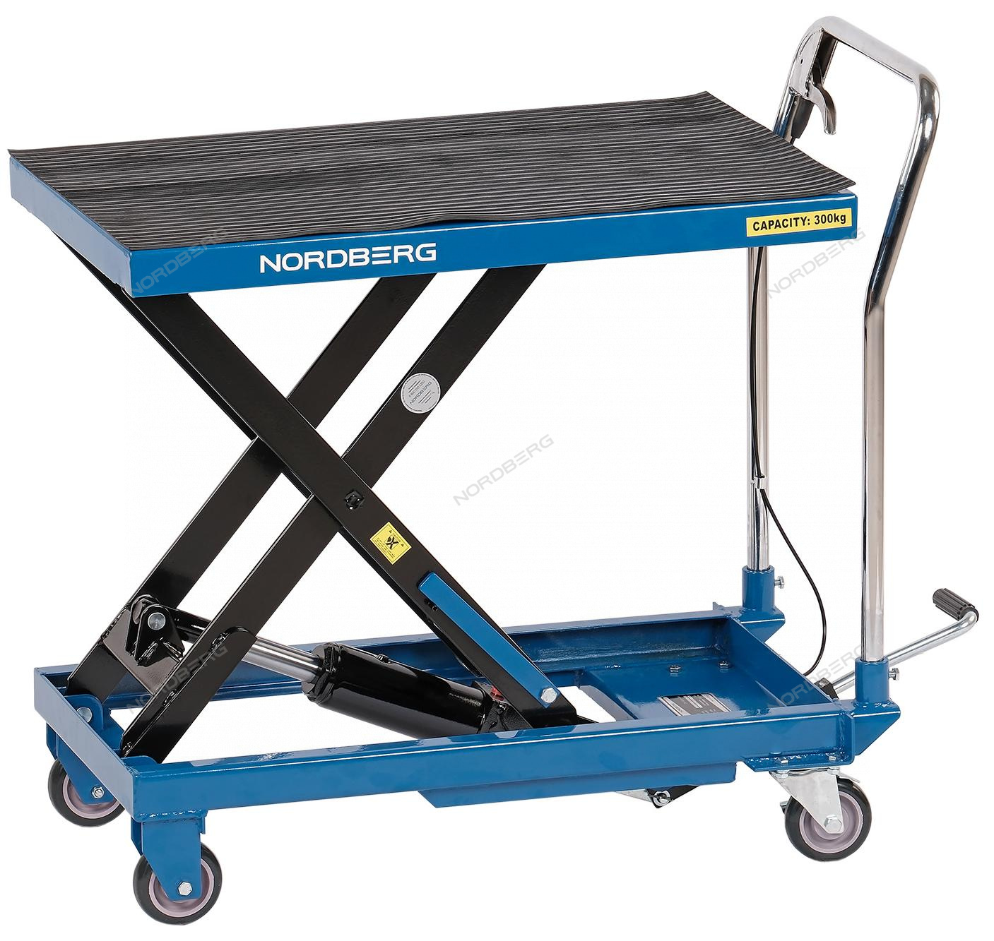 Подъемный гидравлический стол NORDBERG N3T300 предназначен для подъема, опускания и перемещения груза. Конструкция представляет собой совмещение платформенной тележки и стационарного подъемного стола. Подъемный стол имеет гидравлический ножной привод, который позволяет произвести быстрый подъем груза. Опускание производится путем нажатия рычага на ручке подъемного стола. Гидравлическая система позволяет столу опускаться плавно, обеспечивая безопасность работ с грузами. Стол позволяет не только приподнимать грузы, но и перемещать их на расстояния.