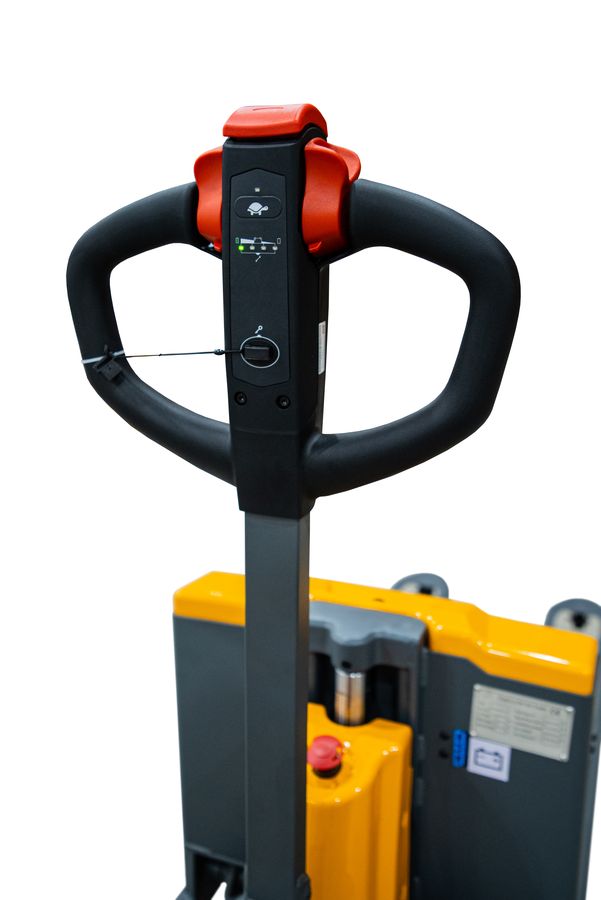 - На мультифункциональной рукояти расположены клавиши подъема/опускания вил, движения вперед- назад, кнопка автоматического реверса, электрический замок и информационный дисплей. Управление абсолютно всем функционалом возможно при помощи рукояти.